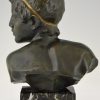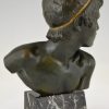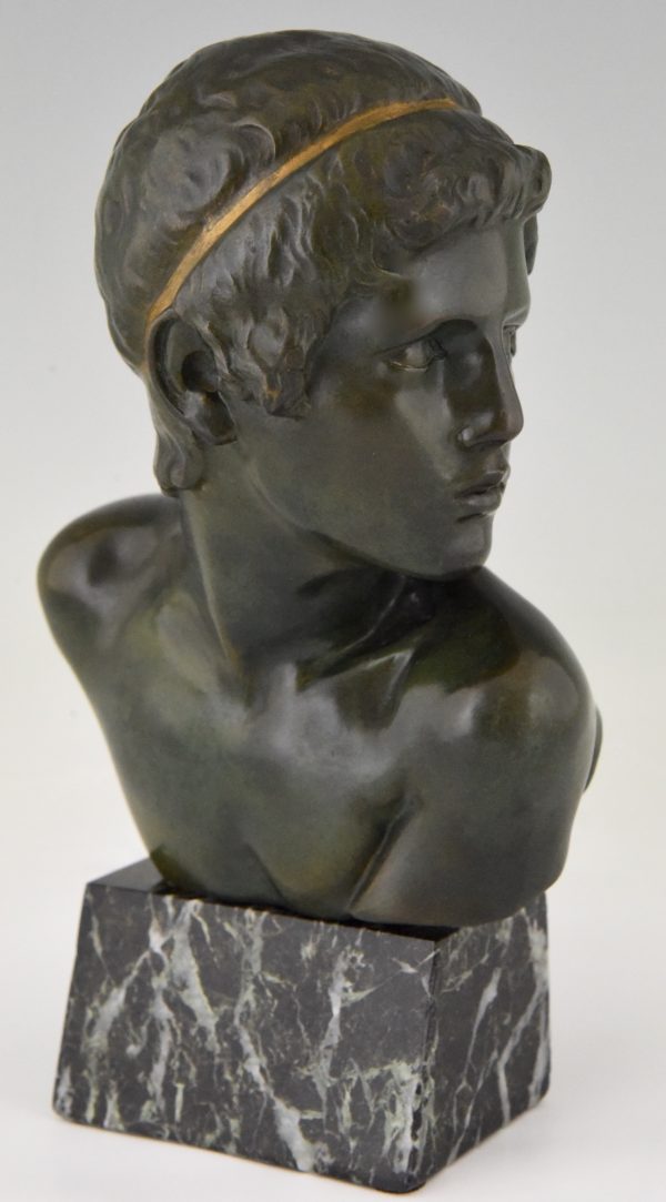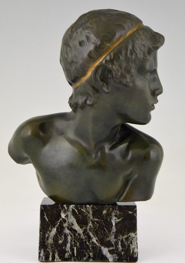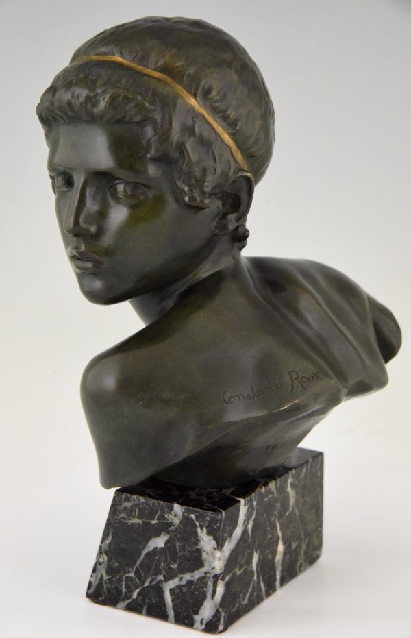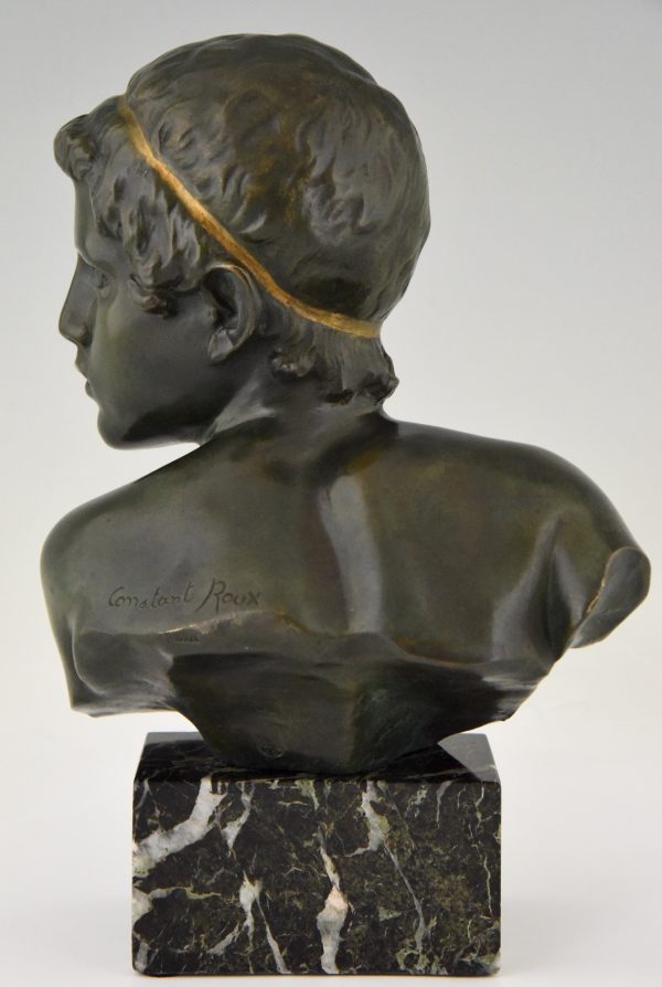Lovely Art Deco bronze bust of a young boy, picturing Achilles as a child by the French sculptor Constant Roux. The bronze has a dark green patina with gilt accent. The sculpture is mounted on a green marble base. France 1920. Signed and Foundry mark Les Neveux de Lehmann.