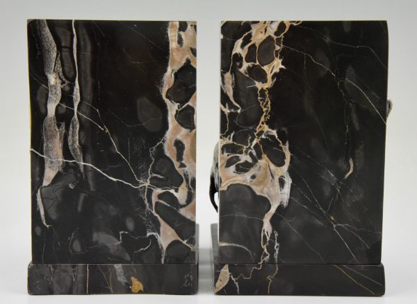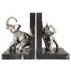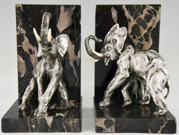 Art Deco bronze elephant bookends with silver patina on portor marble base.