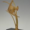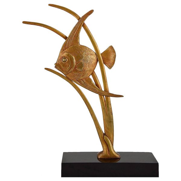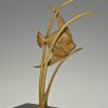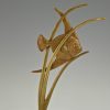 Art Deco gilt bronze sculpture of a fish and waterplants on a black marble base signed by the French artist De Roche.