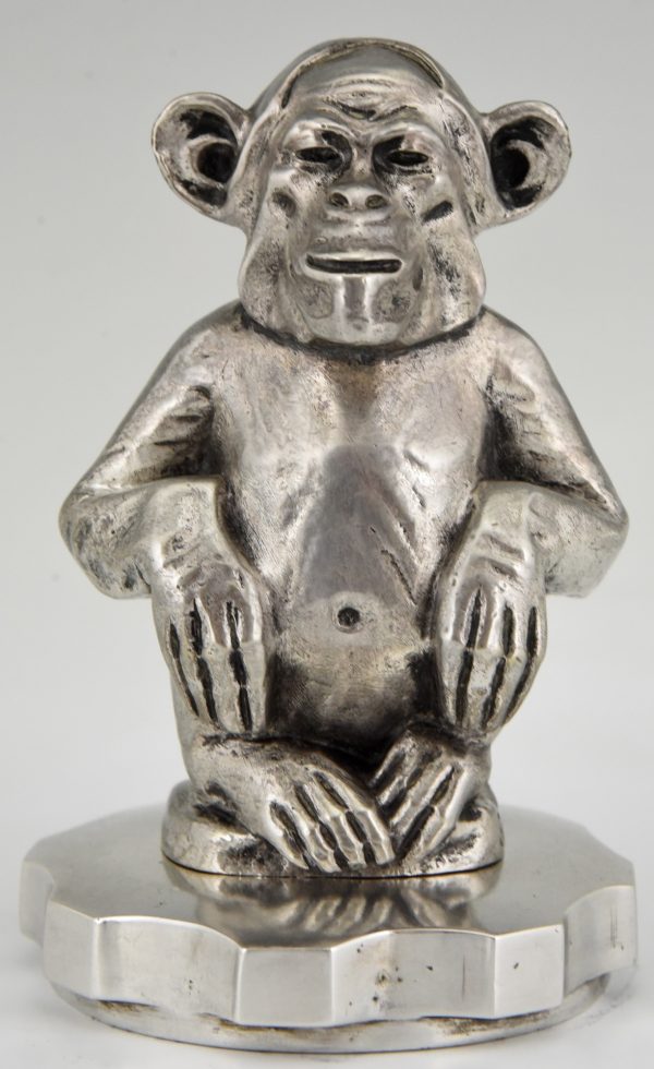 Art Deco bronze sculpture, car mascot sitting Chimpanzee monkey.
