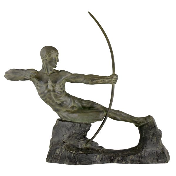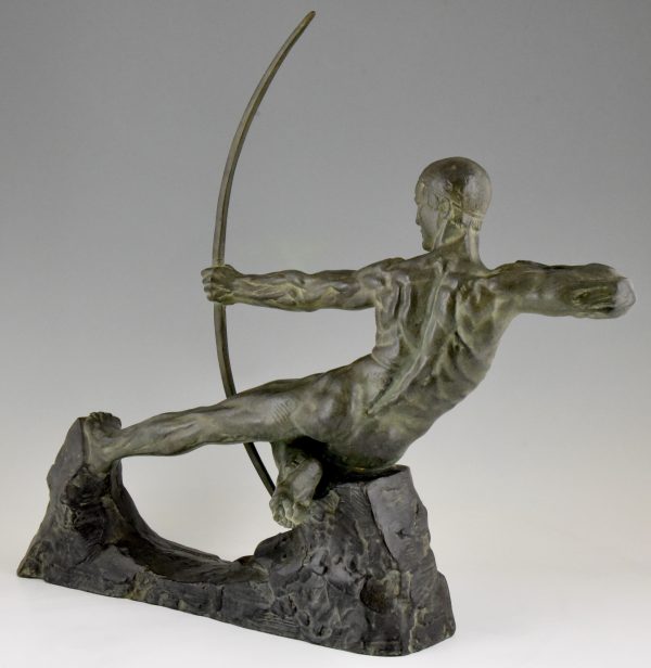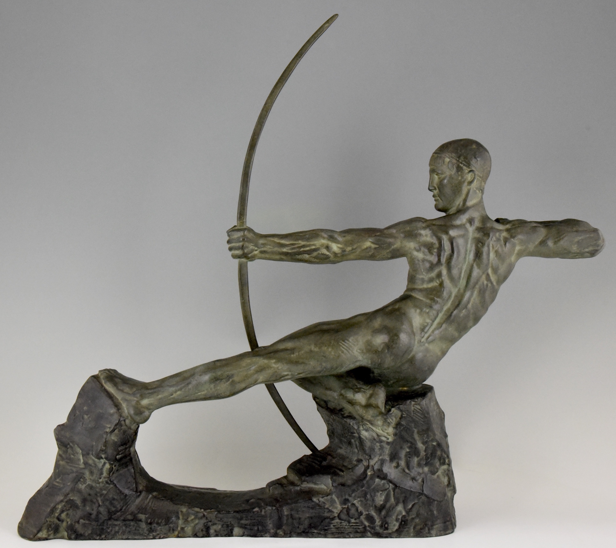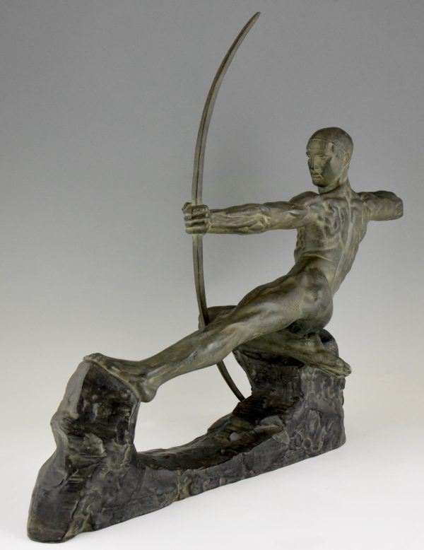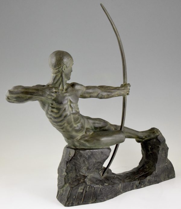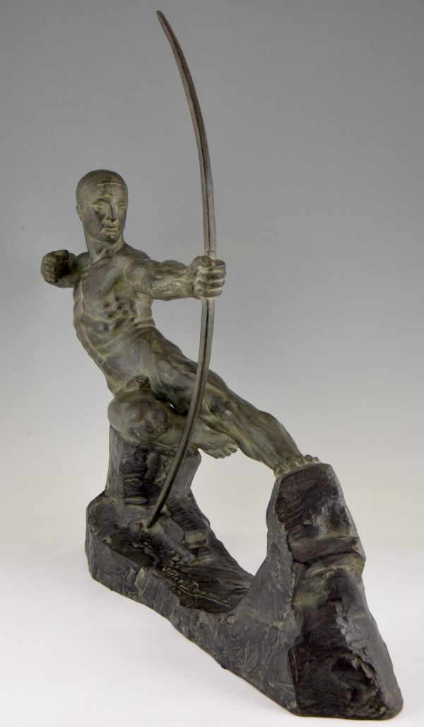 Beautiful Art Deco bronze sculpture of a male nude with bow. The title of this work is Hercules. Signed by Victor Demanet, a famous French artist. The bronze has a lovely green patina, ca. 1925.