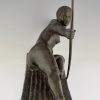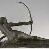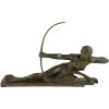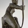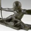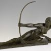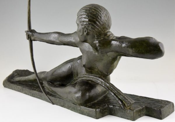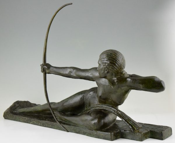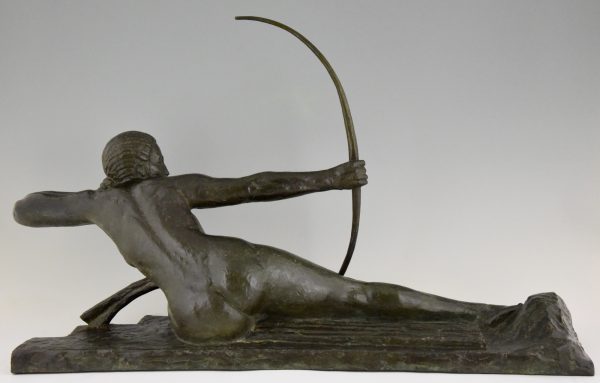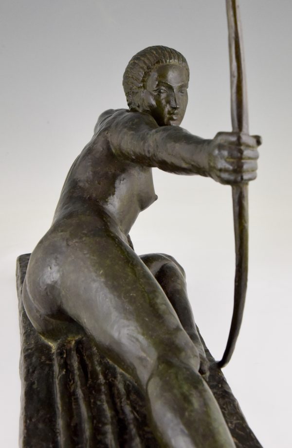 Impressive Art Deco bronze sculpture of a nude with bow picturing Penthesilia, queen of the Amazons. Signed by the famous French sculptor Marcel André Bouraine 1886-1948. Beautiful dark green patina.