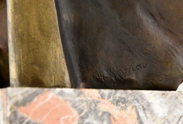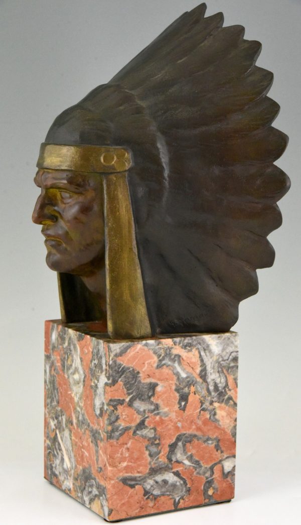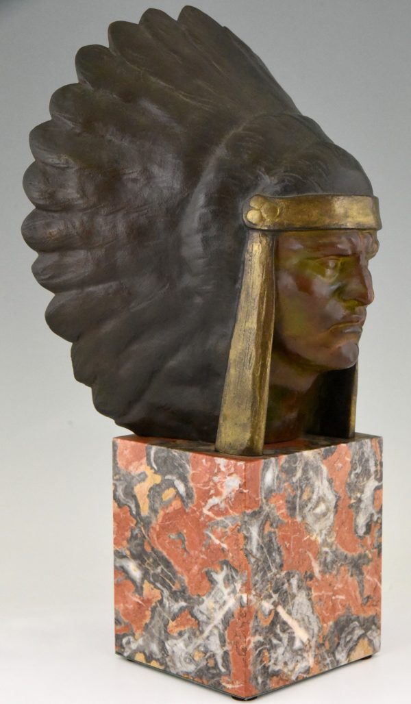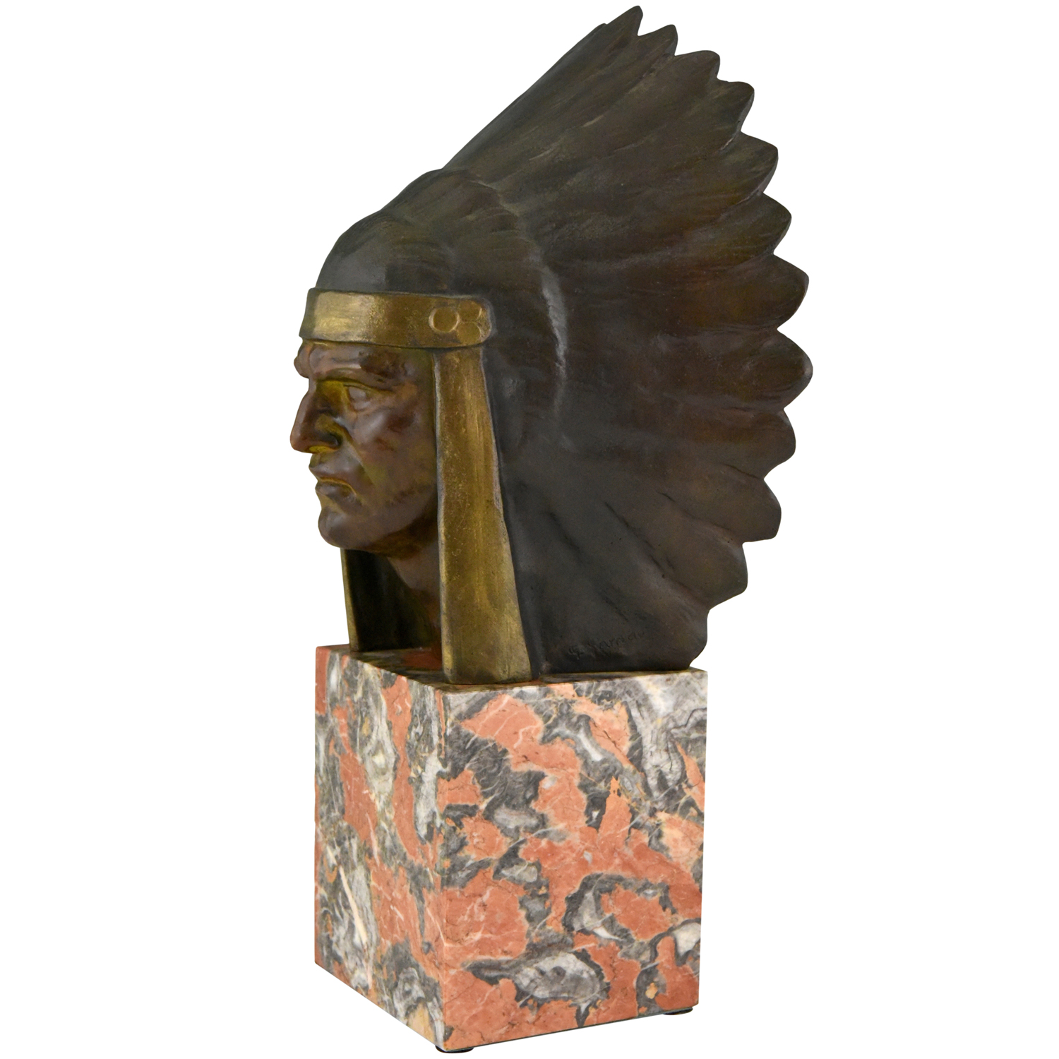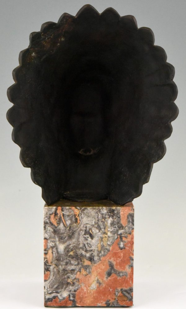 Impressive Art Deco bronze bust of an Indian with headdress by the French artist Georges Garreau. The sculpture has a beautiful multi color patina and stands on a marble base. Ca. 1930