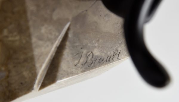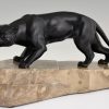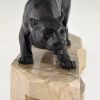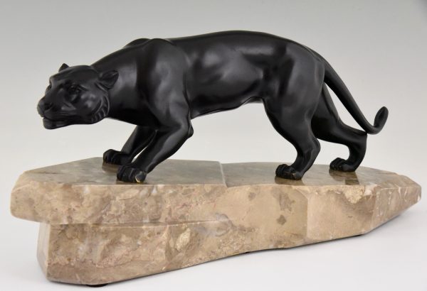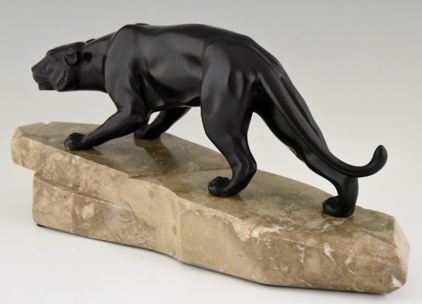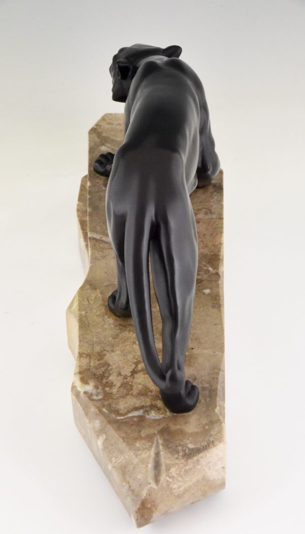 Typical Art deco panther sculpture in patinated bronze on a marble base. The work is signed by J. Brault, cast in France ca. 1930.