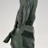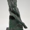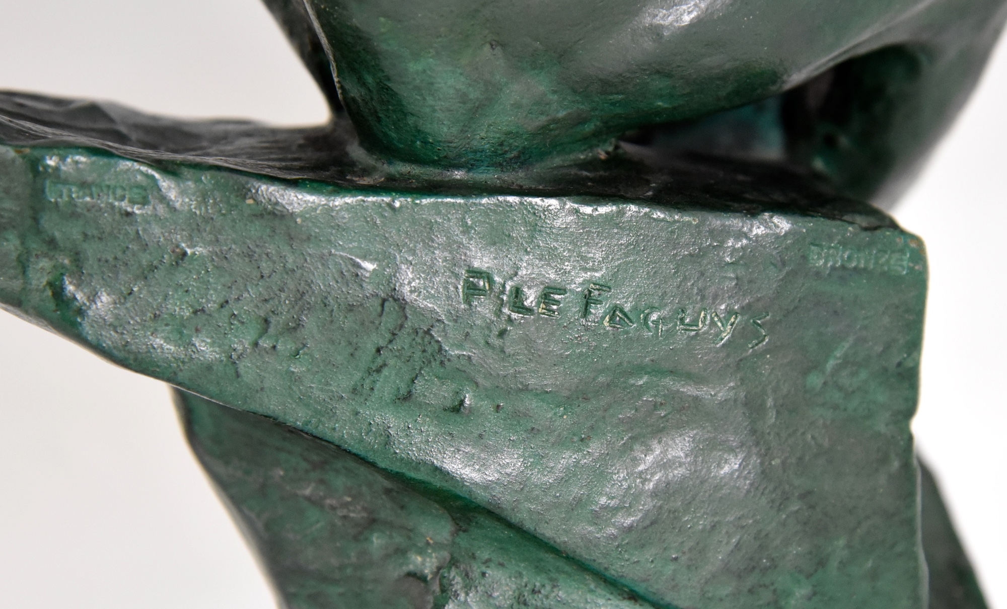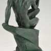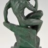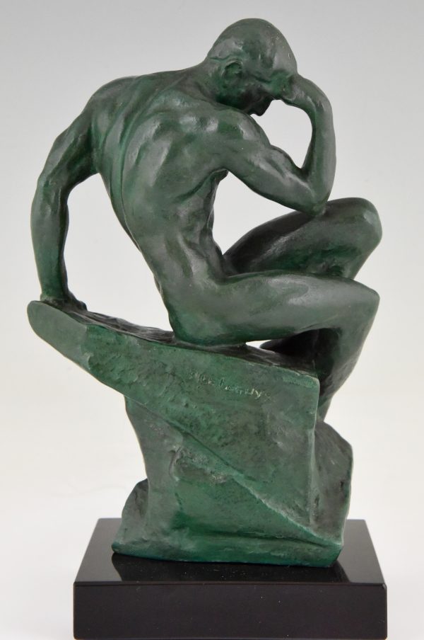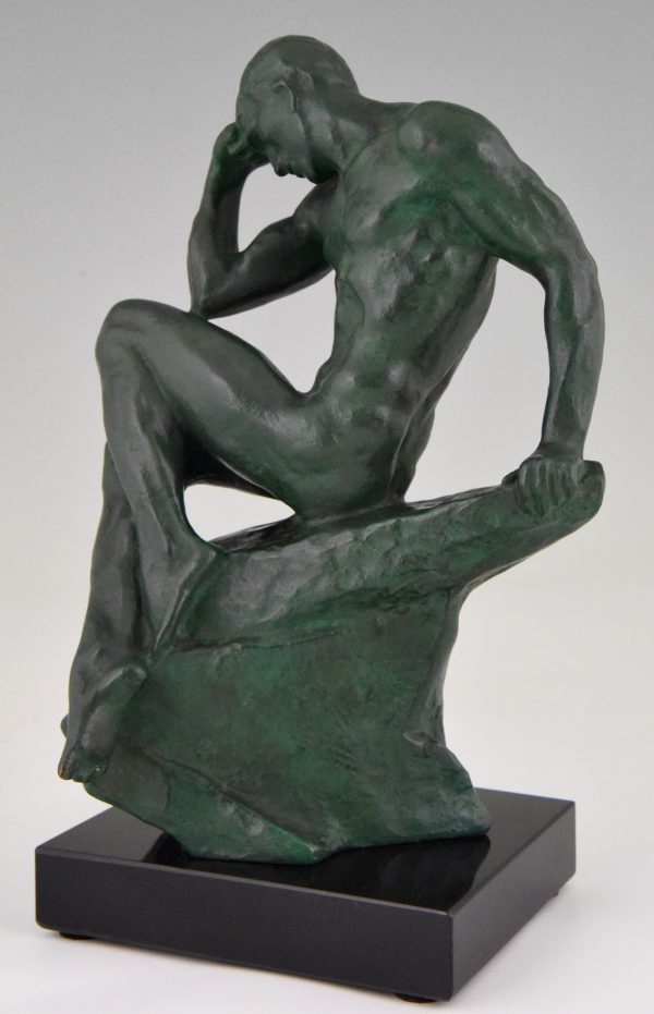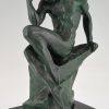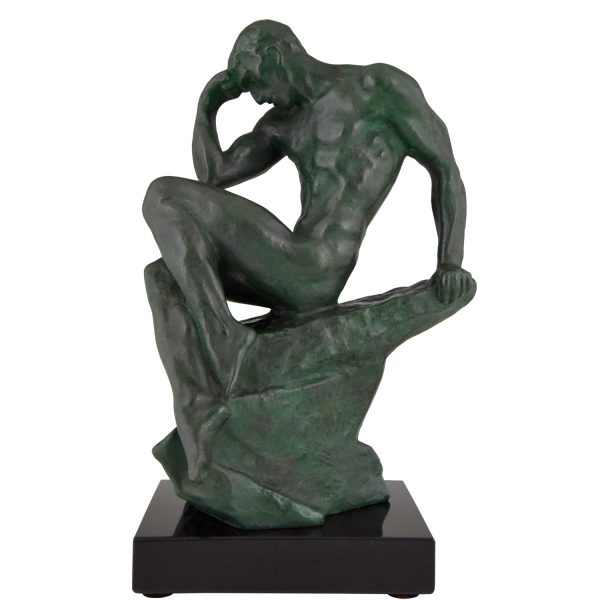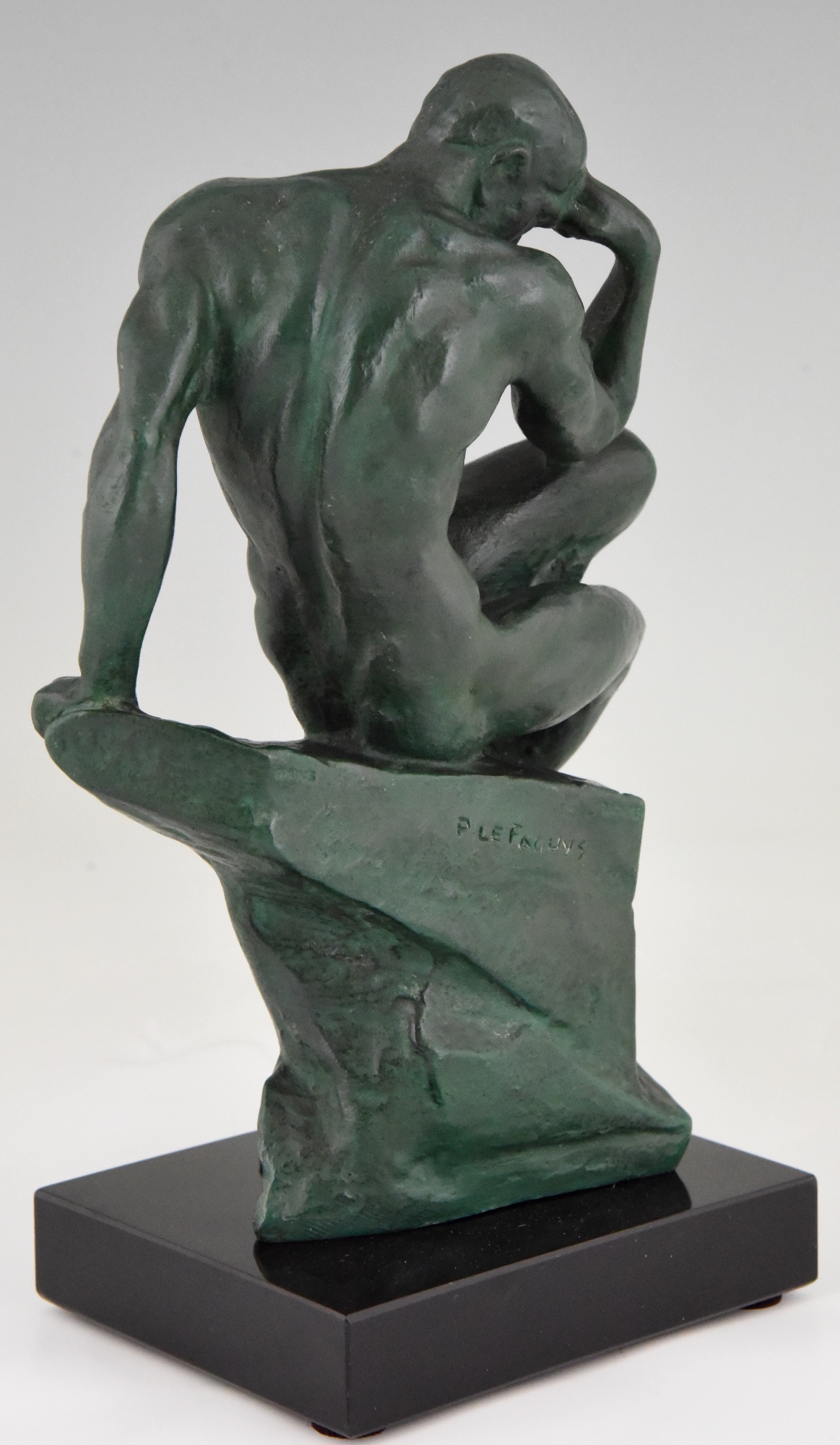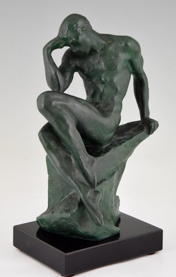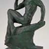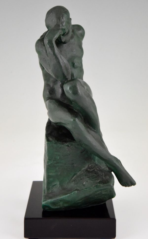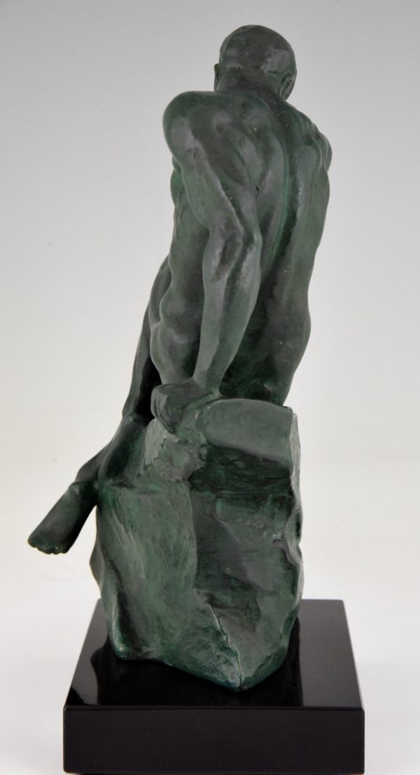 Art Deco bronze sculpture sitting male nude by the famous French artist Pierre Le Faguays. The bronze has a beautiful green patina and is mounted on a black marble base. ca. 1930
