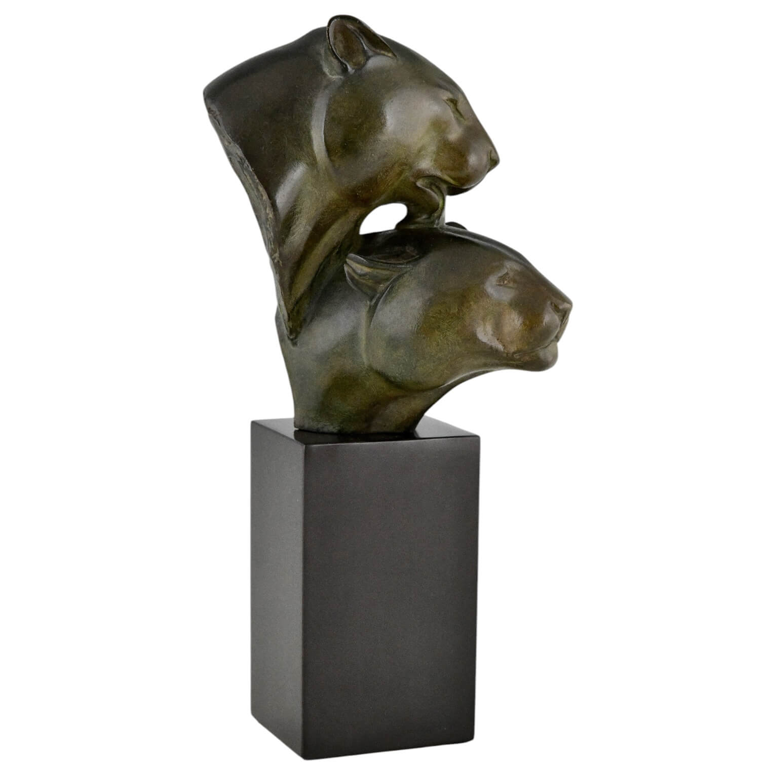 Art Deco bronze sculpture two panther heads by Irenee Rochard, France 1930.