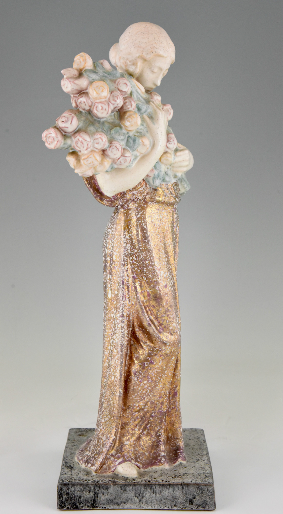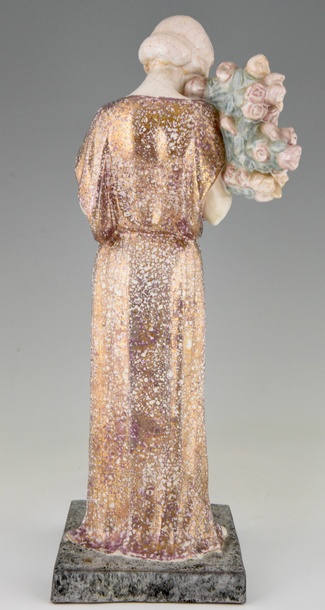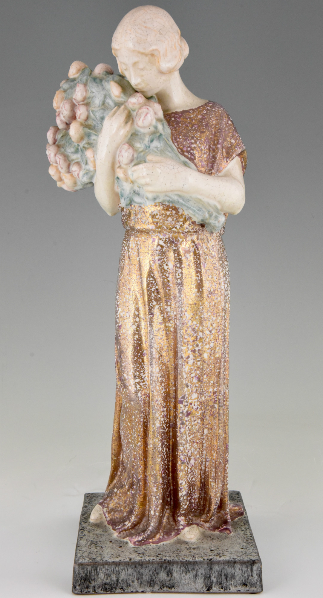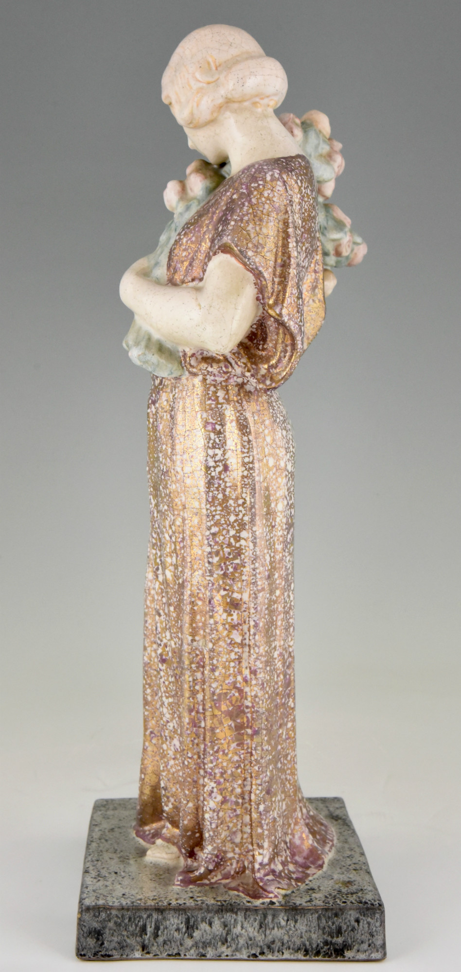 Beautiful glazed ceramic Art Deco sculpture of a standing woman in a long dress holding a bouquet of flowers.