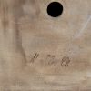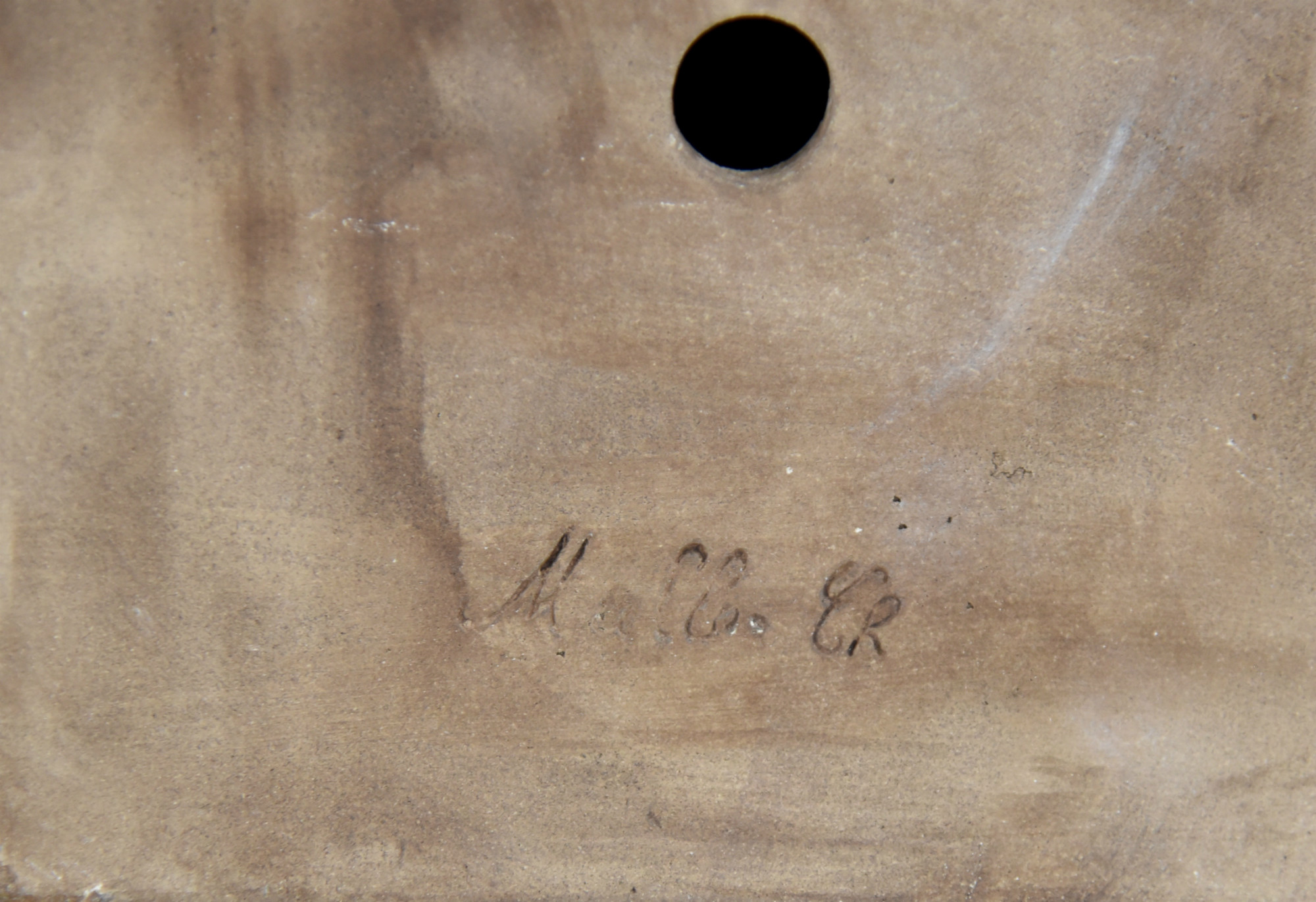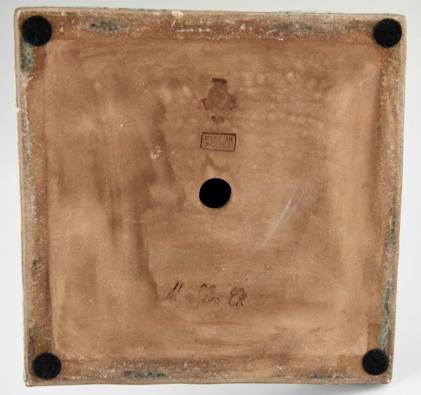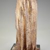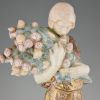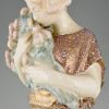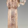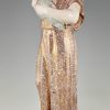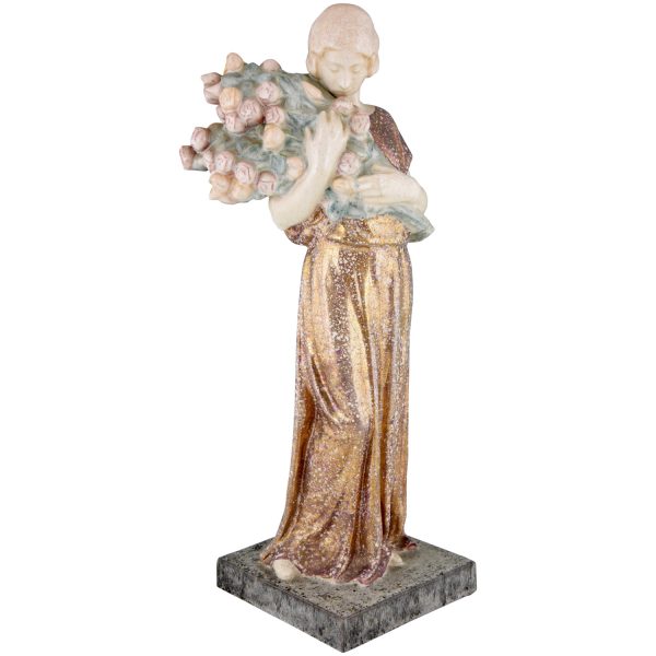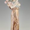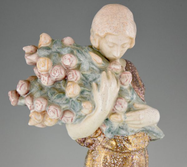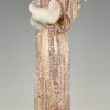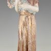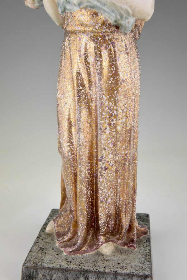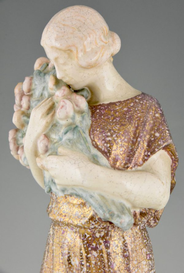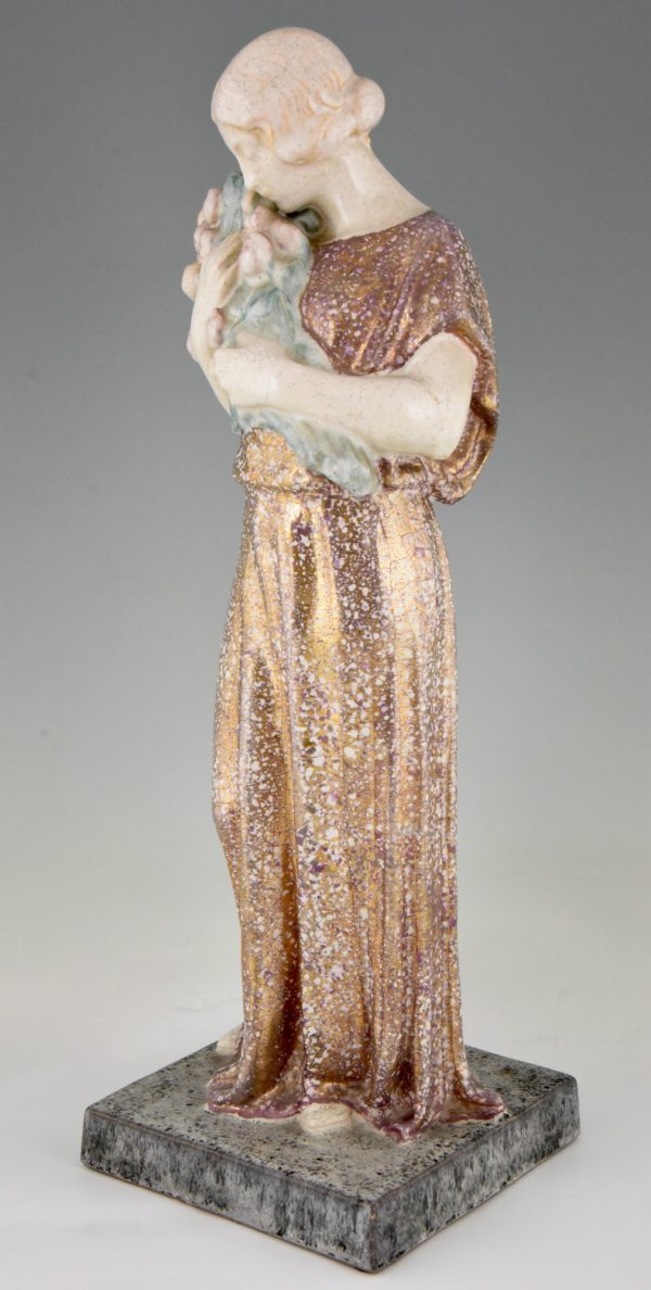 Beautiful glazed ceramic Art Deco sculpture of a standing woman in a long dress holding a bouquet of flowers.