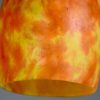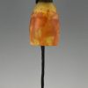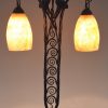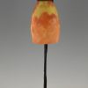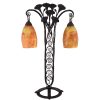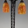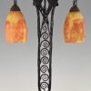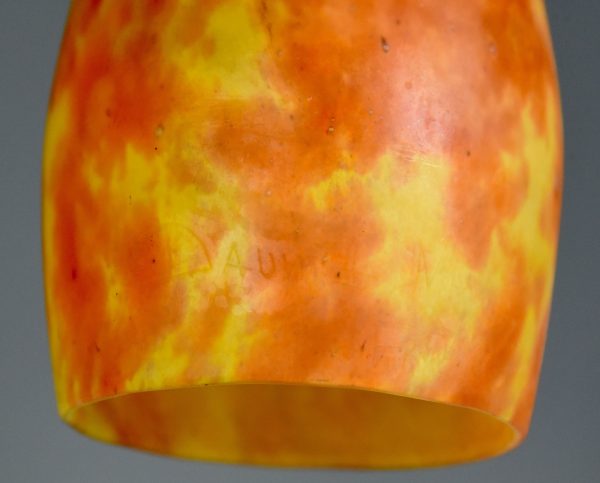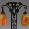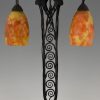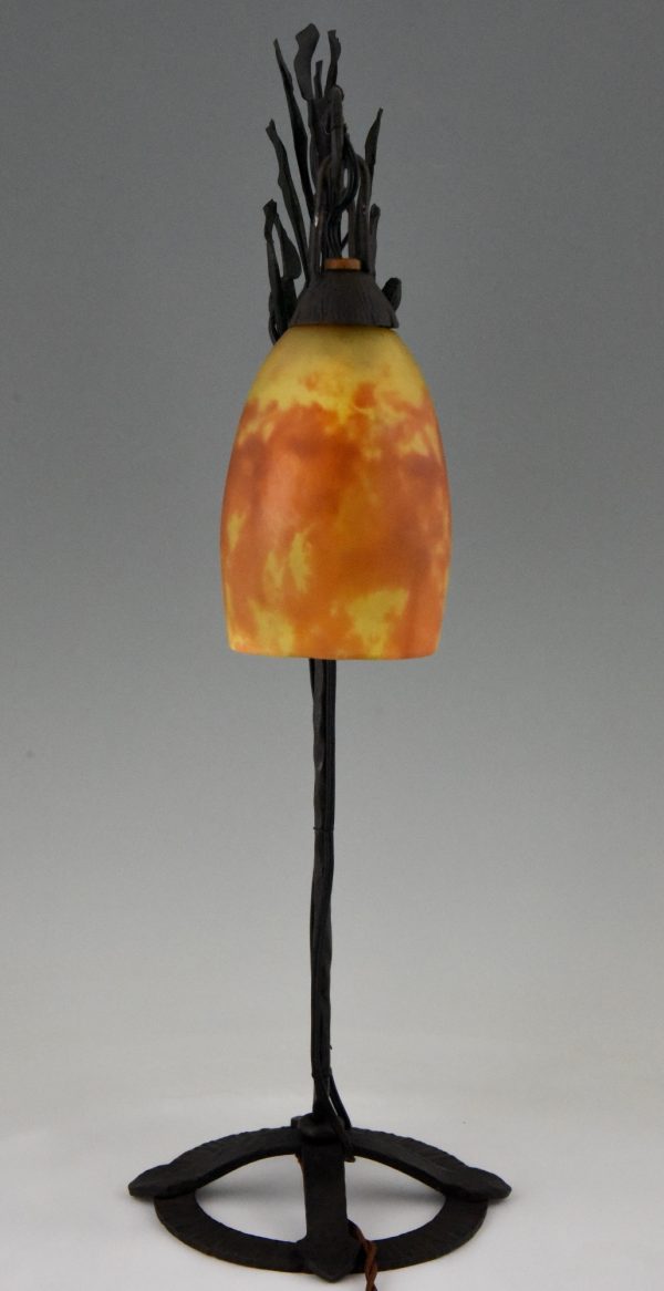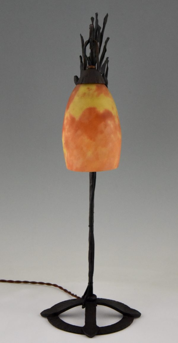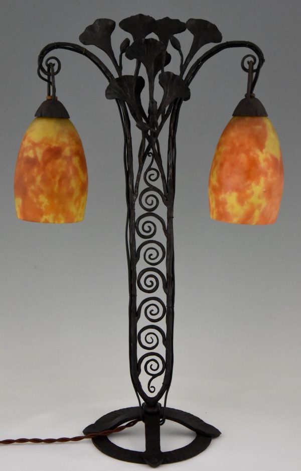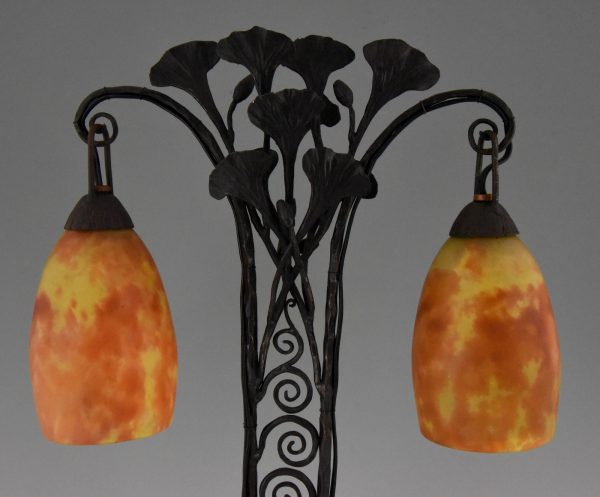 Beautiful Art Deco table lamp with two Daum glass shades in orange and yellow tones. Signed on the glass. The base is in wrought iron and decorated with leaves. France 1925.