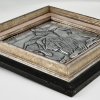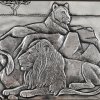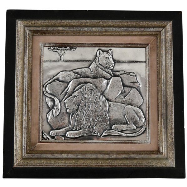 Sterling silver in wooden frame. Male and female lion in a landscape.