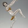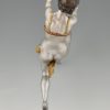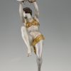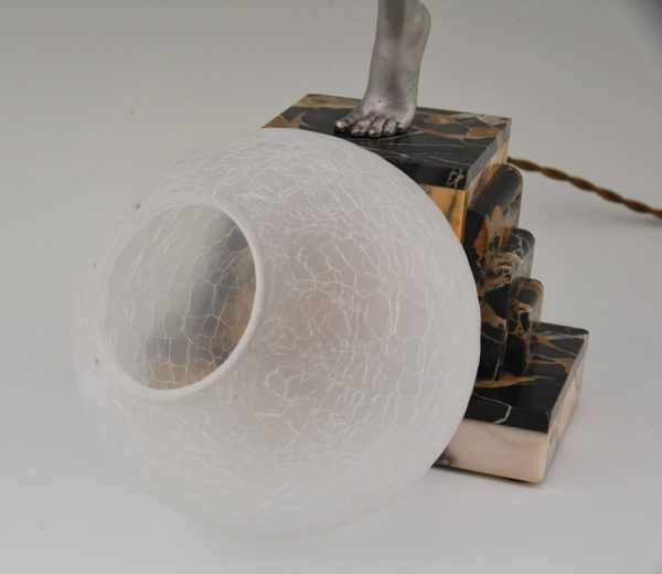 Impressive Art Deco lamp nude lady holding a ball signed by the French sculptor Emile Carlier. The white metal figure has a lovely silver and gold patina and stands on a fine marble base.