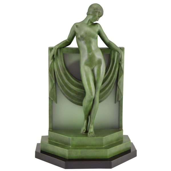 Sérénité, Art Deco lamp sculpture in the shape of a standing nude with scarf signed Fayral, pseudonym of Pierre Le Faguays.