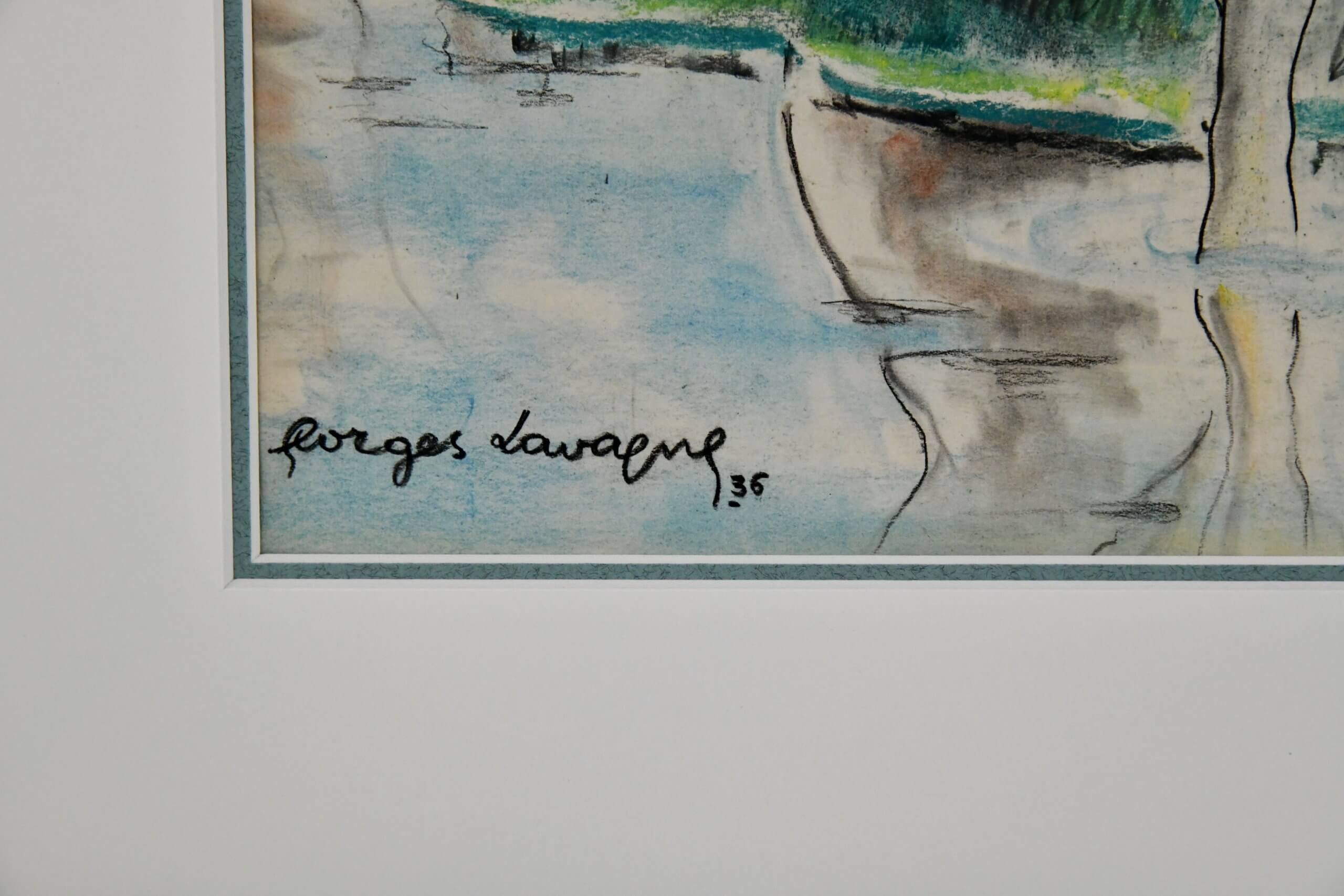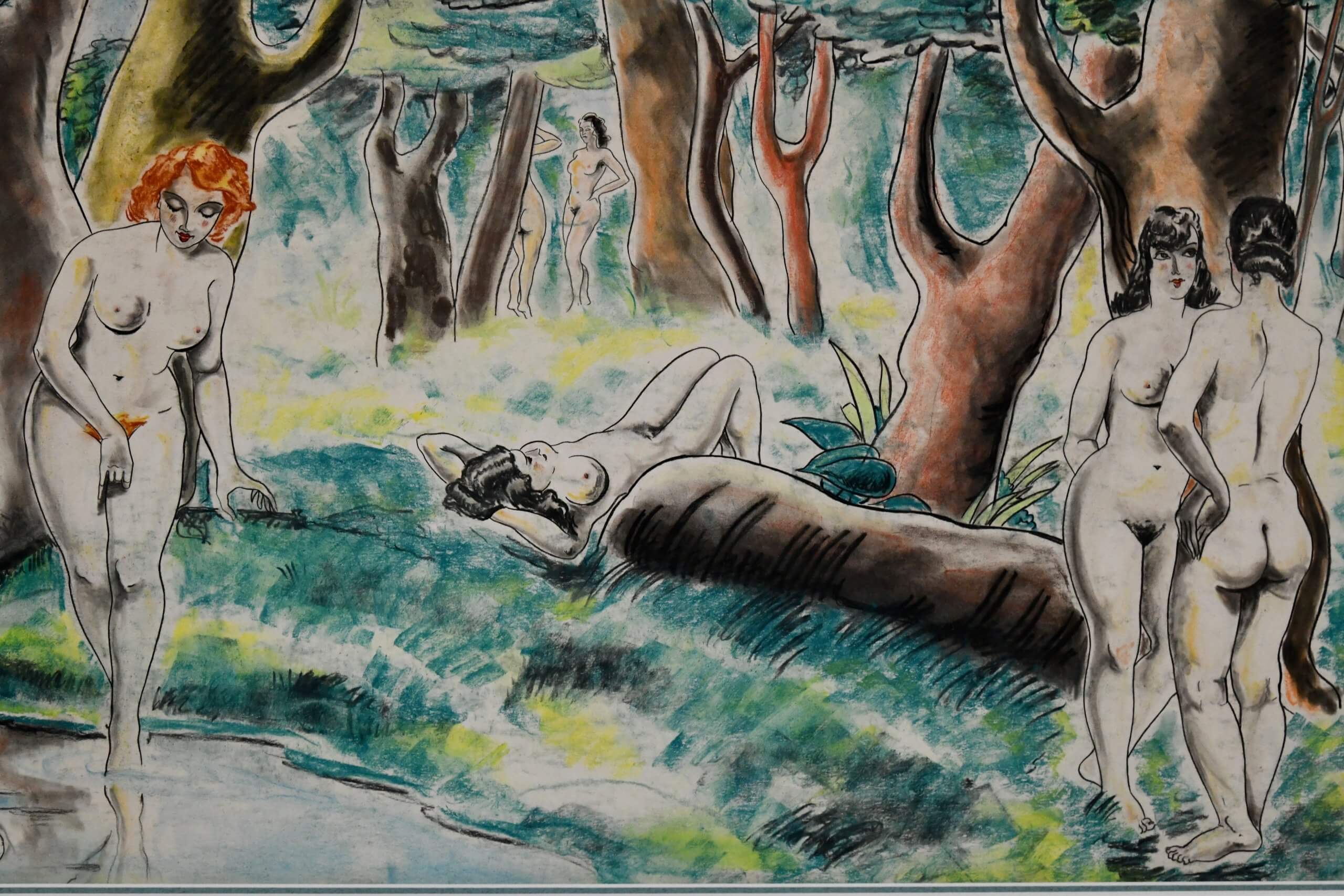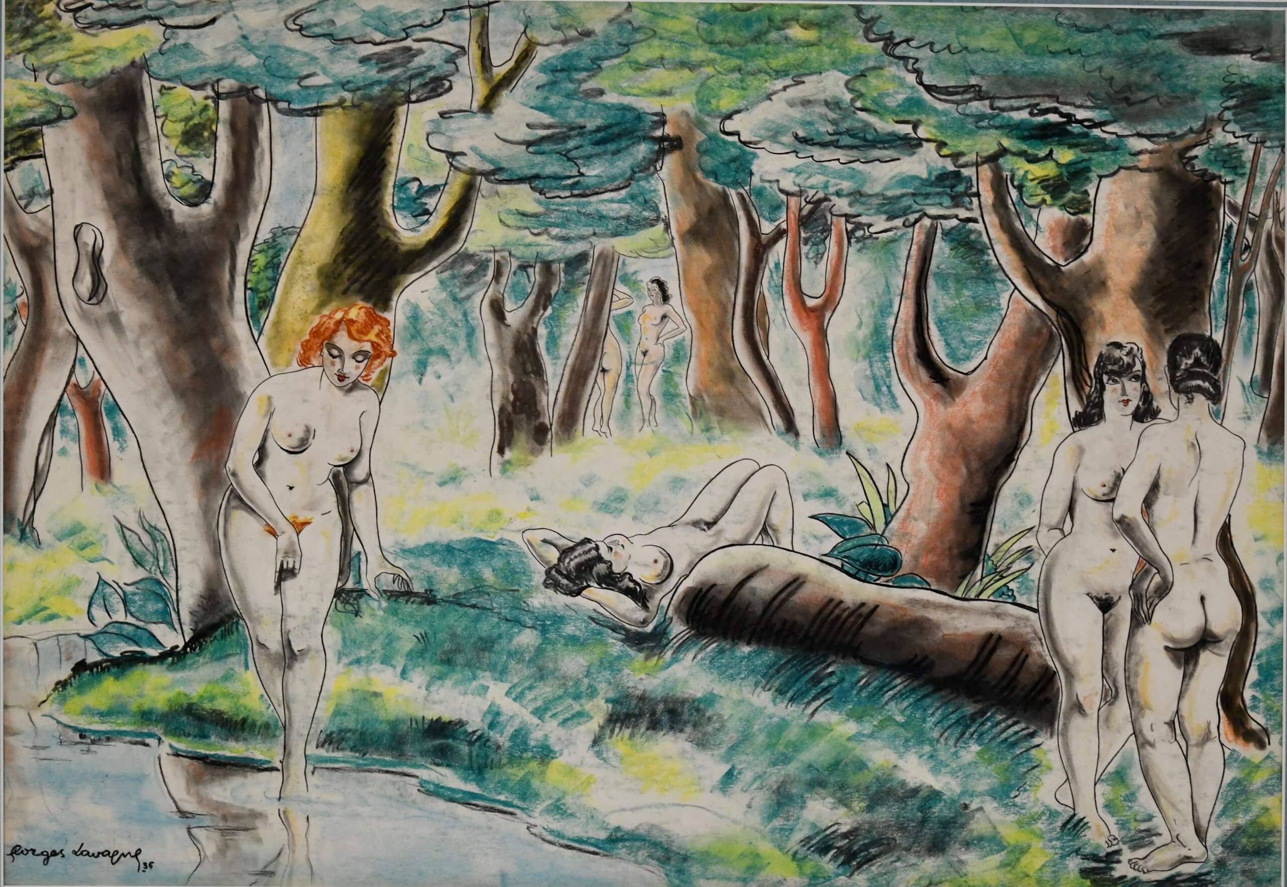 Art Deco pastel painting nudes in a landscape by Georges Lavergne.