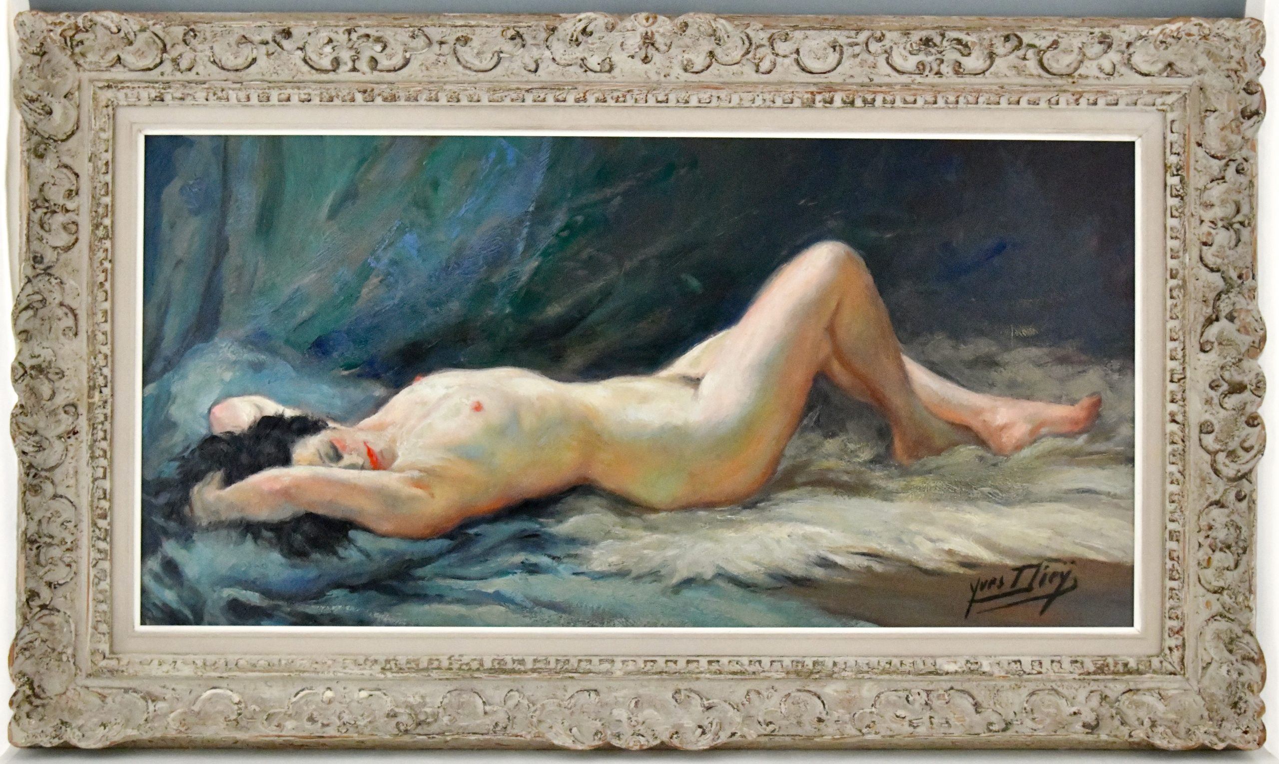 Art Deco painting of a reclining nude by Yves Diey, born in Paris in 1892 with original frame. France ca. 1930.