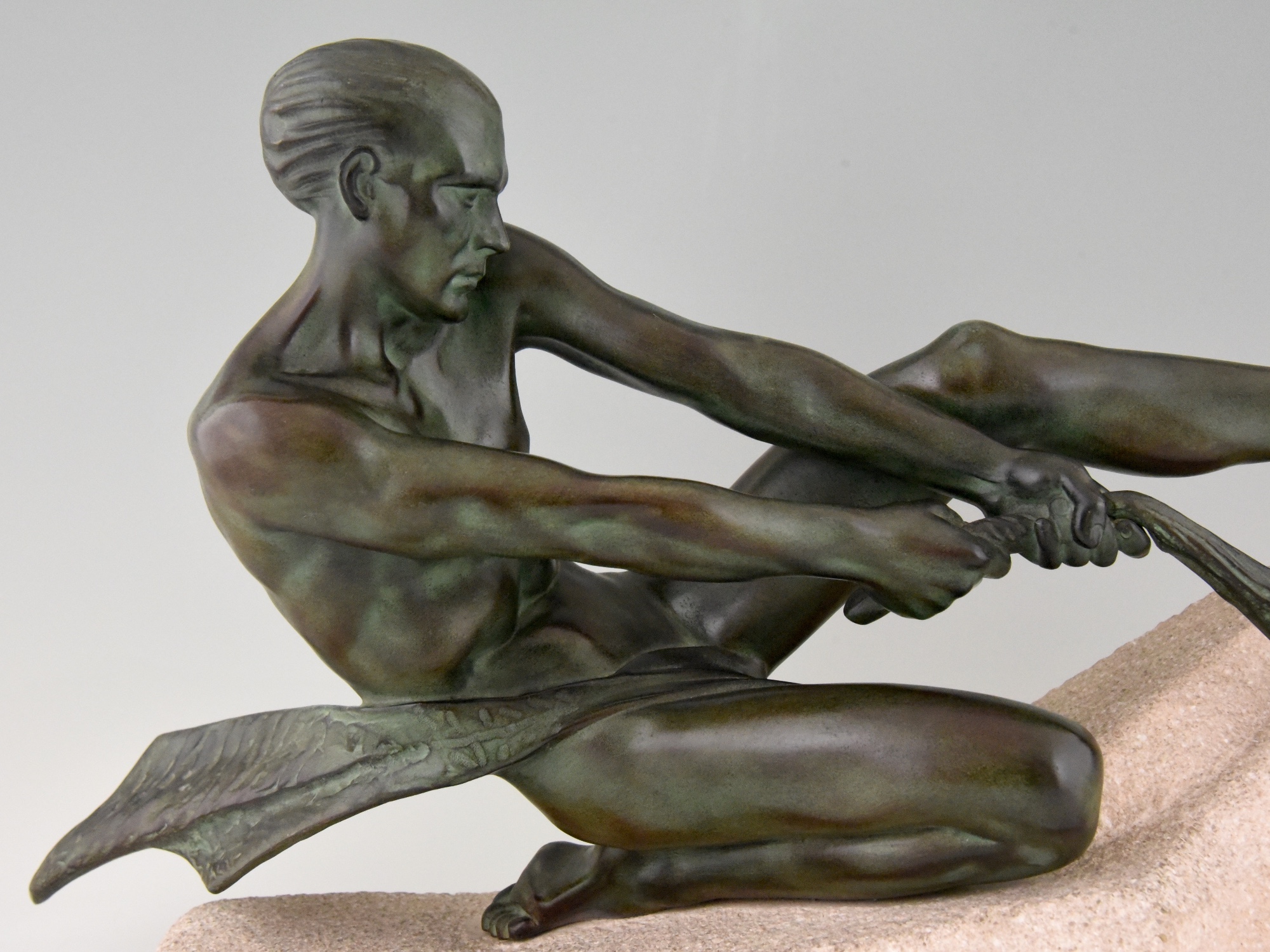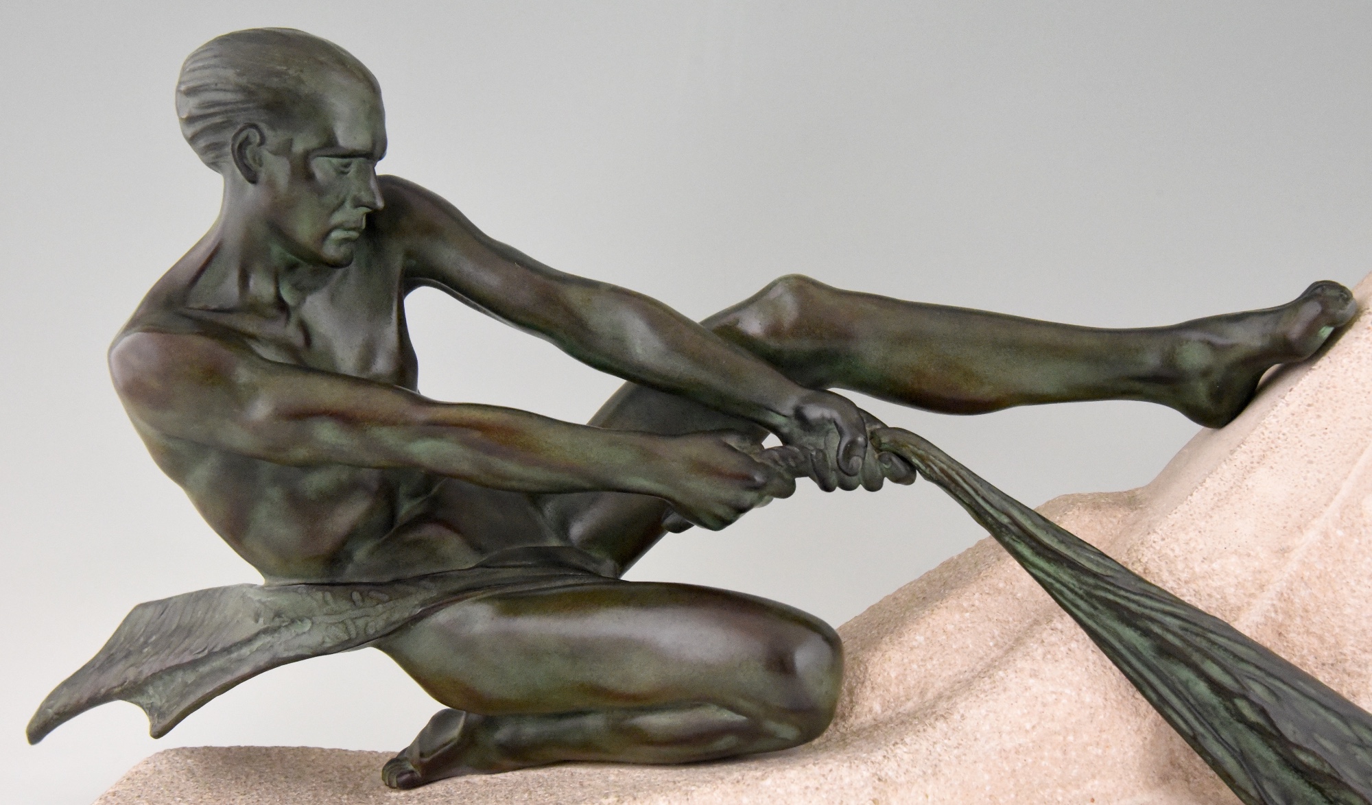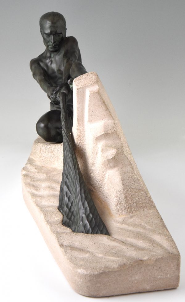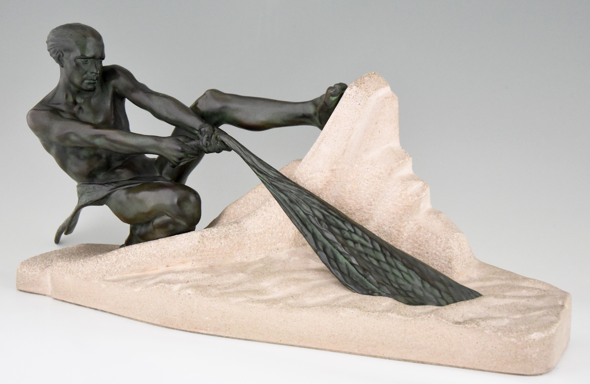 Strong Art Deco sculpture of an athletic fisherman pulling a net by the famous French sculptor Max Le Verrier. The sculpture has a lovely green patina, is signed and stands on a carved stone base. France ca. 1930