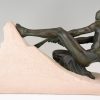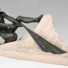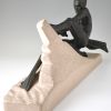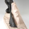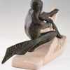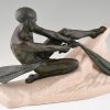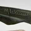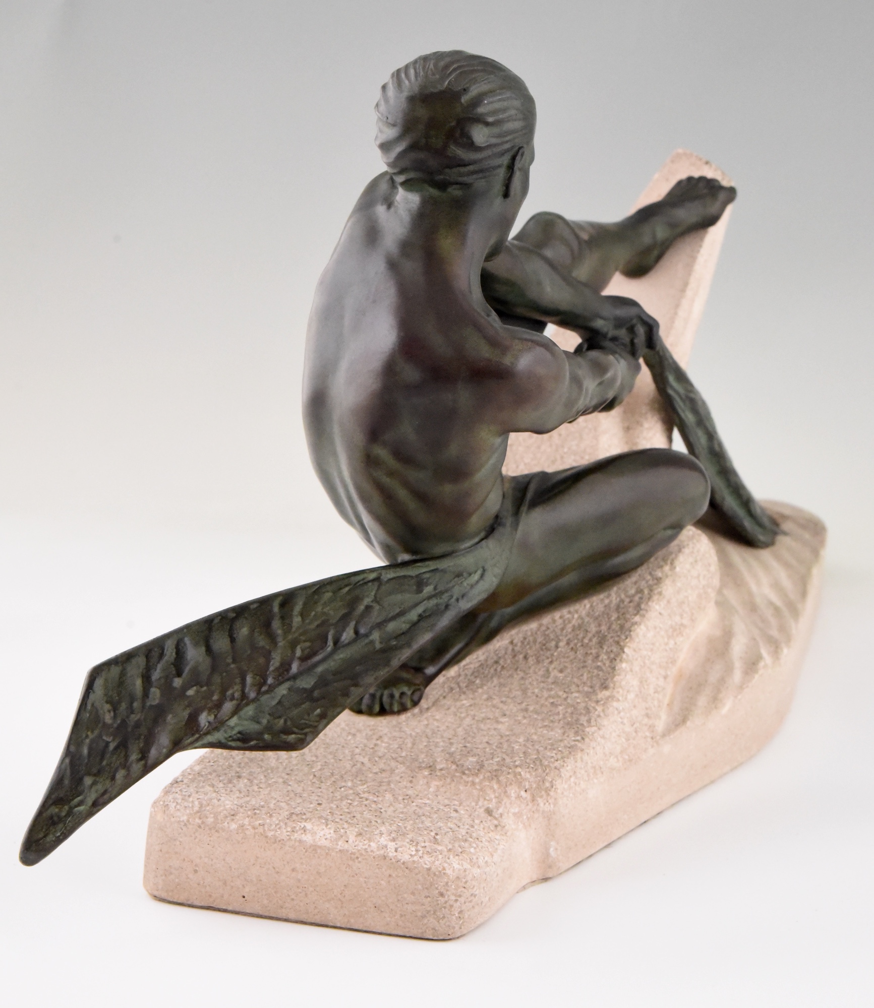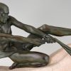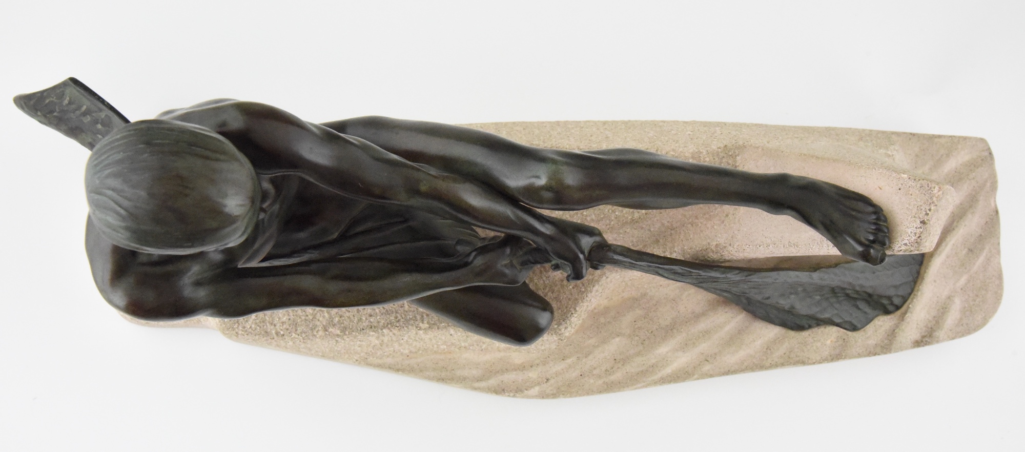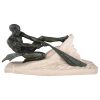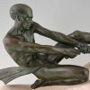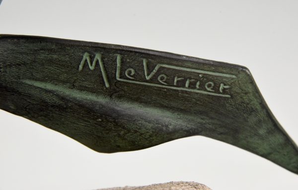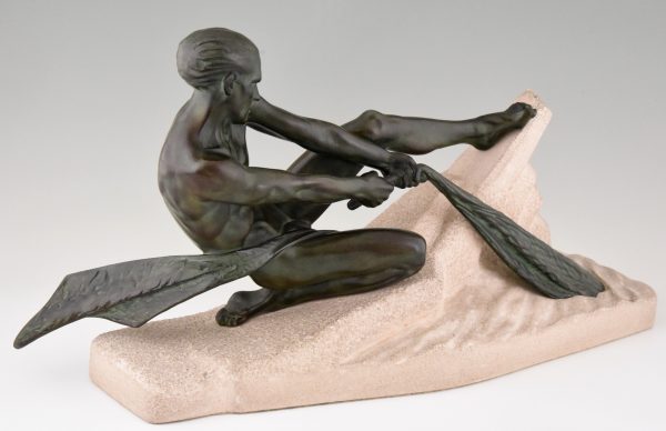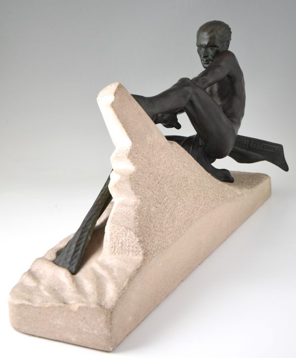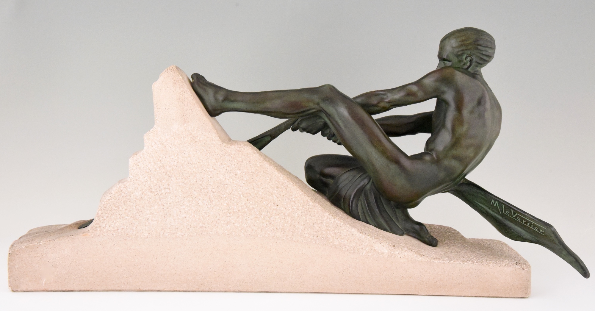 Strong Art Deco sculpture of an athletic fisherman pulling a net by the famous French sculptor Max Le Verrier. The sculpture has a lovely green patina, is signed and stands on a carved stone base. France ca. 1930