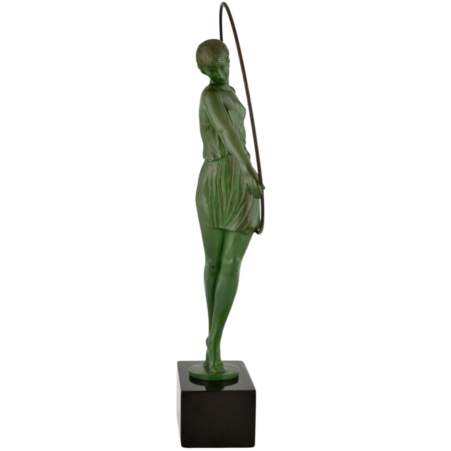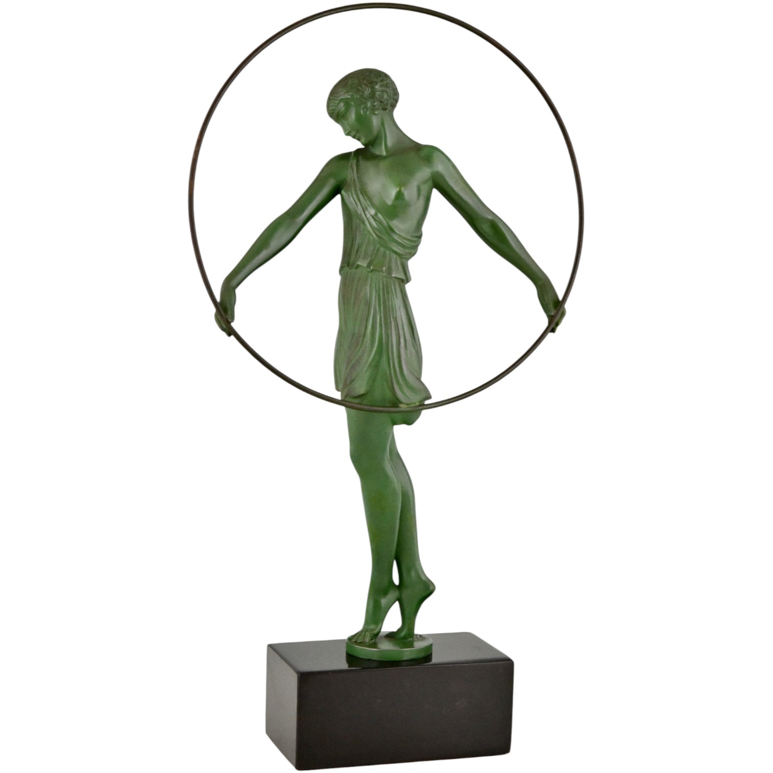 Crafted in art metal with a characteristic green patina, the figure rests on a luxurious Belgian black marble base. A perfect blend of rhythm, elegance and feminine form, this piece exemplifies the best of the Art Deco style.