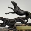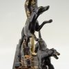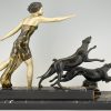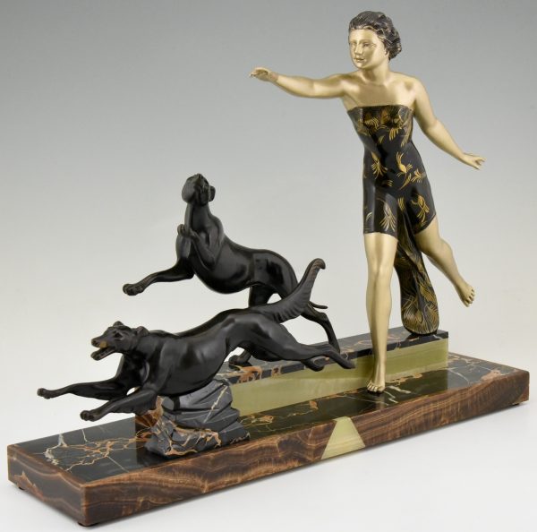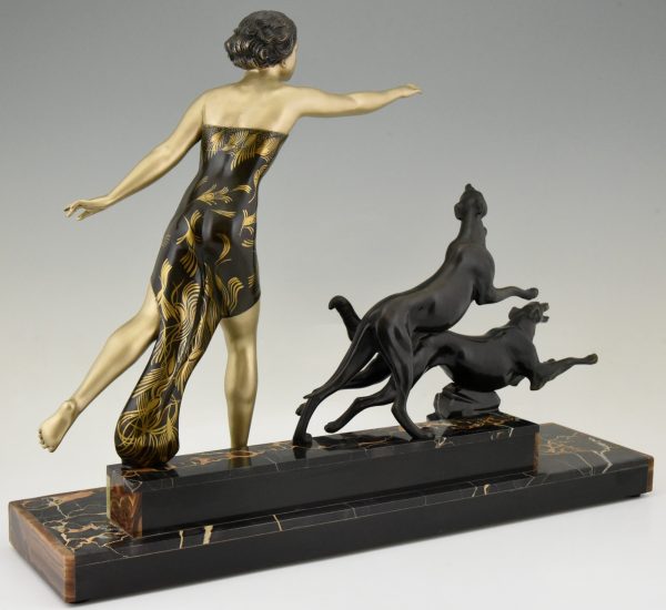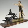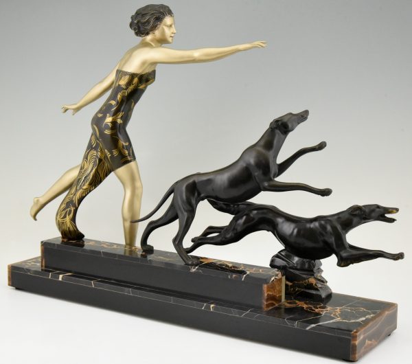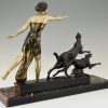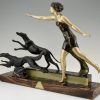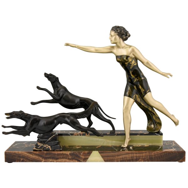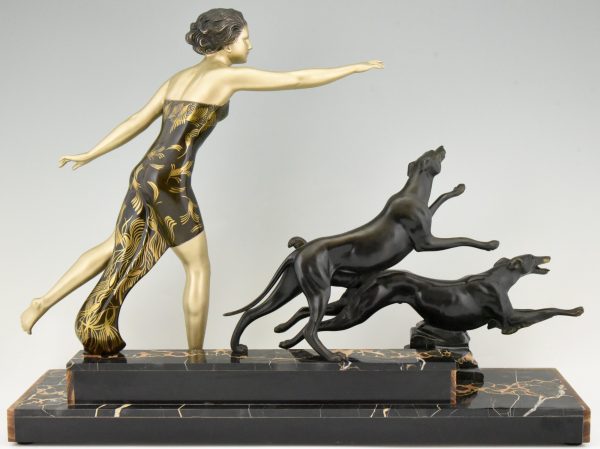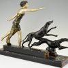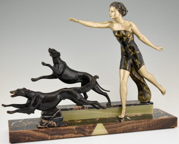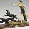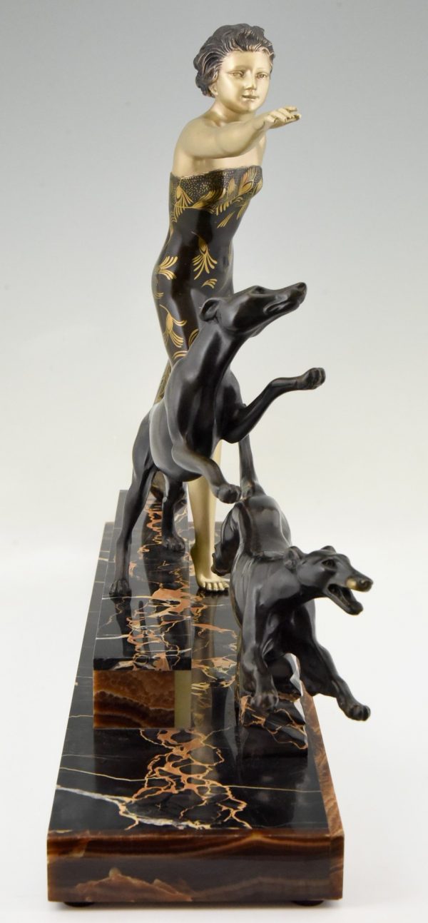 Art Deco sculpture lady with dogs, her dress is decorated with flowers. The piece signed by Uriano, an Italian artist who worked in France.