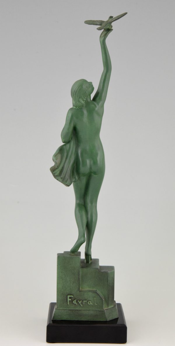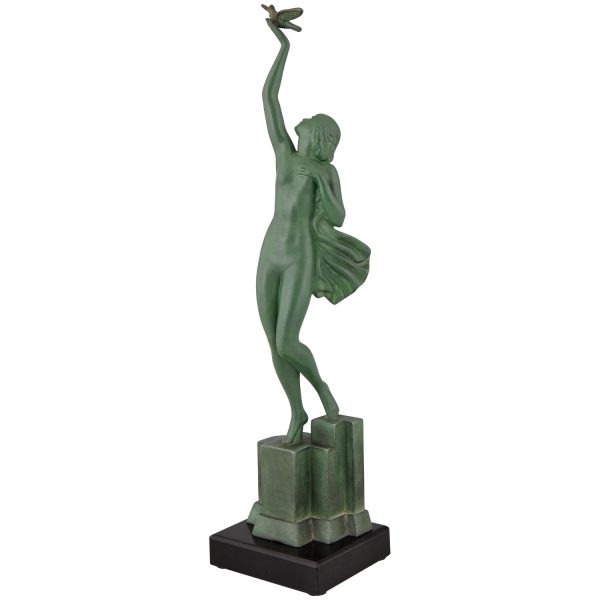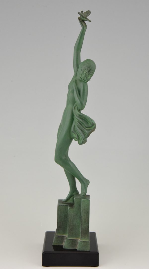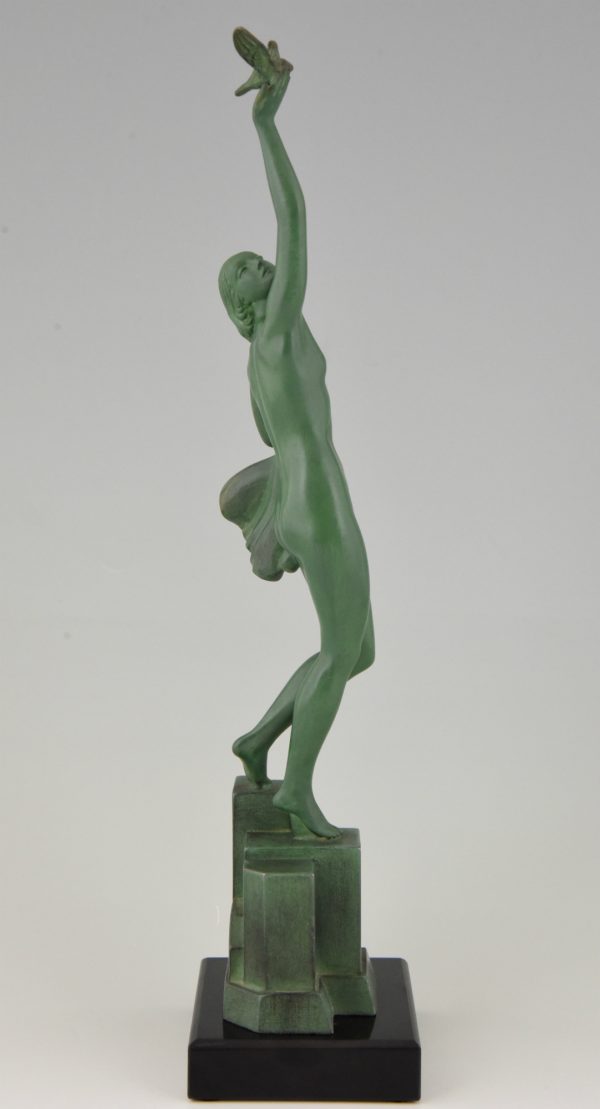 Message of love, beautiful Art Deco sculpture of a nude holding a dove by the French artist Fayral, pseudonym for Pierre Le Faguays, on a marble base