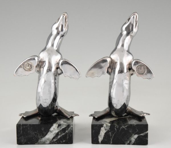 Nice pair of Art Deco seal bookends signed by the French artist Louis Albert Carvin, polished white metal on a green marble base, France 1930.