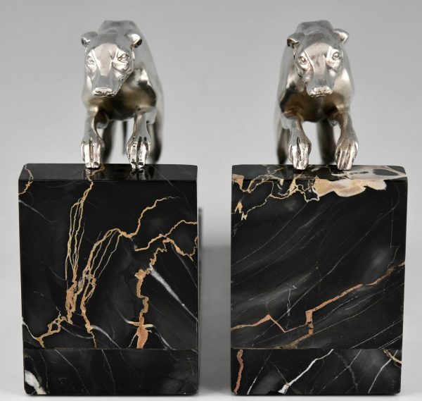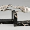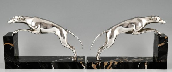 Elegant pair of silvered bronze Art Deco bookends with leaping greyhounds. Signed by Gerorges Gori, France ca. 1930.