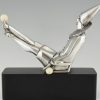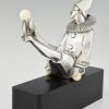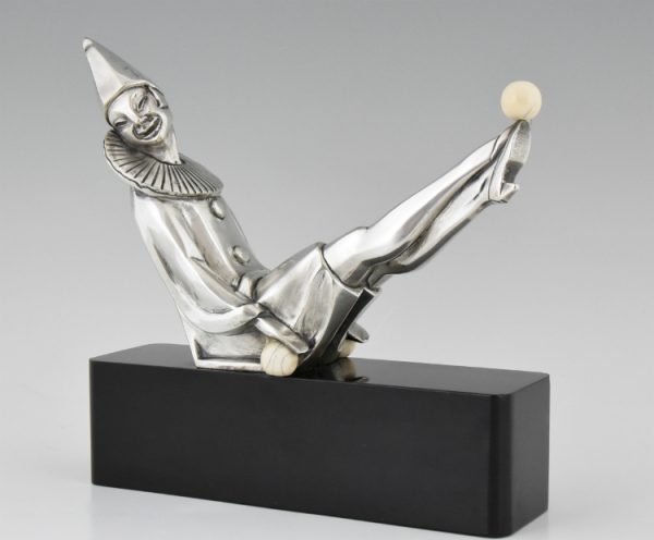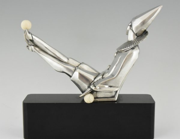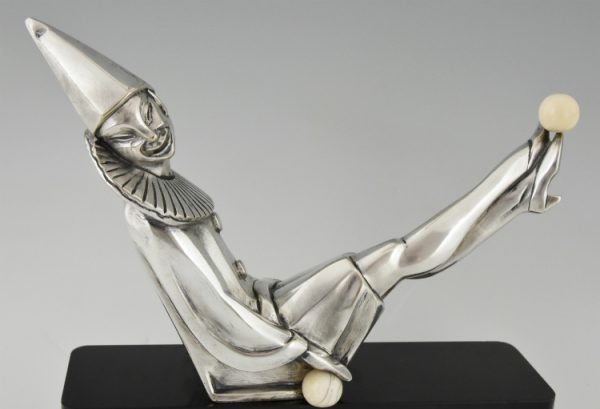 Stylish silvered Art deco bronze of a jugling female clown or Pierrette by the French artist Marcel Andre Bouraine 1886-1948 with foundry seal, Les Neveux de Lehmann, Paris.