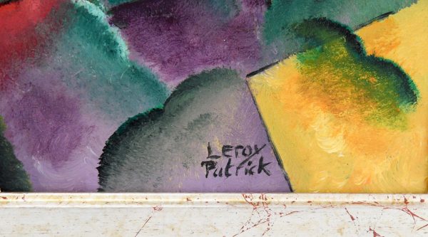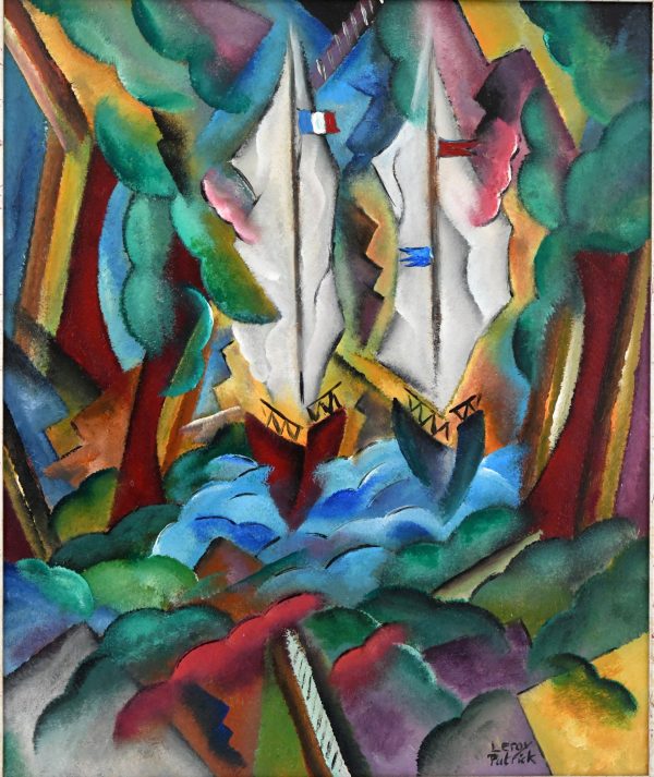 Art Deco style painting landscape with sailingboats by the French artist Patrick Leroy.