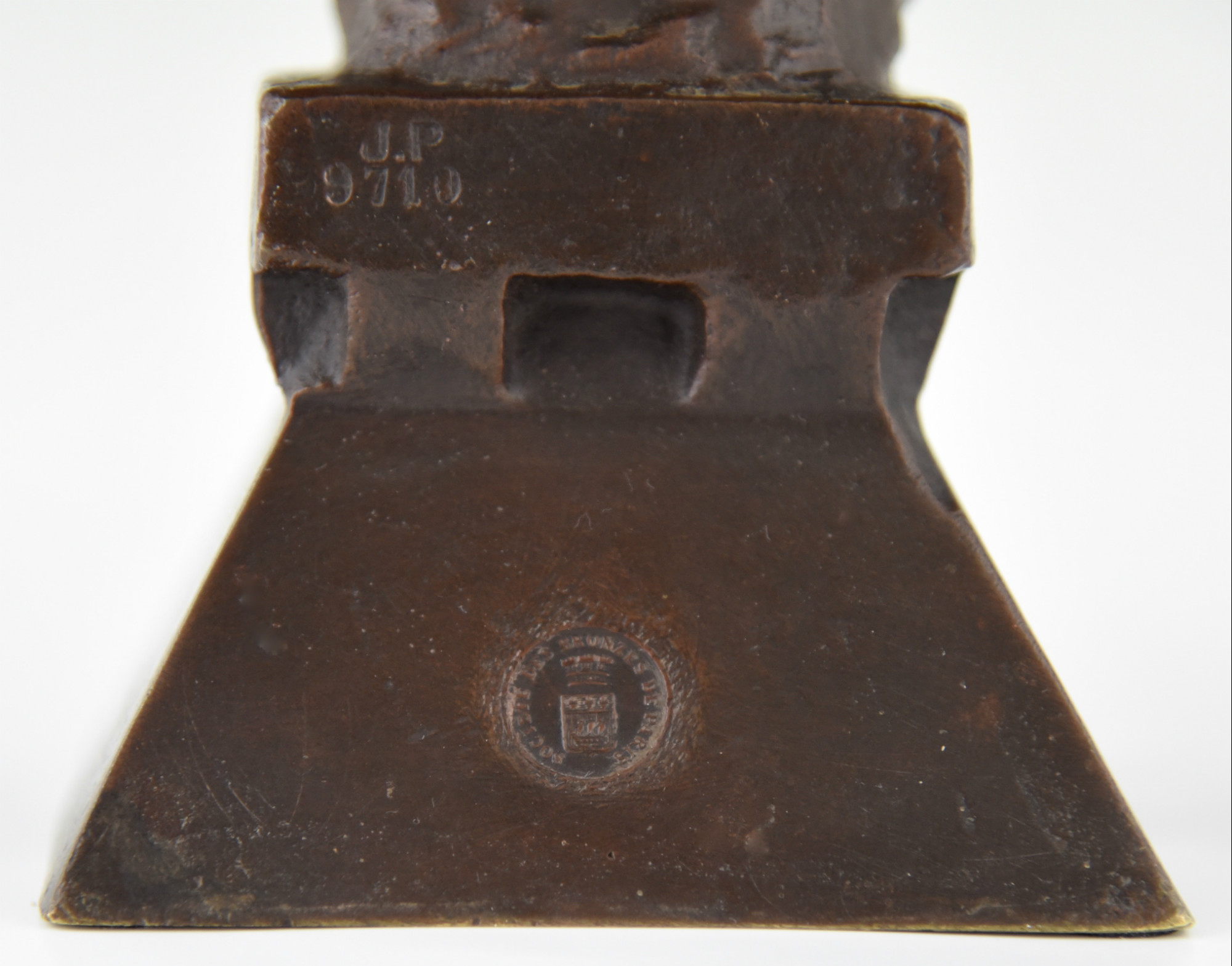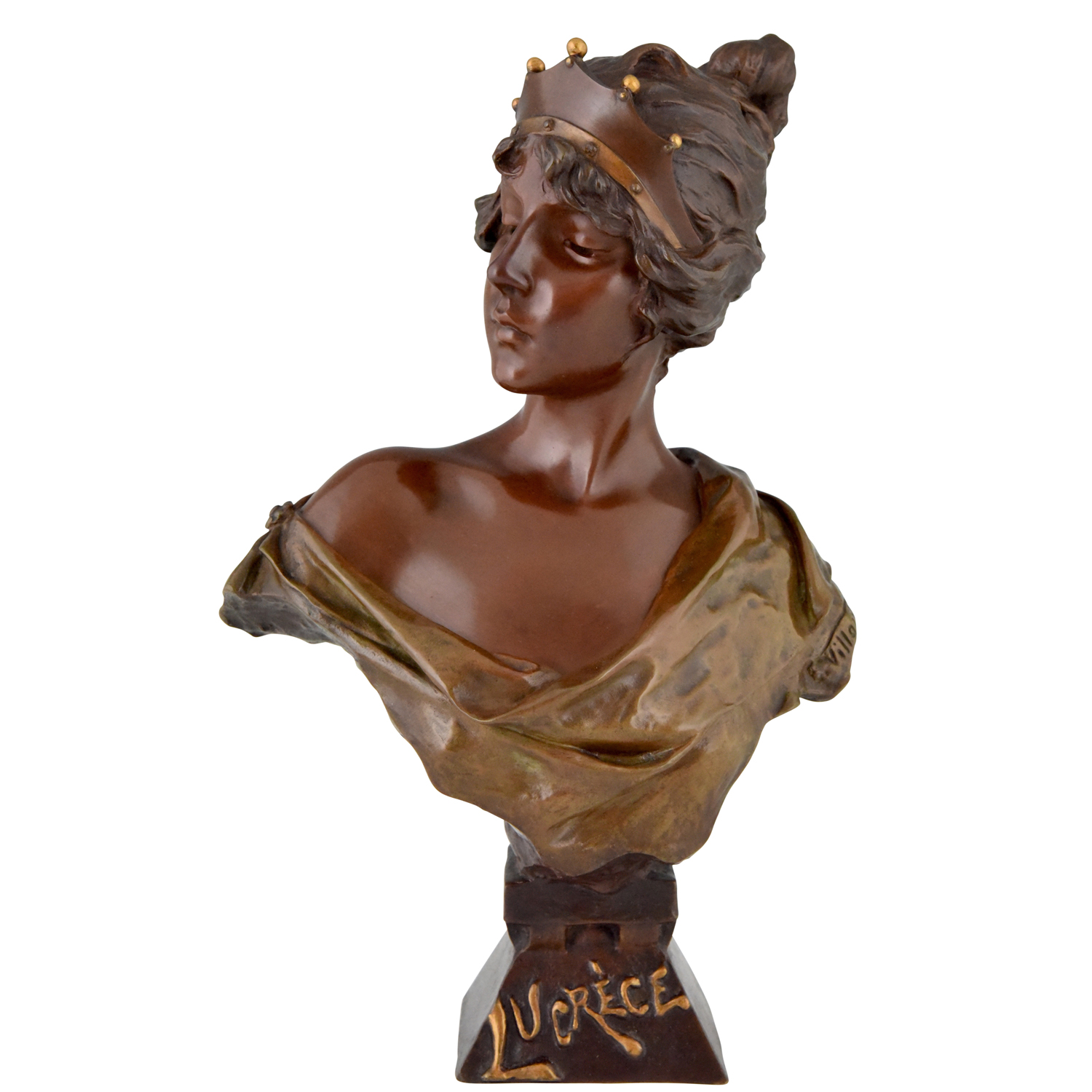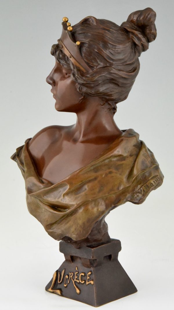 Beautiful Art Nouveau bronze bust of a lady wearing a crown, Lucrèce. The sculpture is signed by Emmanuel Villanis (1858-1914) and has the foundry seal of the Société des bronzes de Paris. Marked J.P. -Initials of the founder- and numbered.