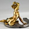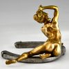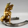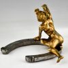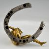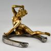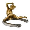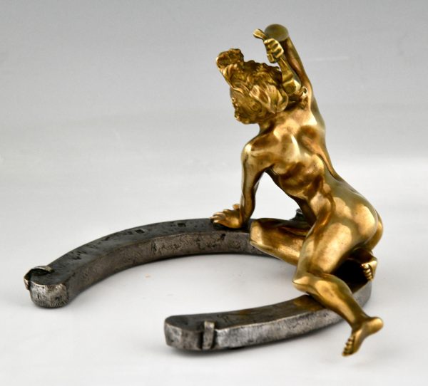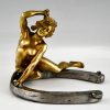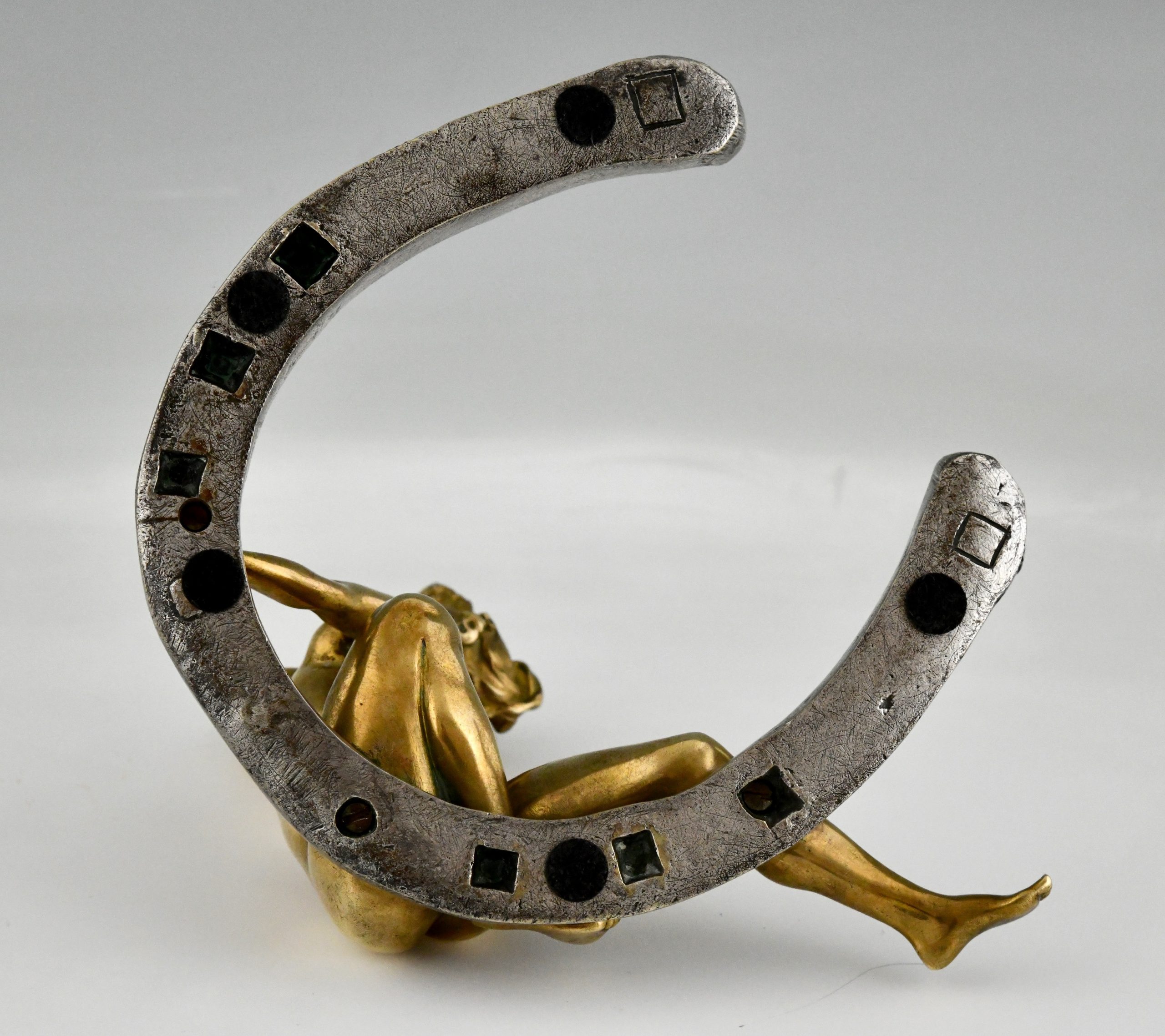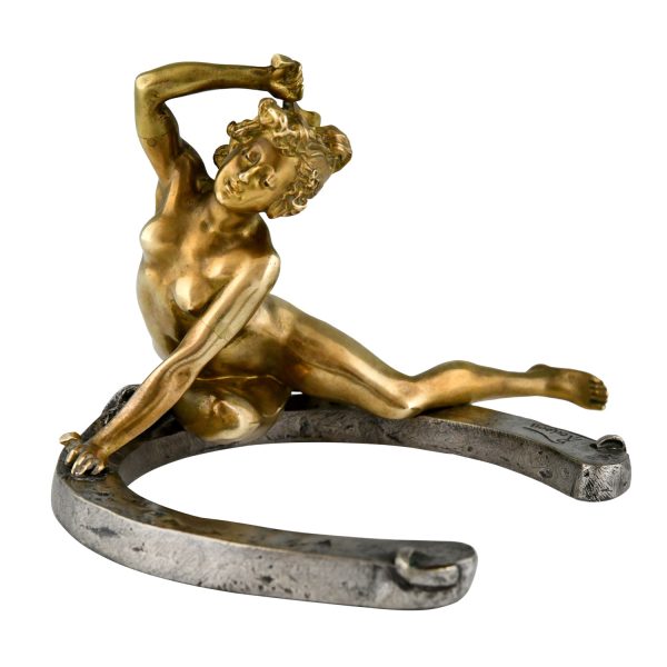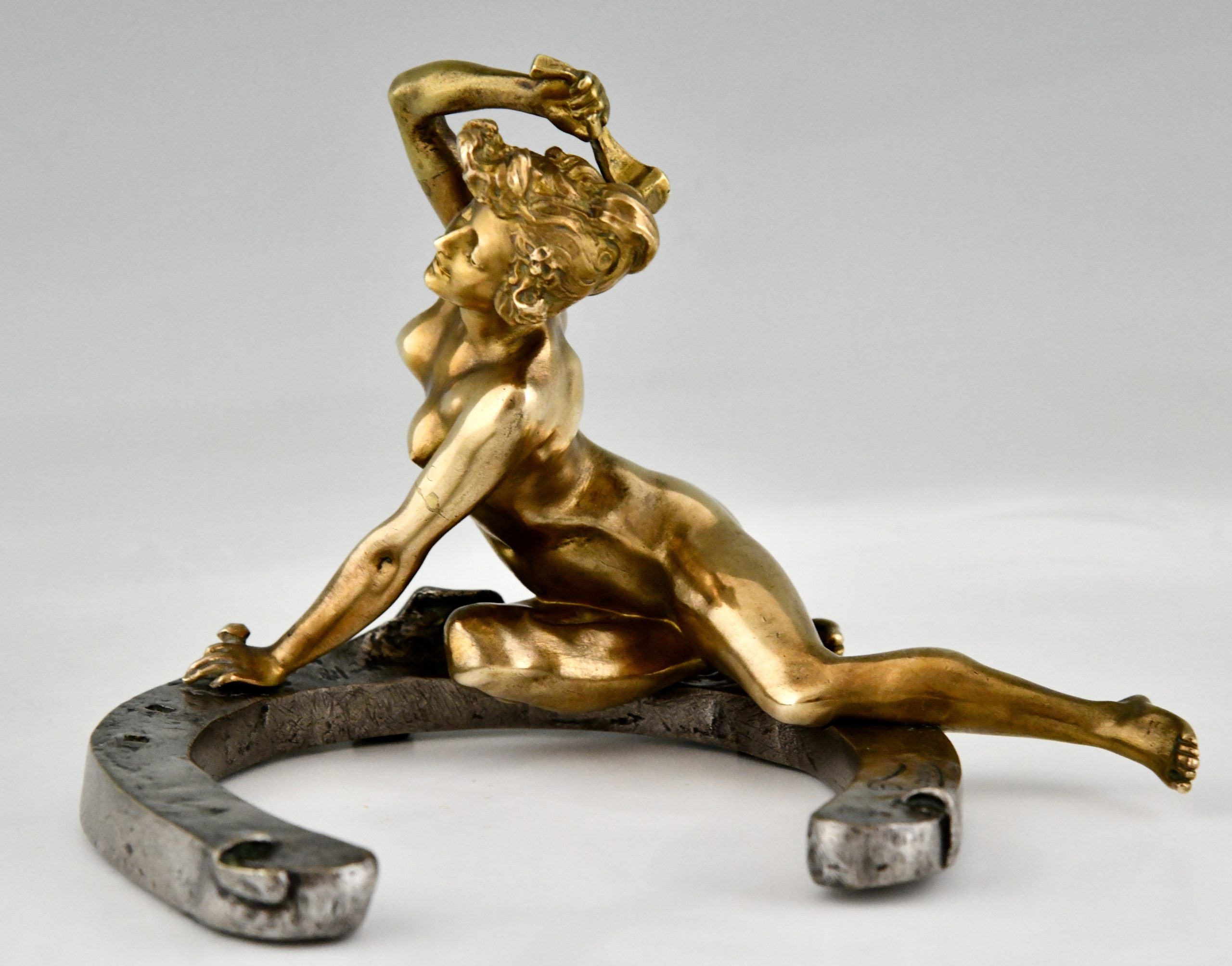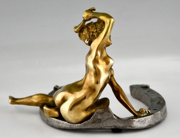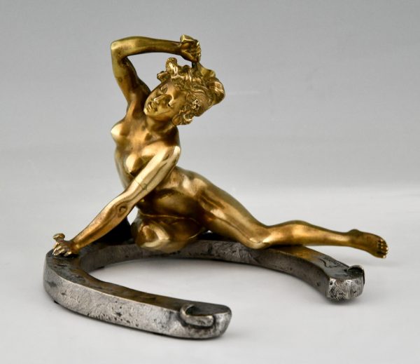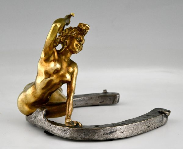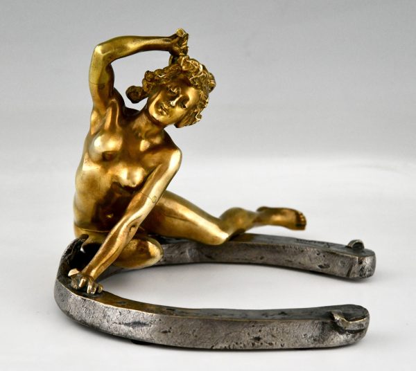 Art Nouveau bronze sculpture nude on a horseshoe.