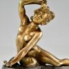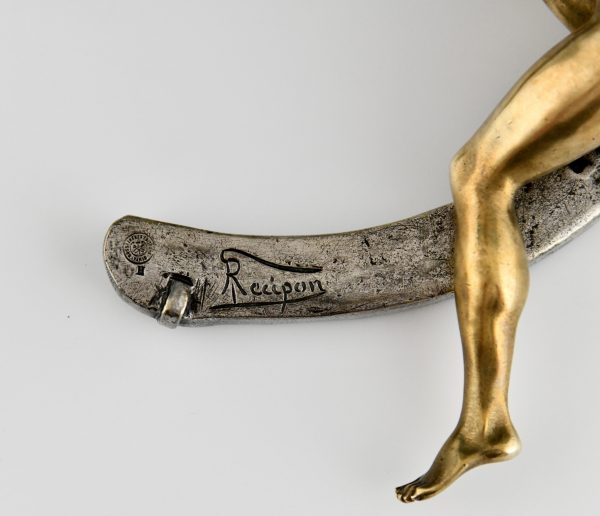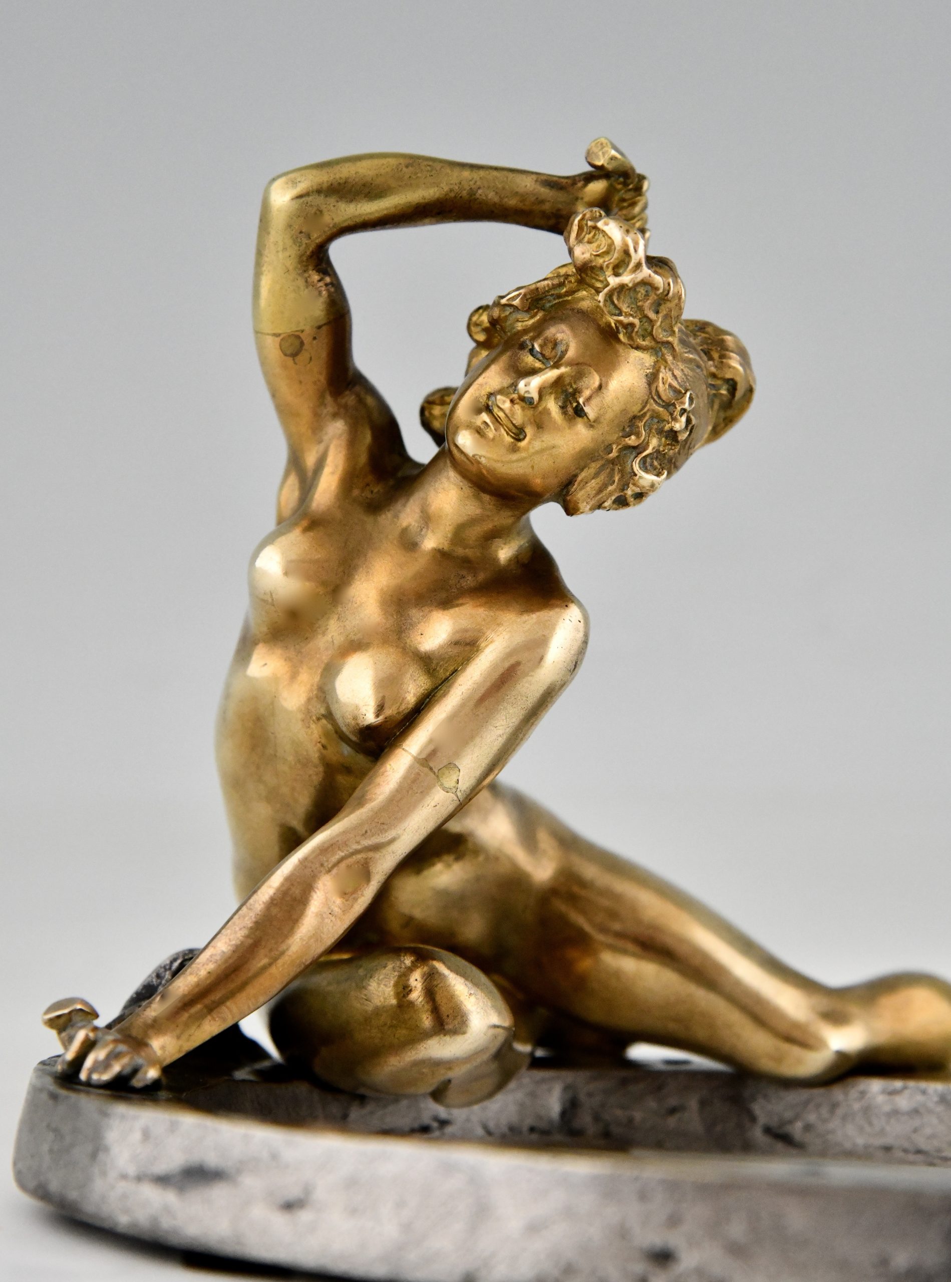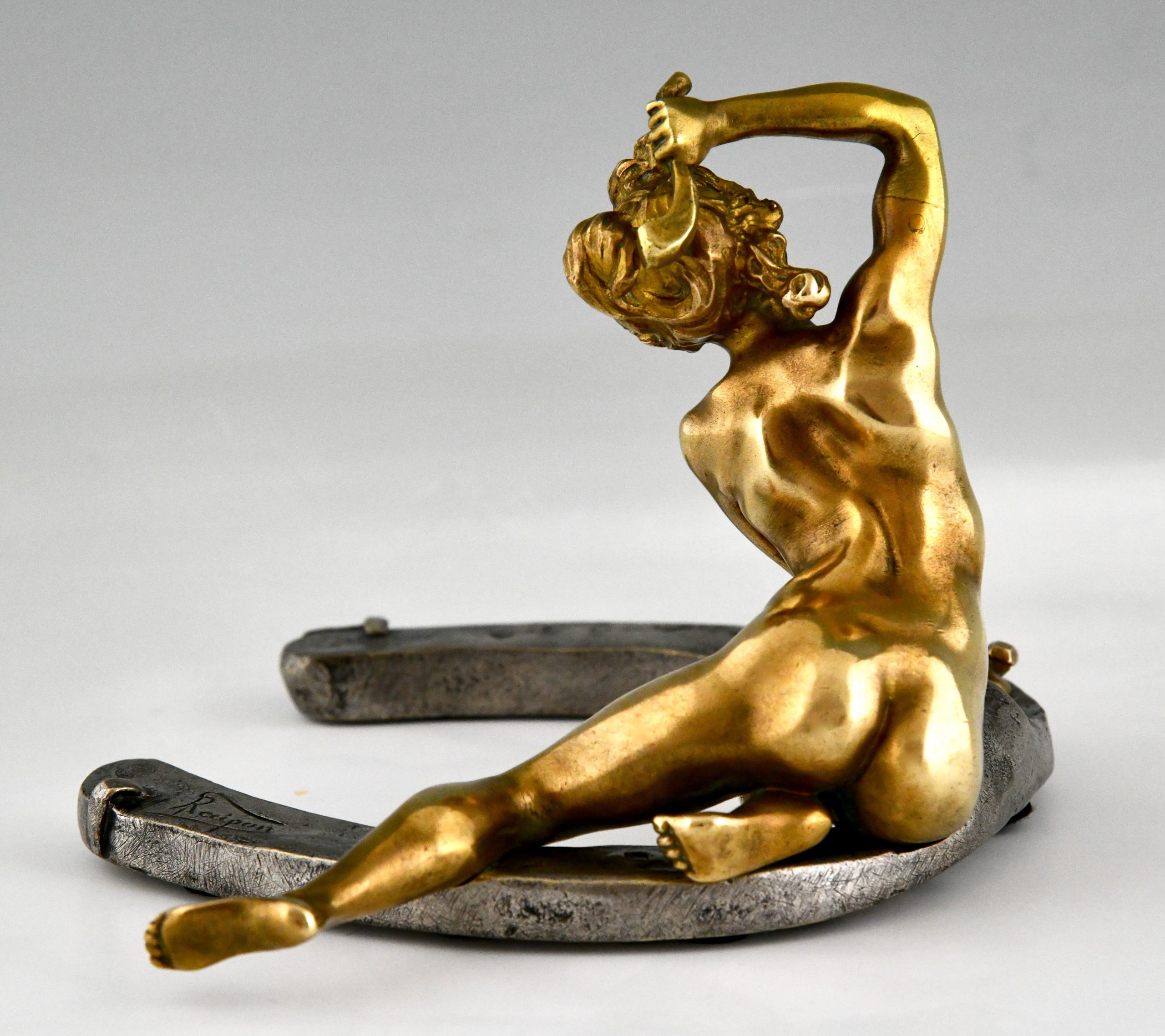 Art Nouveau bronze sculpture nude on a horseshoe by Georges Récipon, foundry mark Susse frères foundry. Gilt en patinated bronze. France 1896. This is the large version of this model.