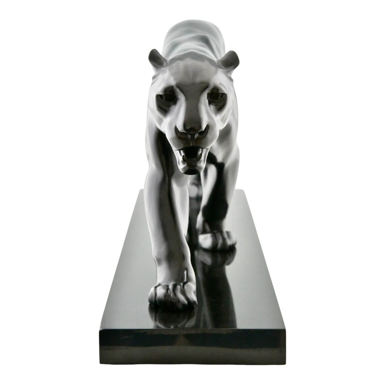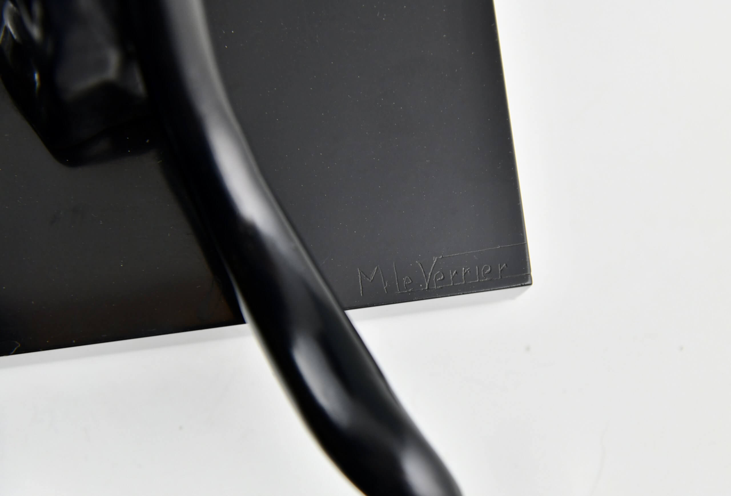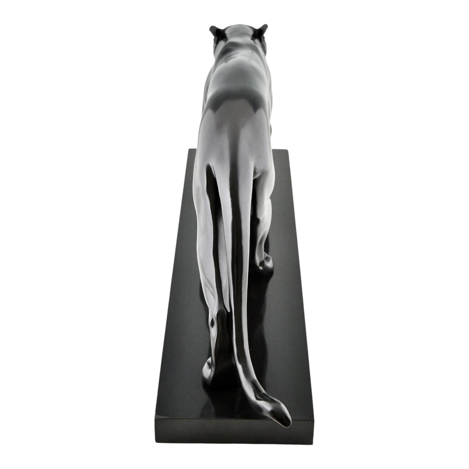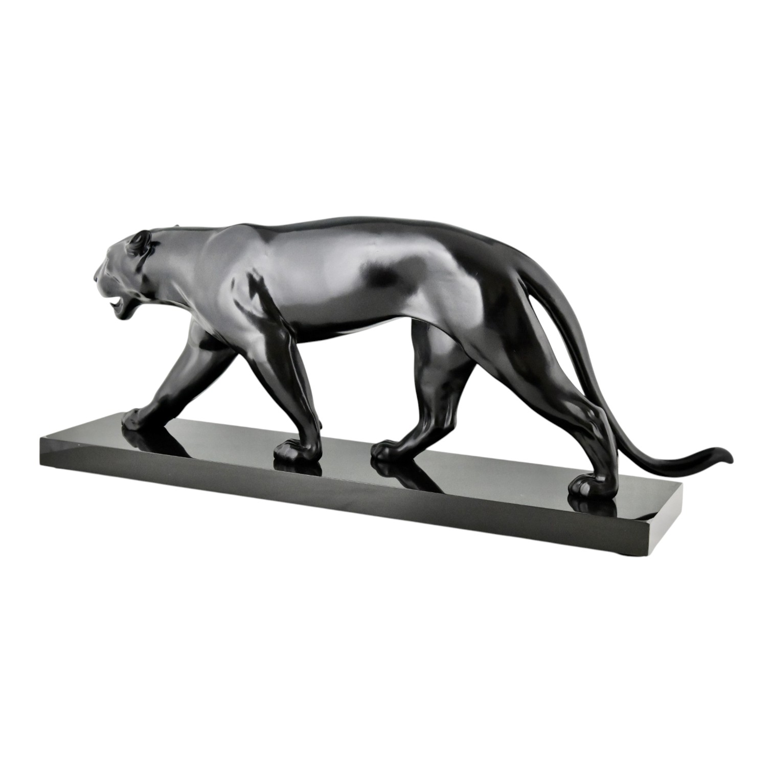 An exceptional Art Deco sculpture of a majestic panther, titled Baghera, created by renowned French artist Max Le Verrier in 1930. Crafted in art metal with a deep black patina, the sculpture rests on an elegant Belgian black marble base. The piece bears the artist’s signature M. Le Verrier and measures H. 26 cm x L. 64 cm x W. 14 cm (10.2 x 25.2 x 5.5 in). A true collector’s piece in very good condition, illustrated in Max Le Verrier, un esprit Art Déco by Wattel & Blanchet. A rare opportunity to acquire an authentic work of French Art Deco mastery.