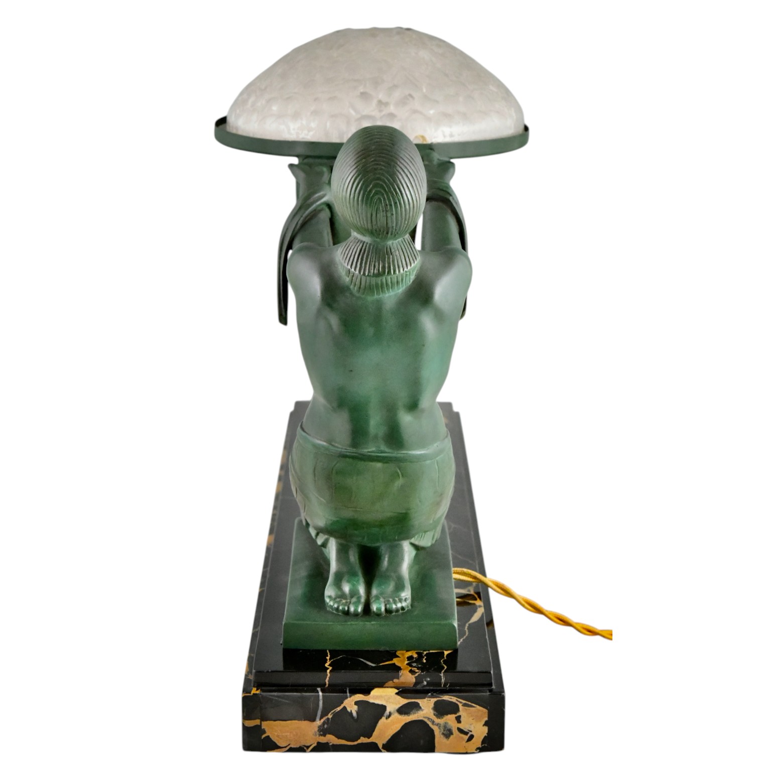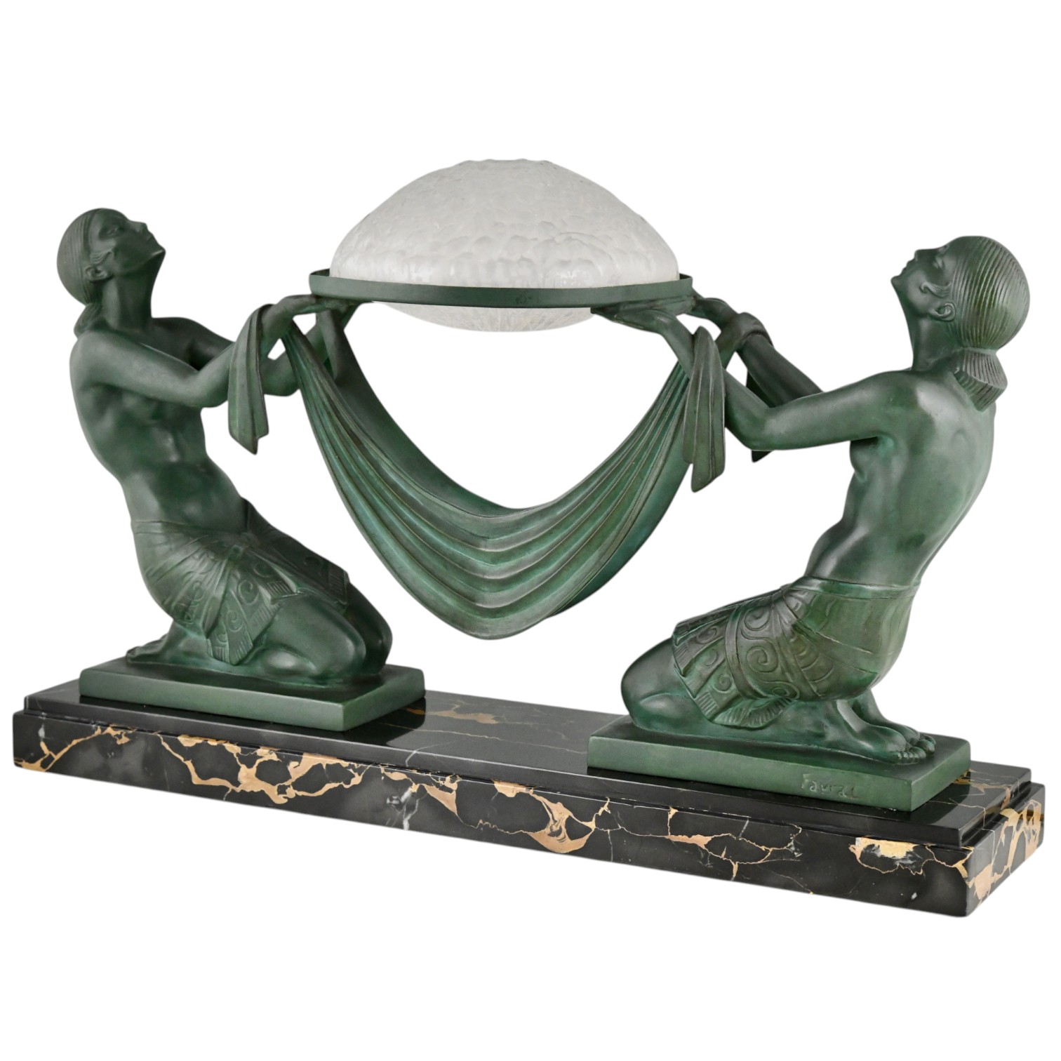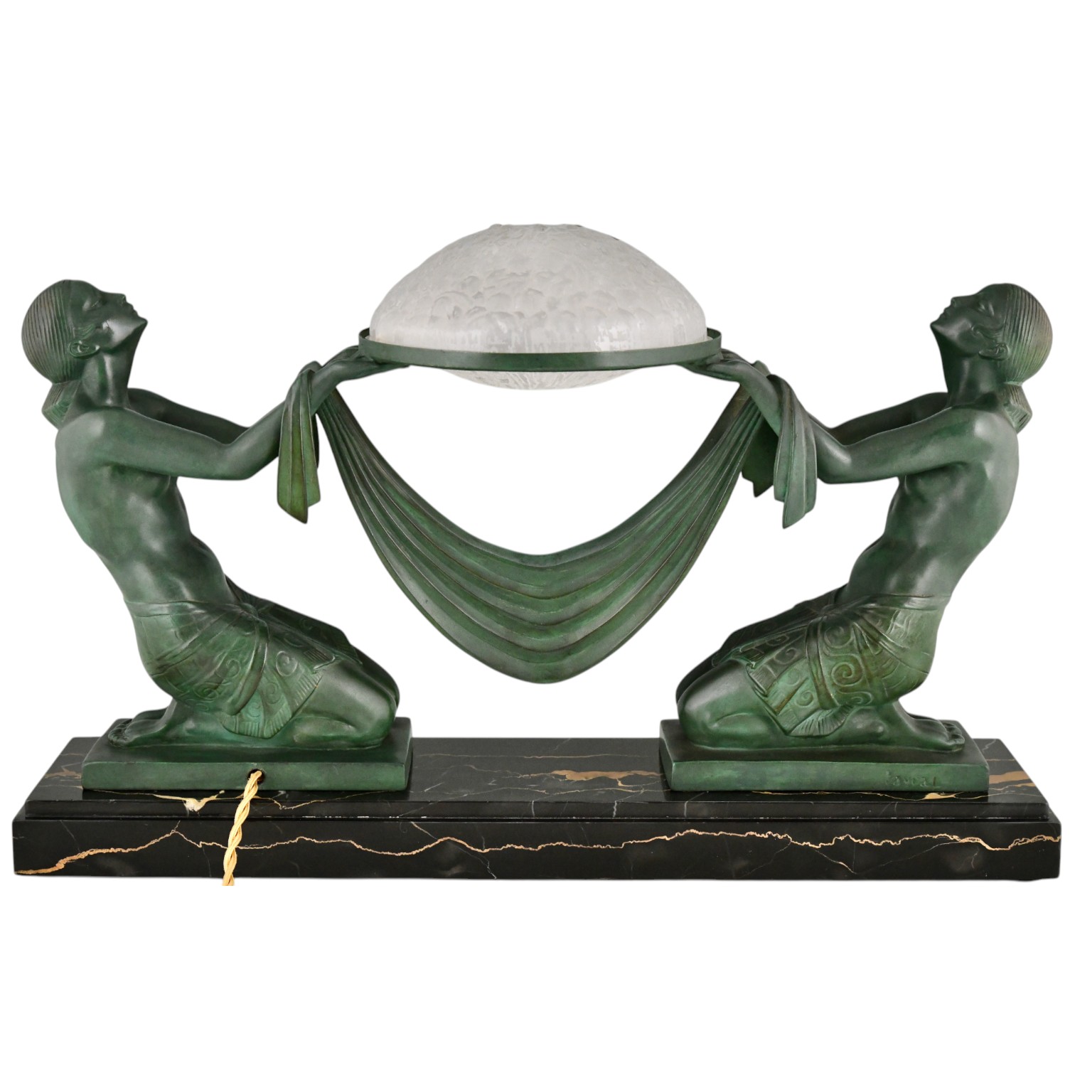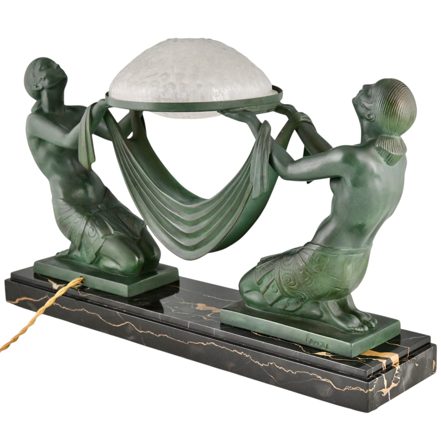 A rare and striking Art Deco table lamp, Offrande, designed by Fayral (pseudonym of Pierre Le Faguays) and executed by the renowned Max Le Verrier. It features two kneeling women in Egyptian robes, facing one another and raising an offering—an homage to Art Deco’s fascination with Ancient Egypt following Howard Carter’s discovery of Tutankhamen’s tomb in 1922.