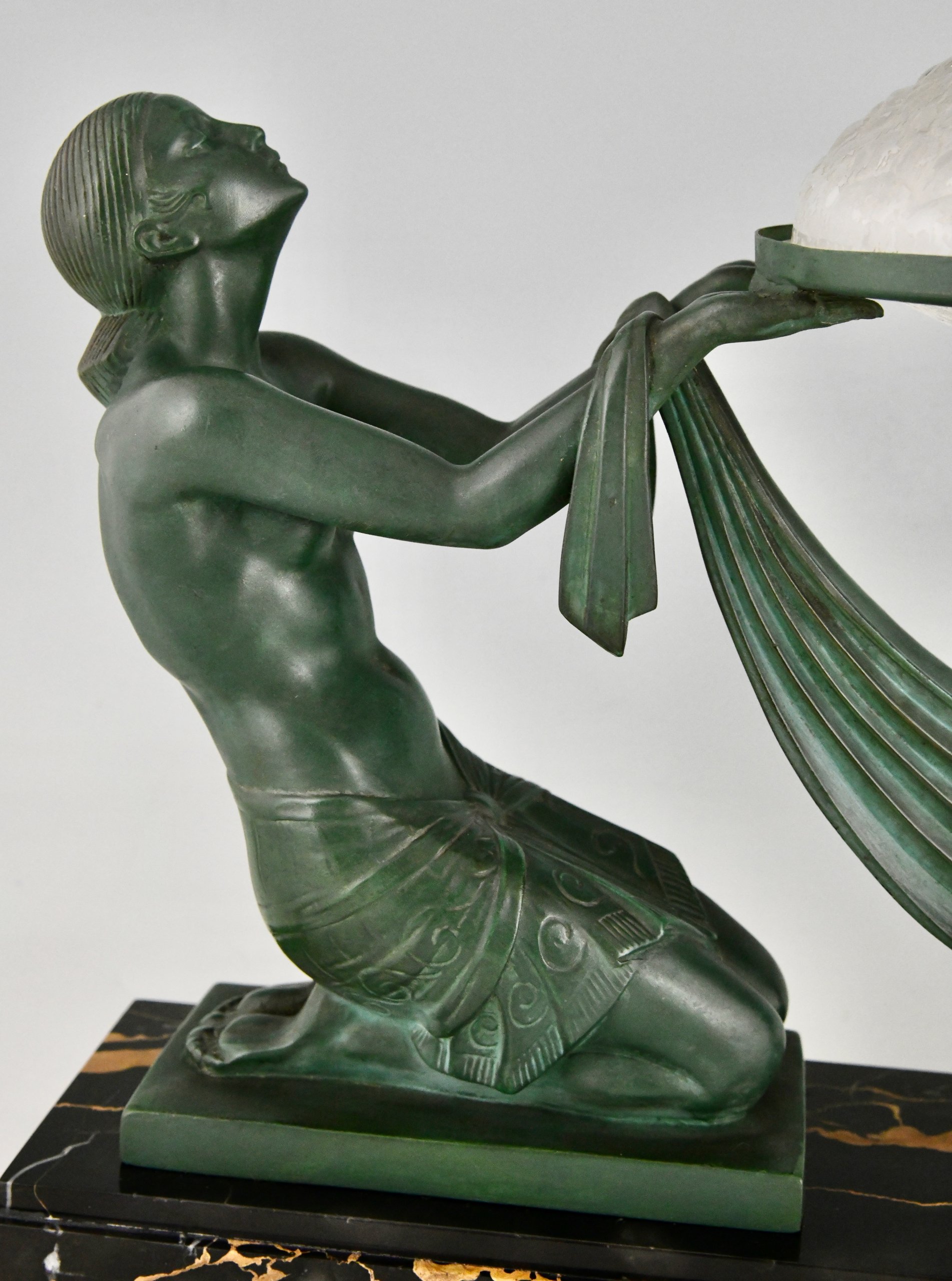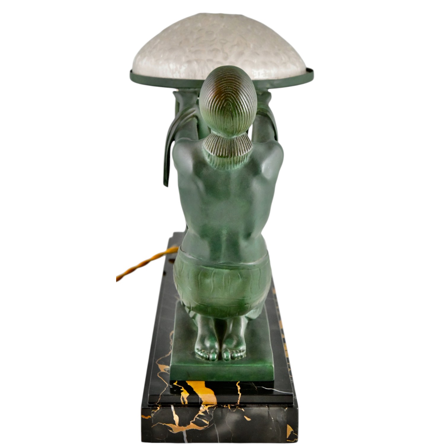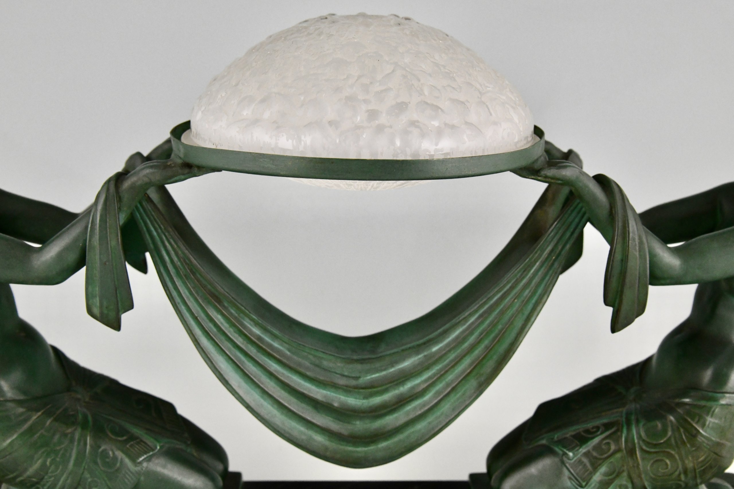 A rare and striking Art Deco table lamp, Offrande, designed by Fayral (pseudonym of Pierre Le Faguays) and executed by the renowned Max Le Verrier. It features two kneeling women in Egyptian robes, facing one another and raising an offering—an homage to Art Deco’s fascination with Ancient Egypt following Howard Carter’s discovery of Tutankhamen’s tomb in 1922.