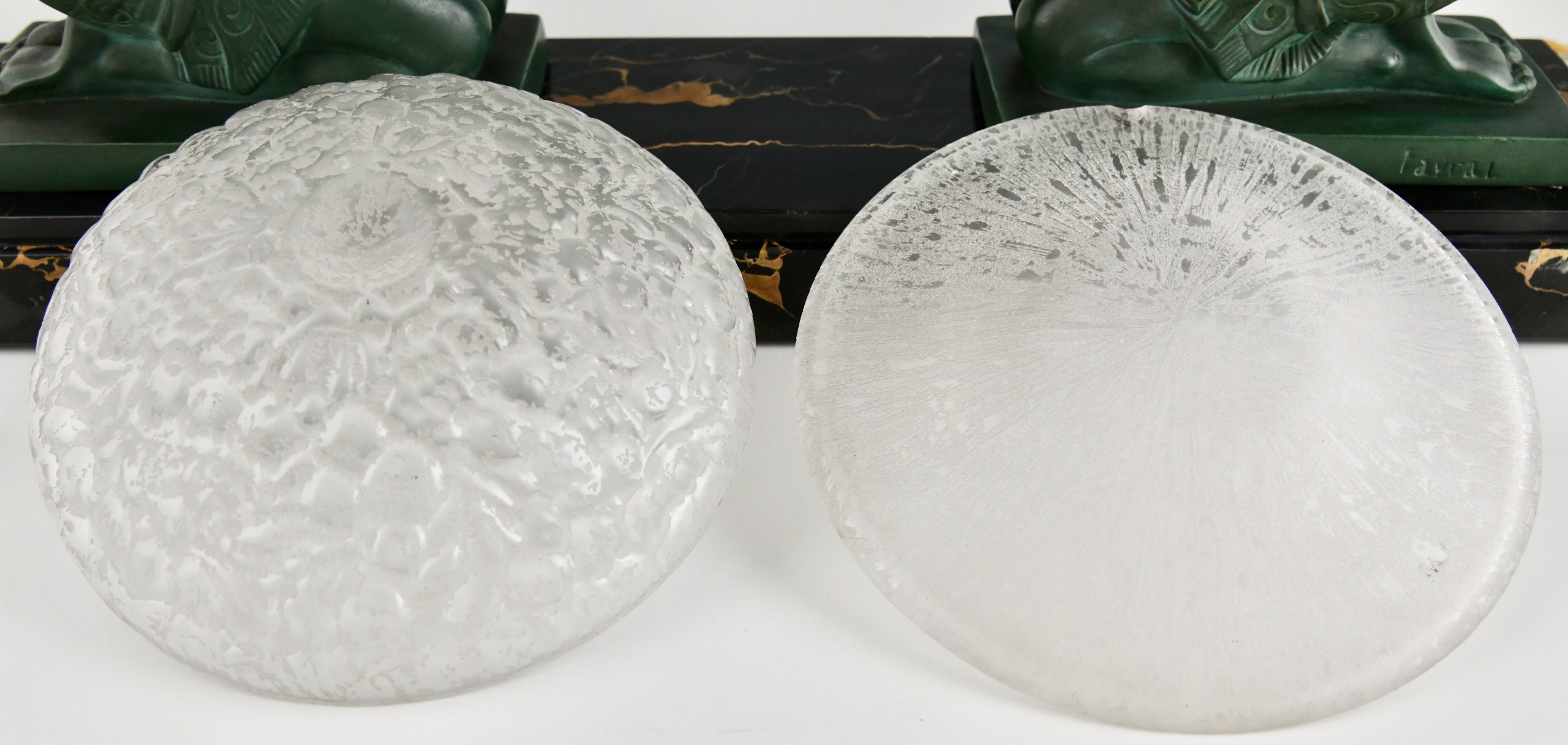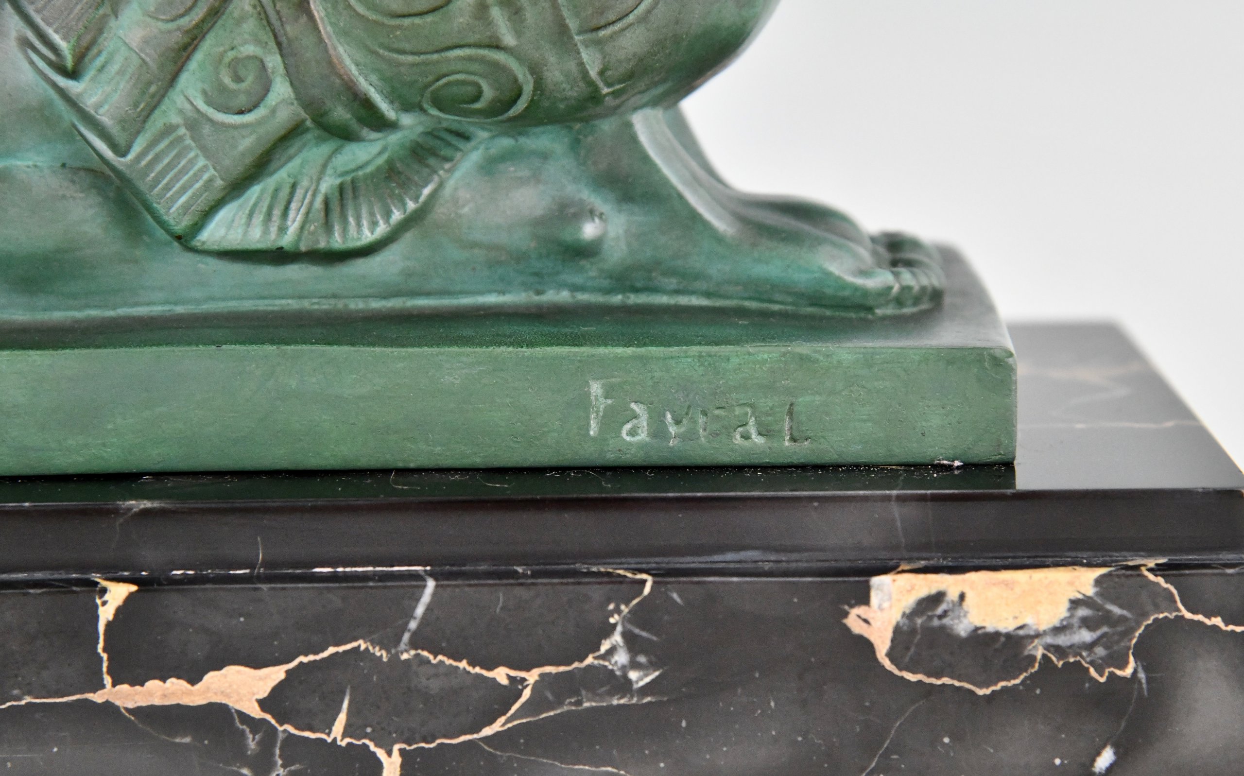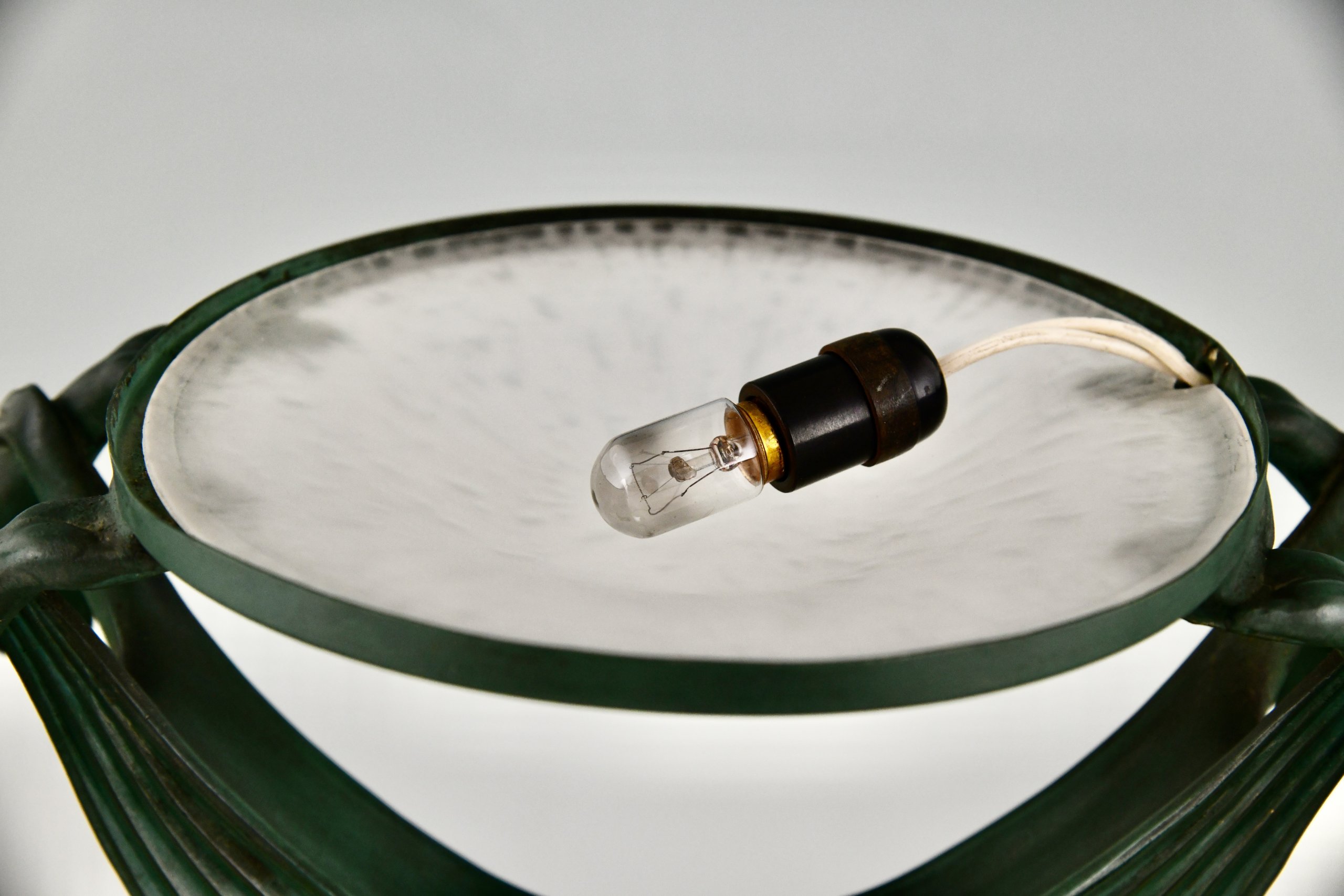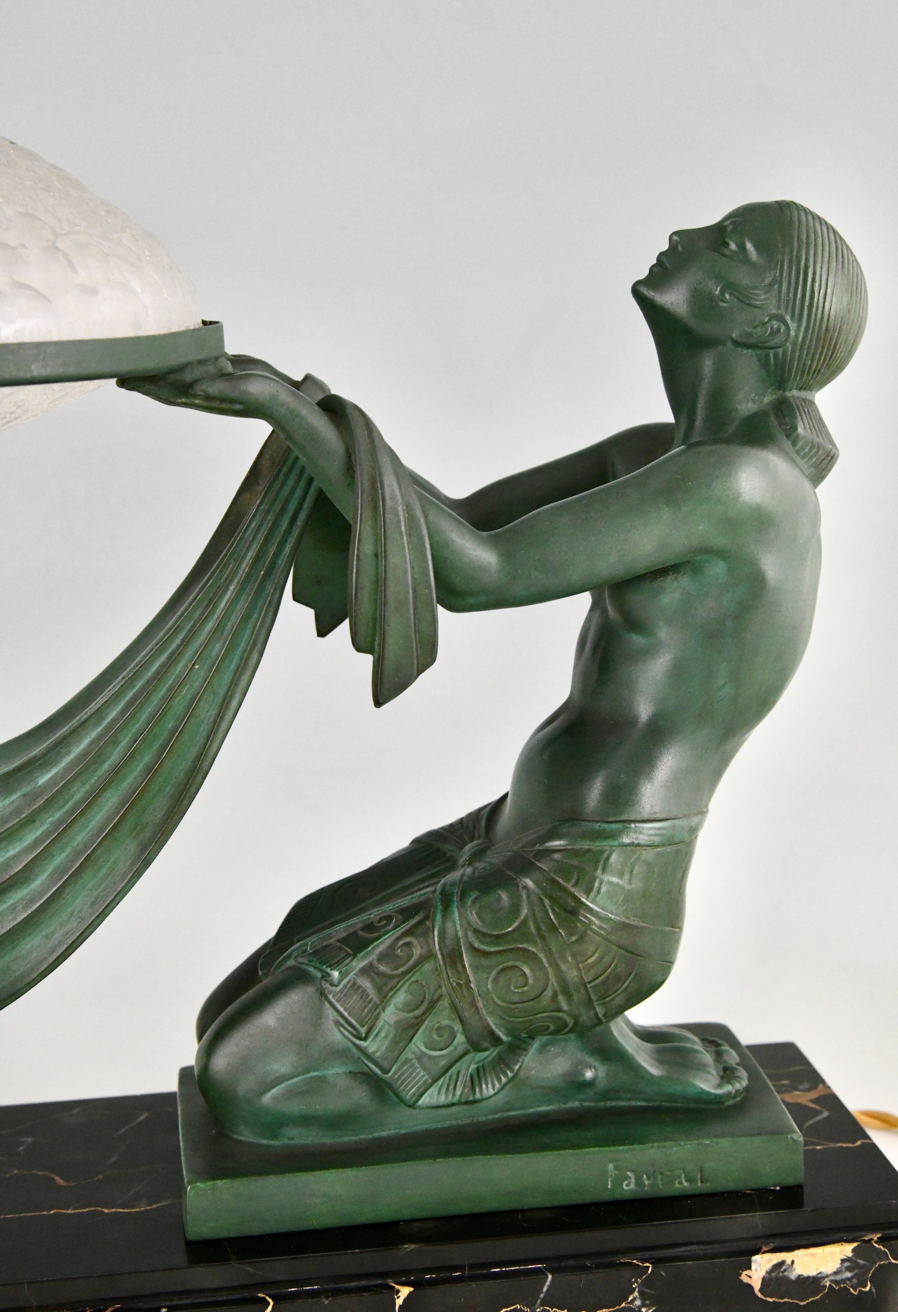 A rare and striking Art Deco table lamp, Offrande, designed by Fayral (pseudonym of Pierre Le Faguays) and executed by the renowned Max Le Verrier. It features two kneeling women in Egyptian robes, facing one another and raising an offering—an homage to Art Deco’s fascination with Ancient Egypt following Howard Carter’s discovery of Tutankhamen’s tomb in 1922.