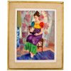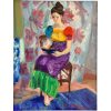 The young wears a colorful dress and is sitting in front of a curtain with flowers, her feet resting on a a blue carpet