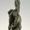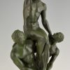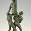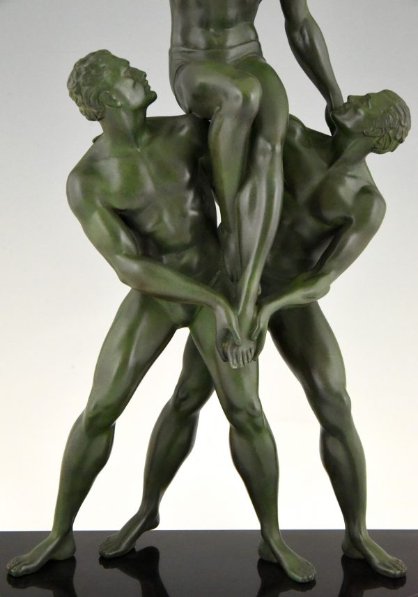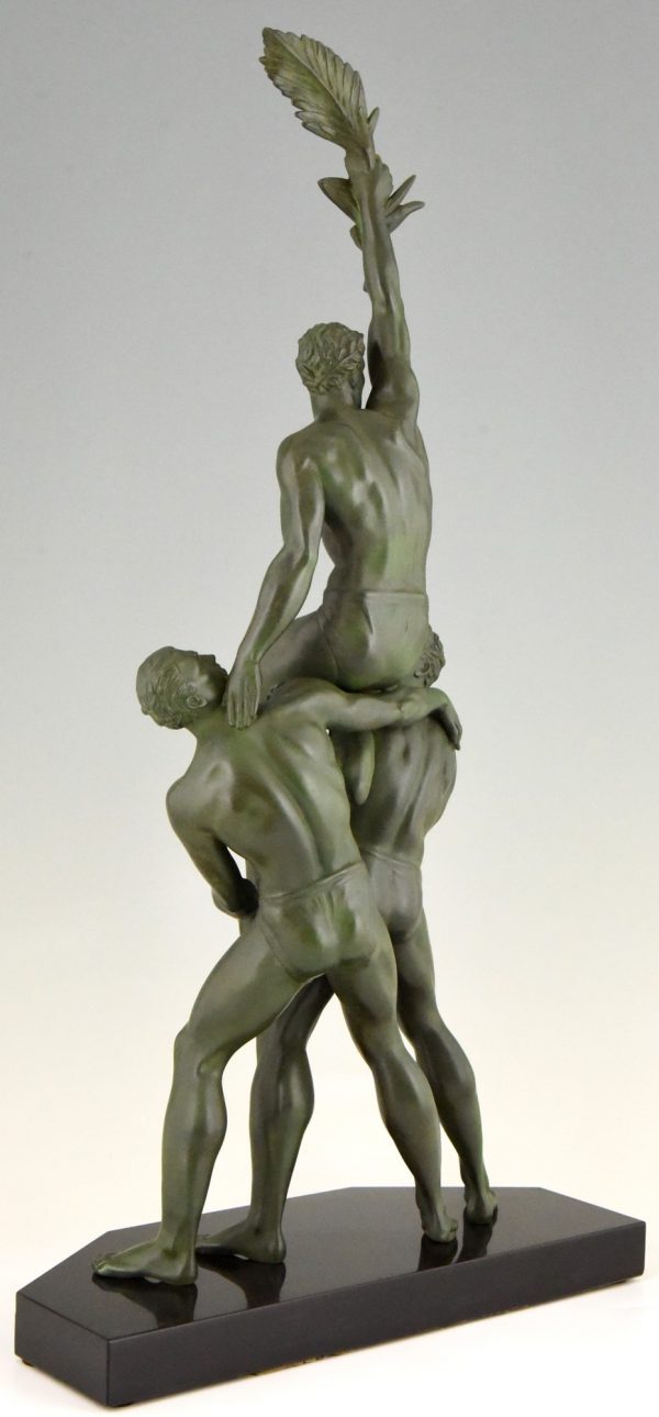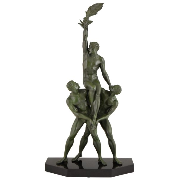 Victory, impressive Art Deco sculpture of three athletic men by the well known French sculptor Pierre Le Faguays. The man in the middle is sitting on the shoulders of the other two and holds a palm leaf in his outstreched arm as a sign of Victory.  The sculpture has a lovely dark green patina with lighter shades and stands on a Belgian Black marble base. Ca. 1930.
