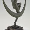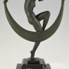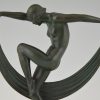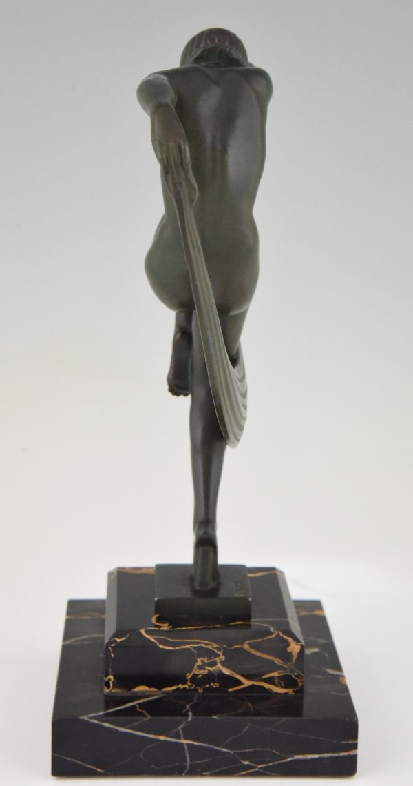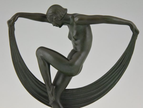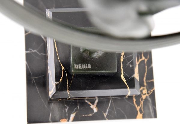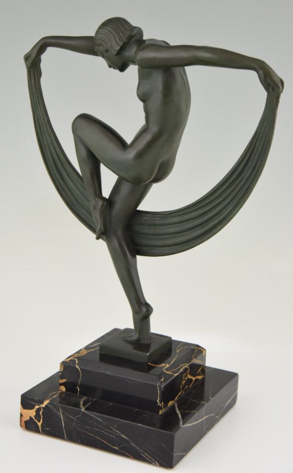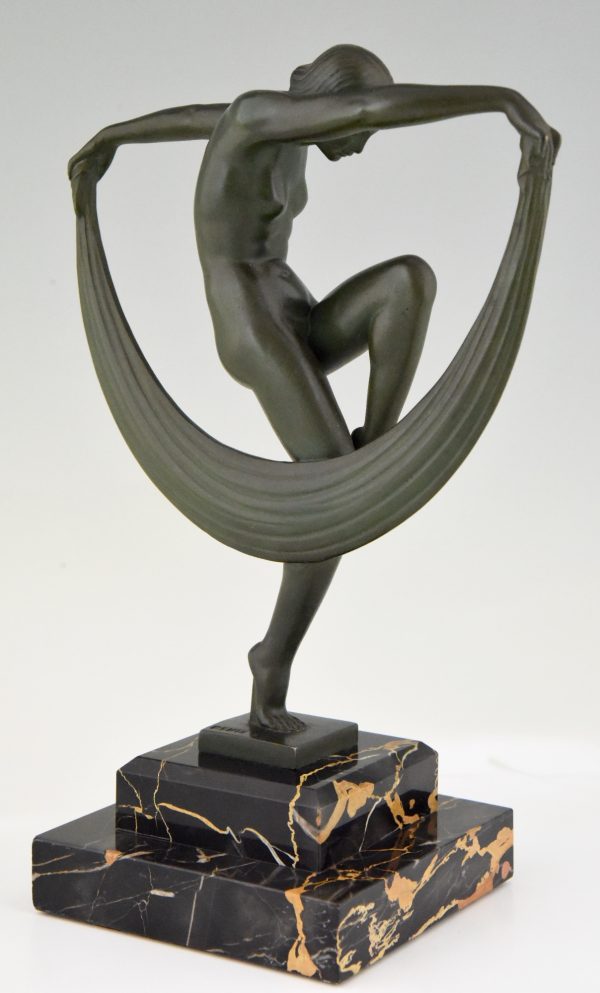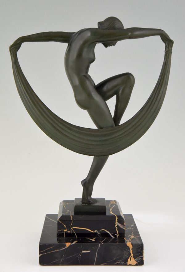 Elegant Art Deco sculpture of a dancing nude with scarf by the French artist Denis. On a stepped Portor marble base.