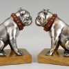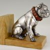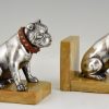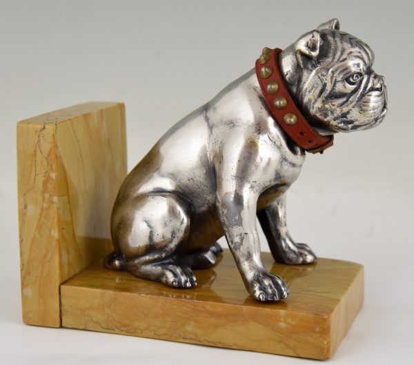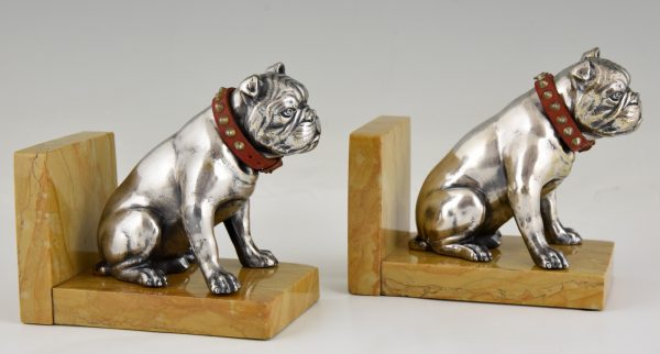 Cute pair of Art Deco bulldog bookends by Franjou, France 1930. White metal on marble base, leather collars with studs.
