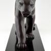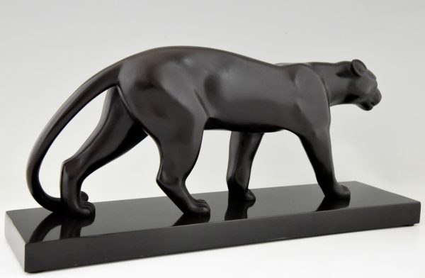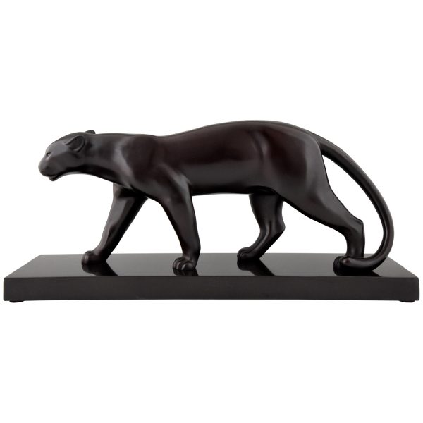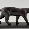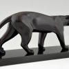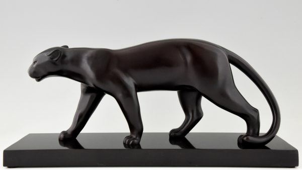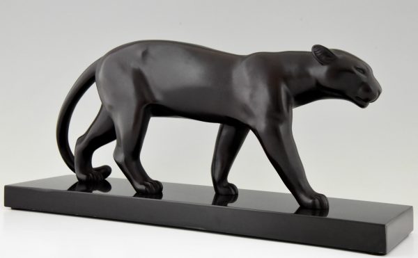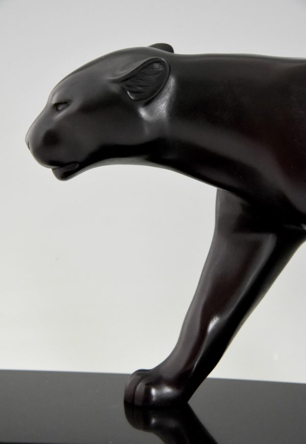 Stylish Art Deco bronze panther sculpture by the French artist Emile Louis Bracquemond. The walking panther stands on a black Belgian marble base.