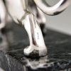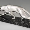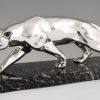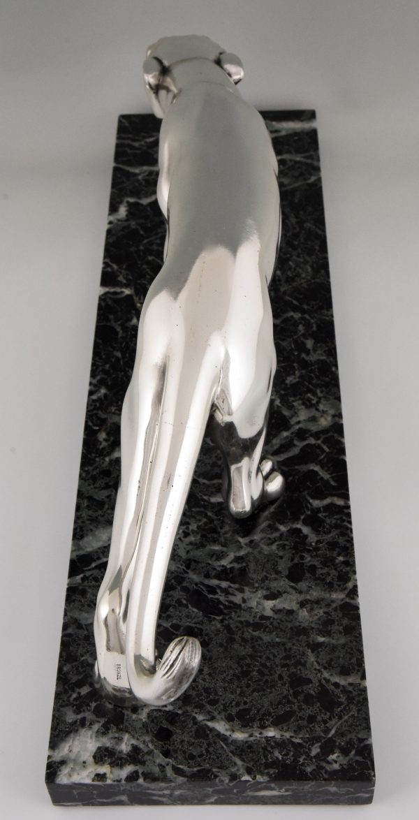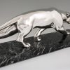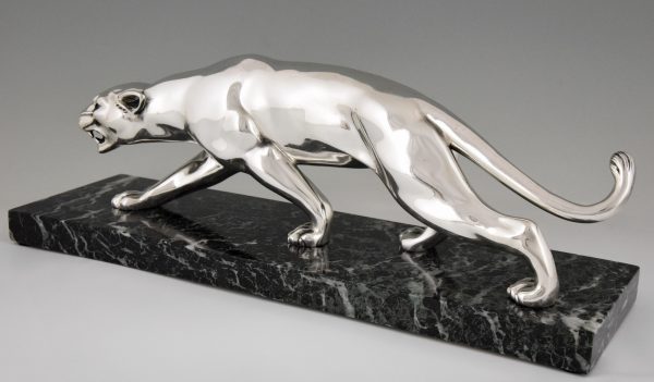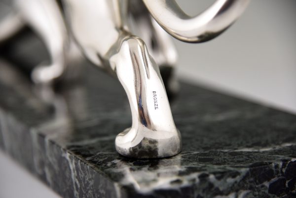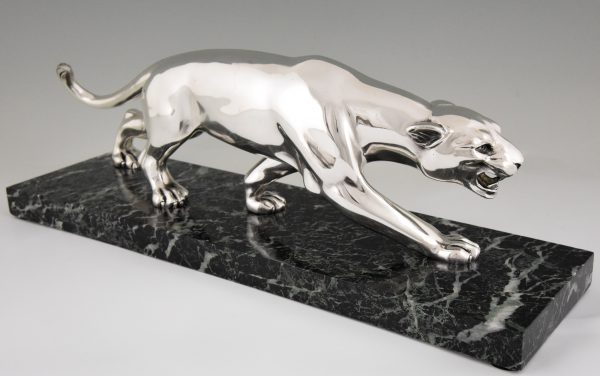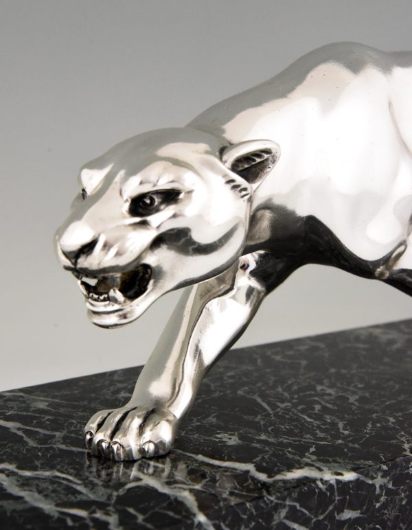 Strong Art Deco sculpture of a panther, signed by Salvatore Melani. Silvered bronze on a marble base, France 1930.