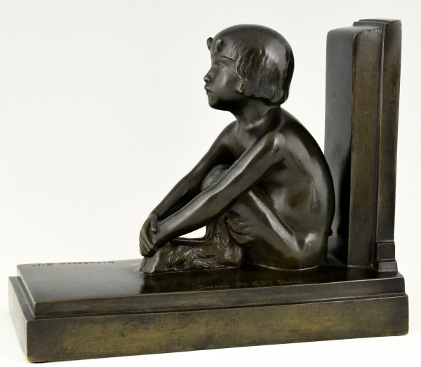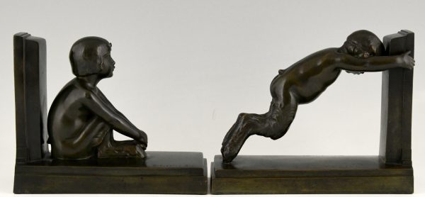 Tallest version of “Sit and push”, Art Deco bronze bookends boy and girl satyr.
