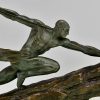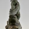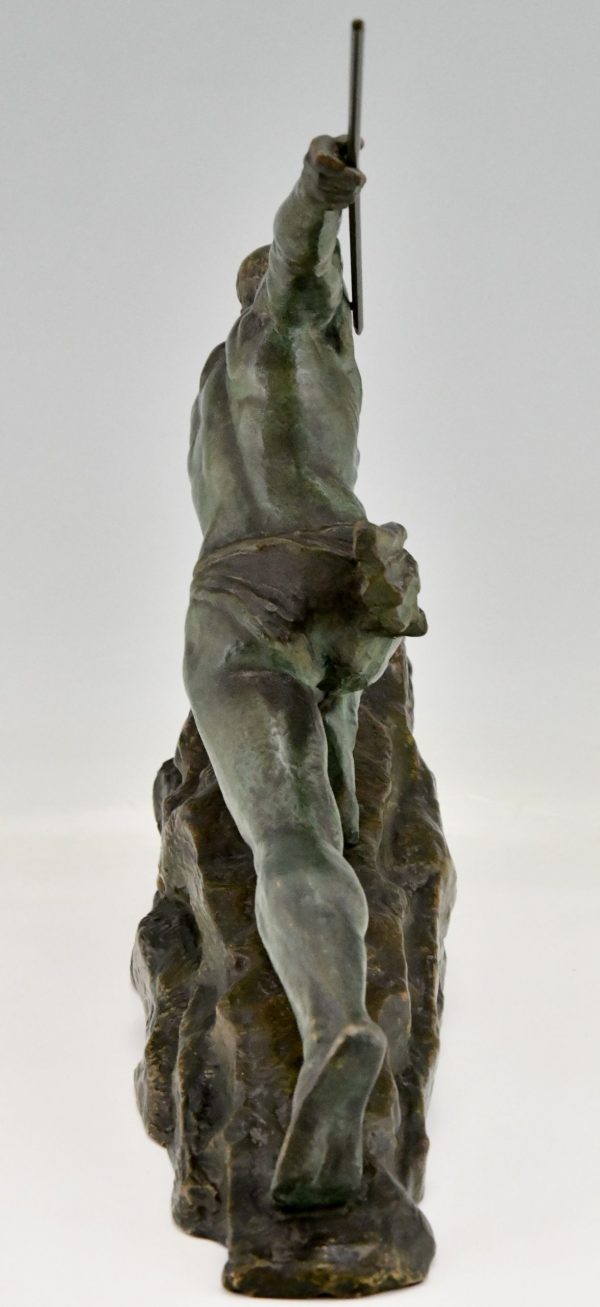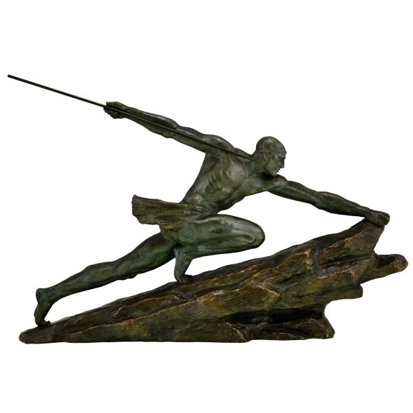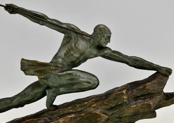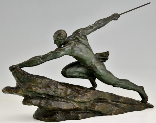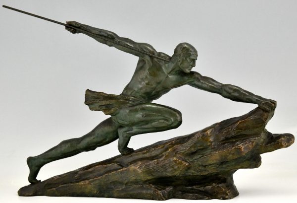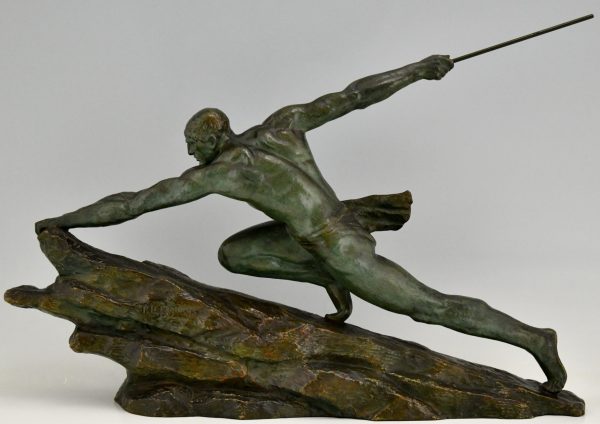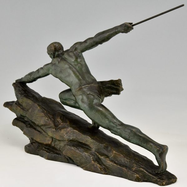 "One Chance" Authentiek Art Deco brons van een man op een rots die een speer gooit. Getekend door Pierre Le Faguays. Gemerkt brons, genummerd. Mooi patina.