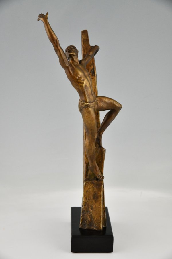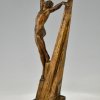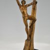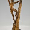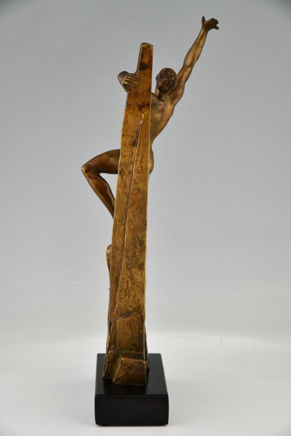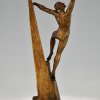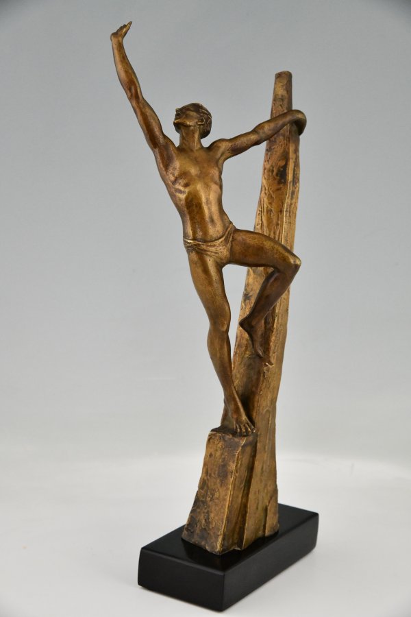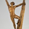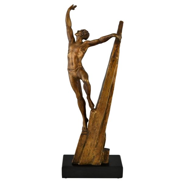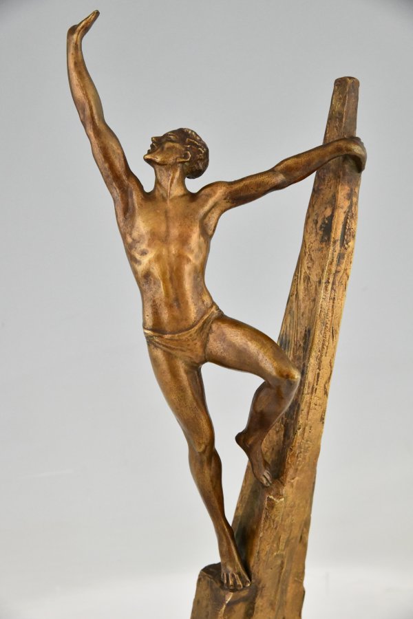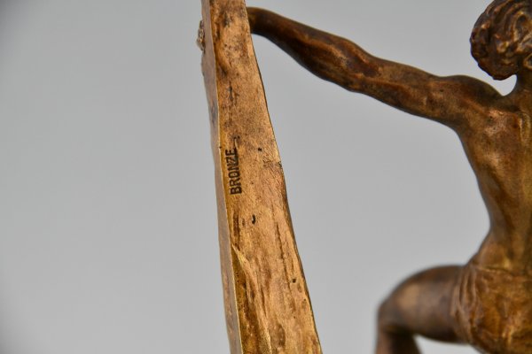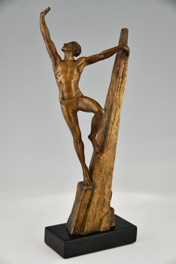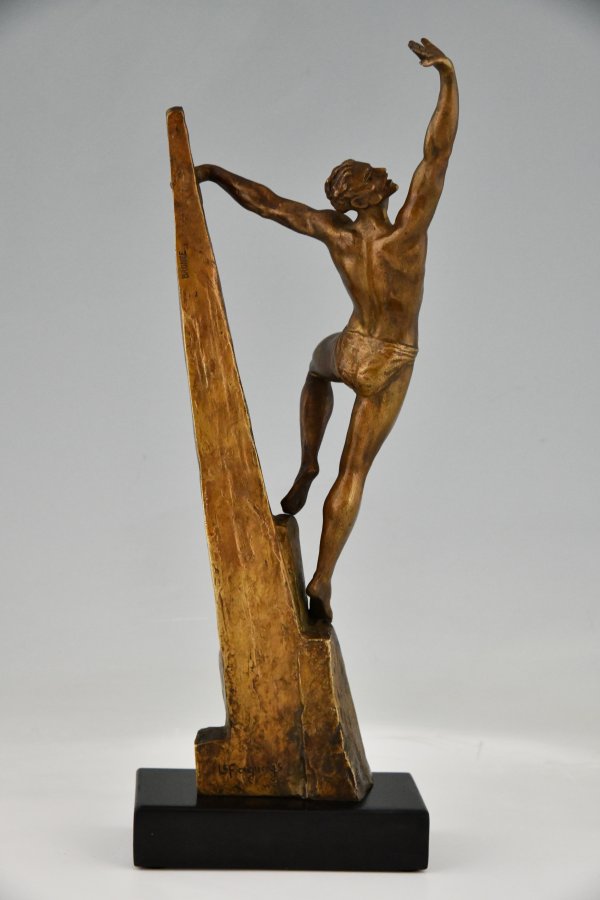 Art Deco bronzen sculptuur atletische man op een rots gesigneerd door Pierre Le Faguays.