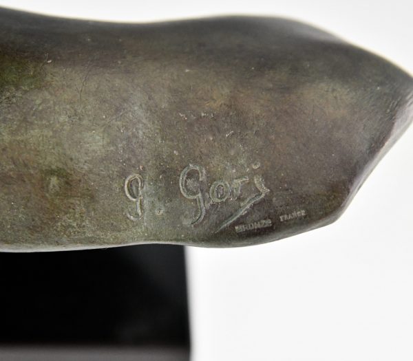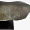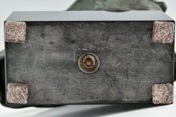 Het bronzen beeld heeft een groene patina en is gemonteerd op een Belgisch zwart marmeren sokkel. Frankrijk 1930.