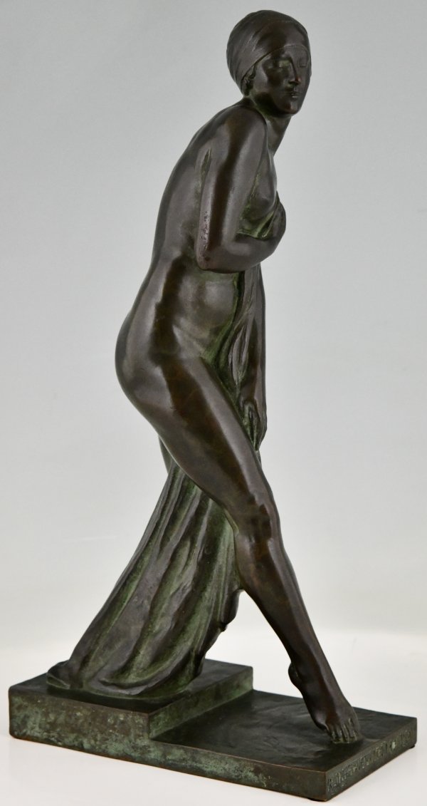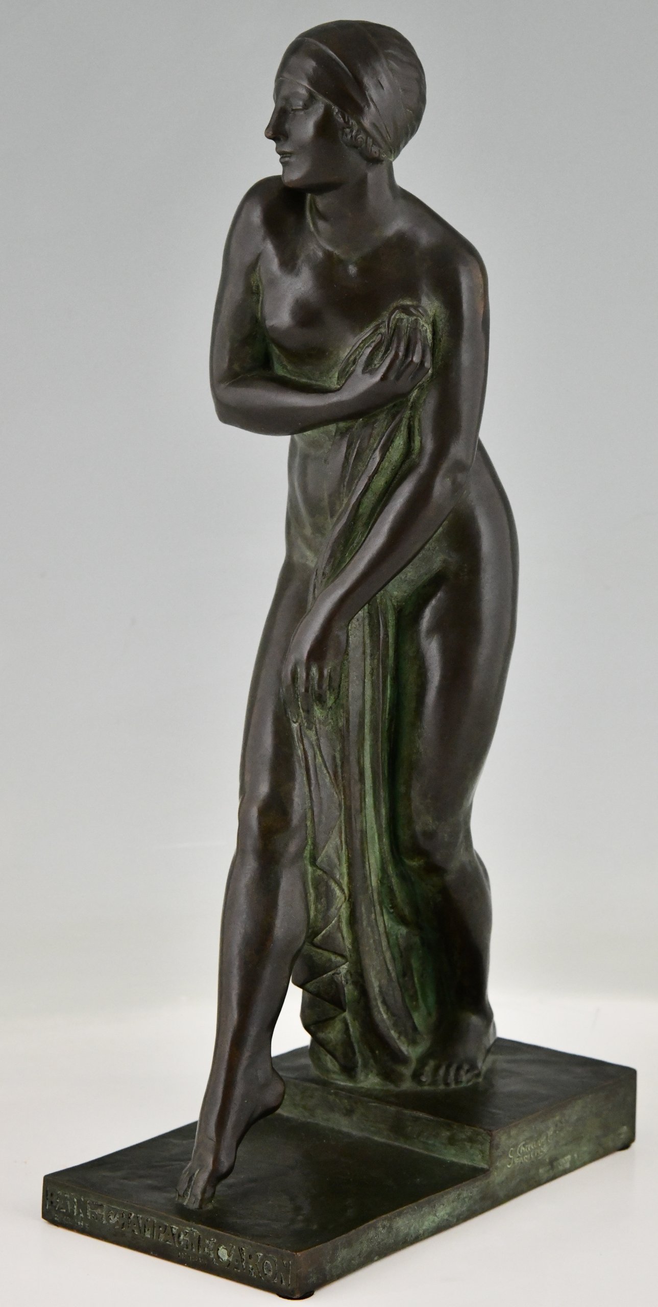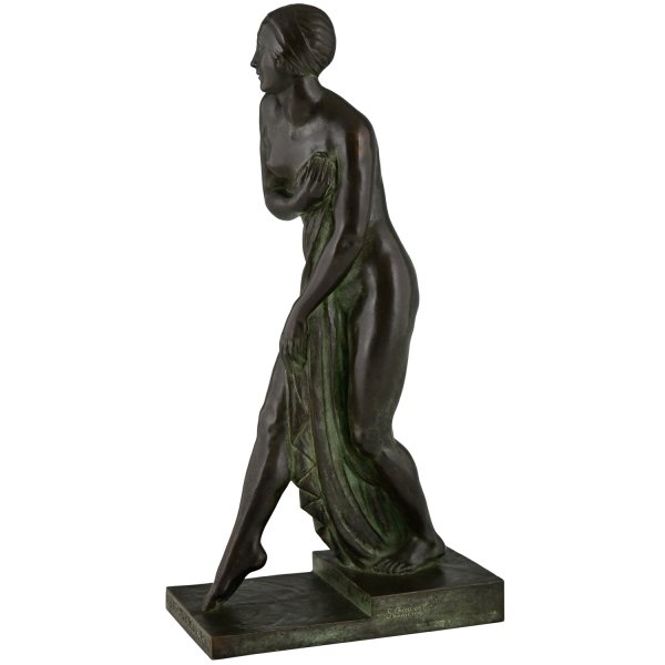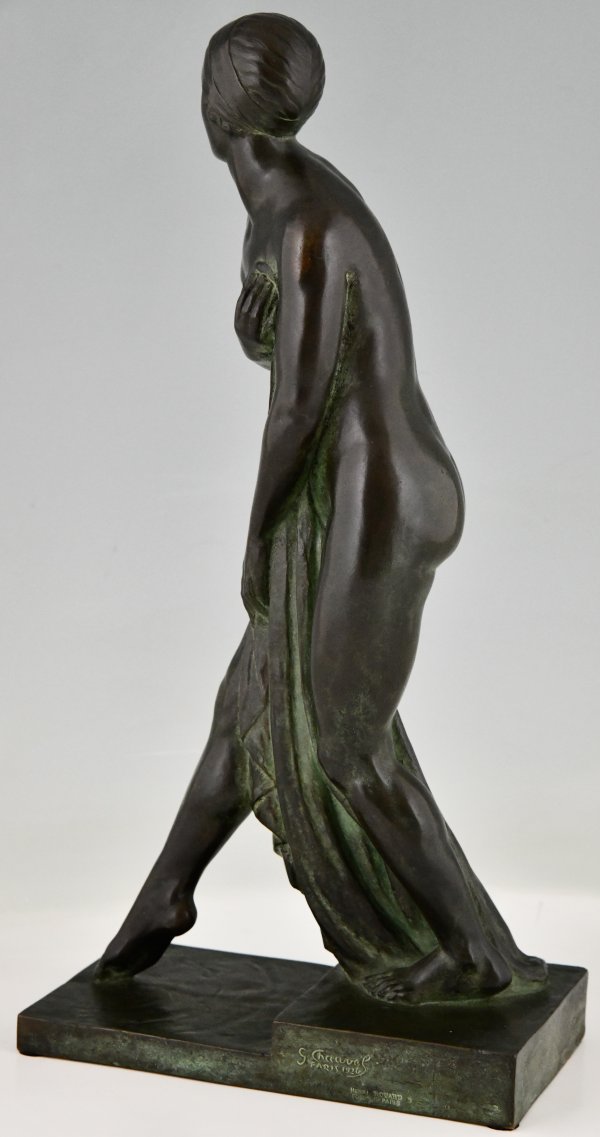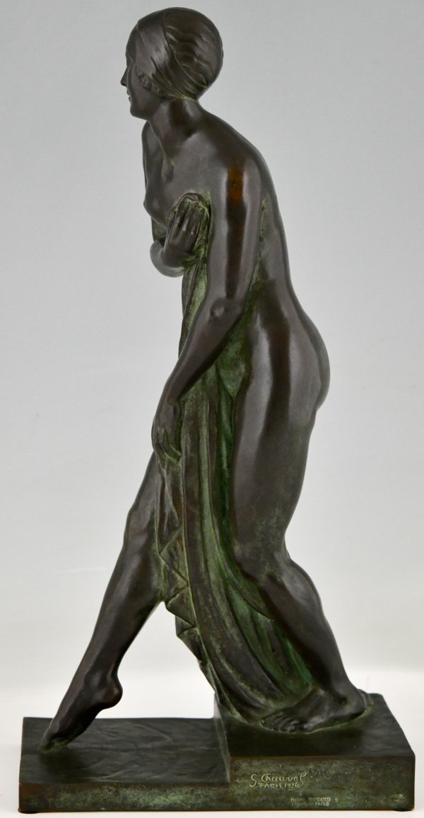 Art Deco bronzen sculptuur van een naakte baadster, Bain de Champagne Caron gesigneerd Georges Chauvel, 1926 met het gieterij stempel van Henri Rouard fondeur Paris.