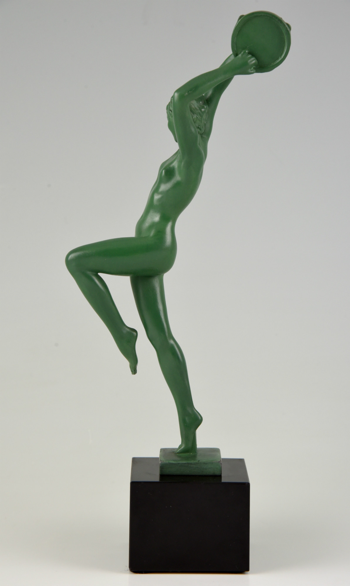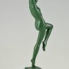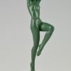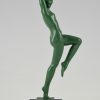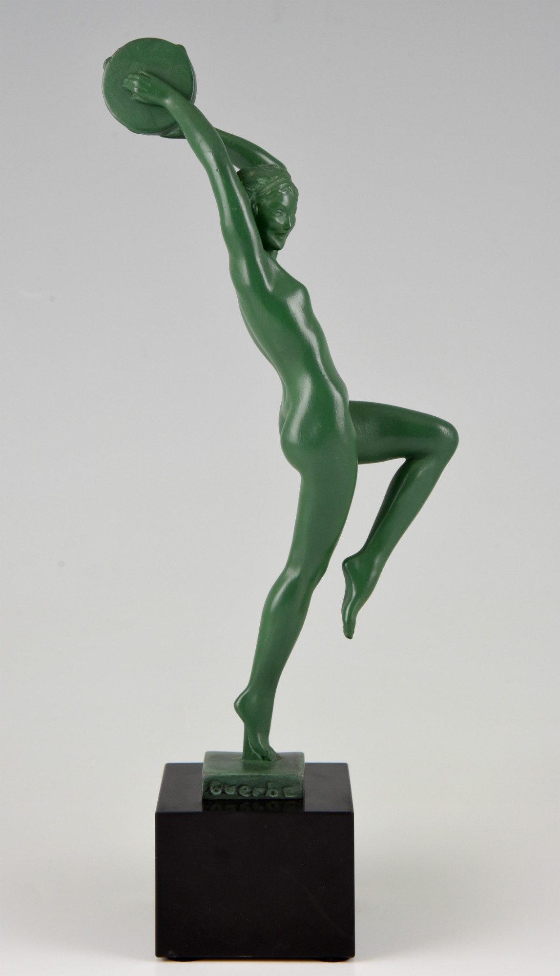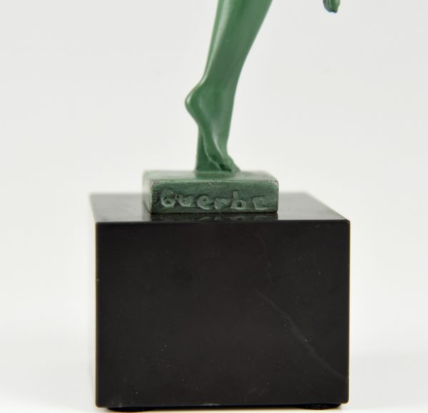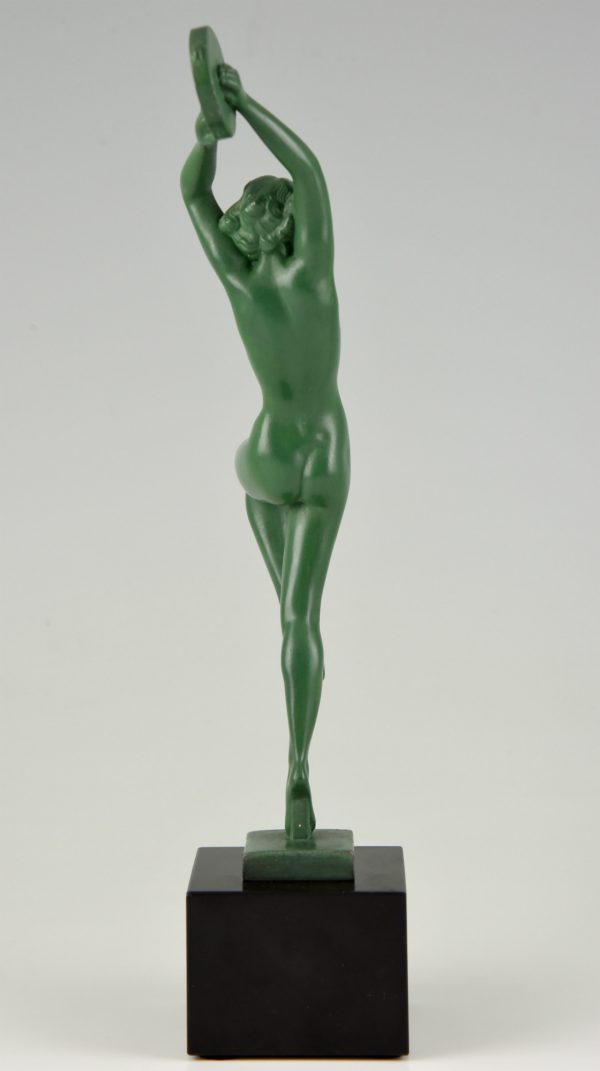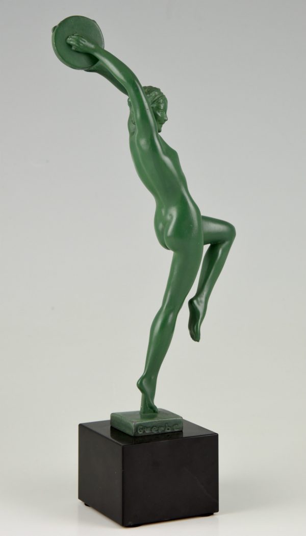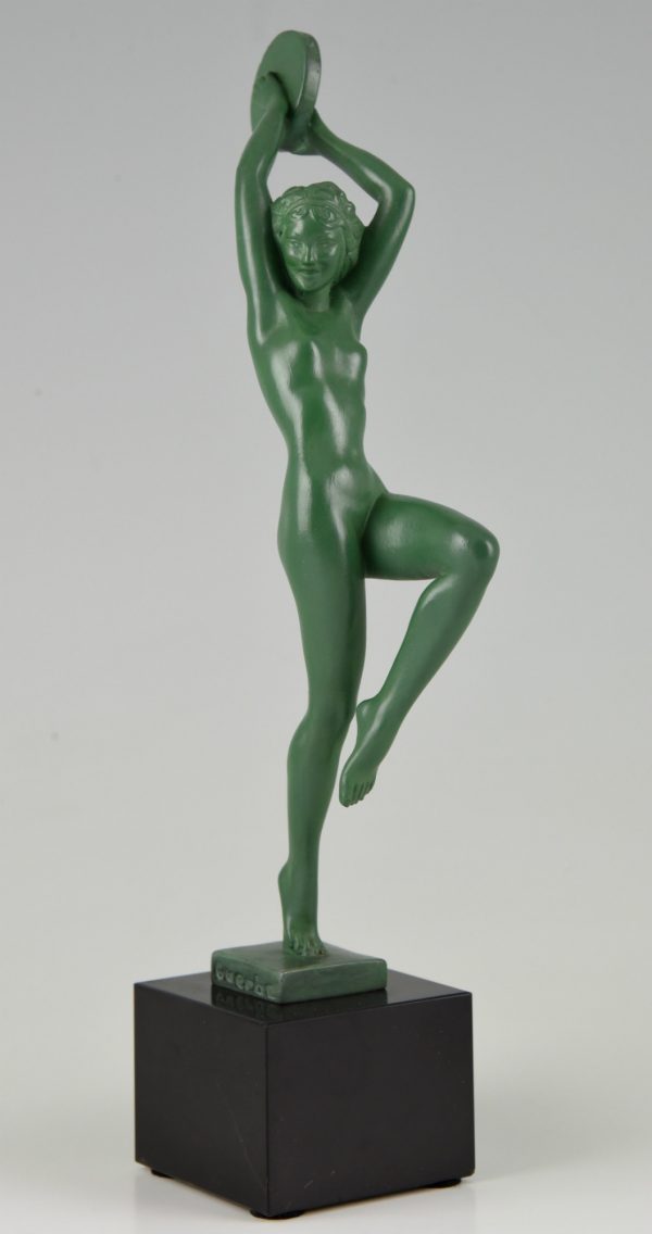 Elegant Art Deco sculpture of a dancing nude with tambourine by the French artist Guerbe on a black marble base.