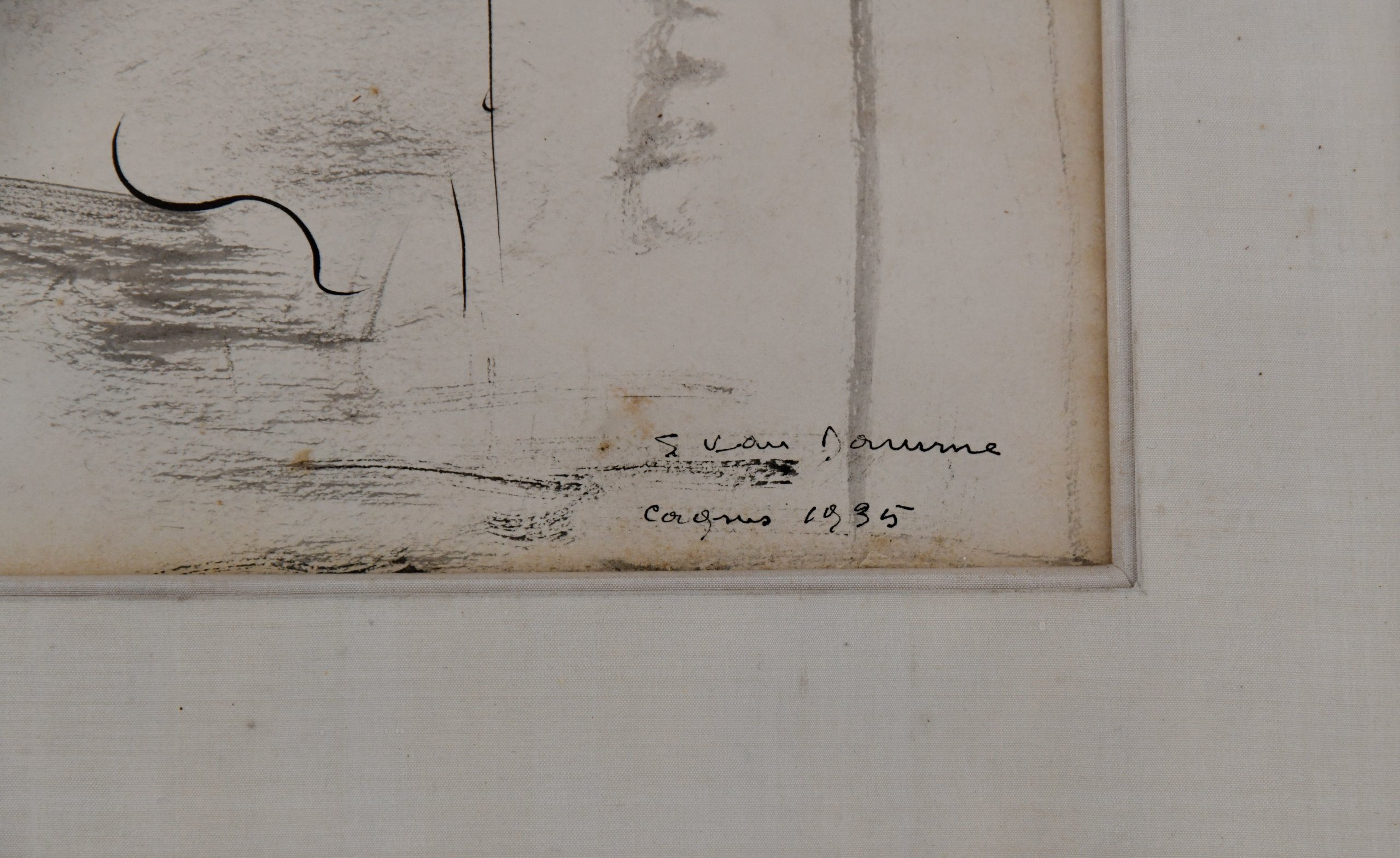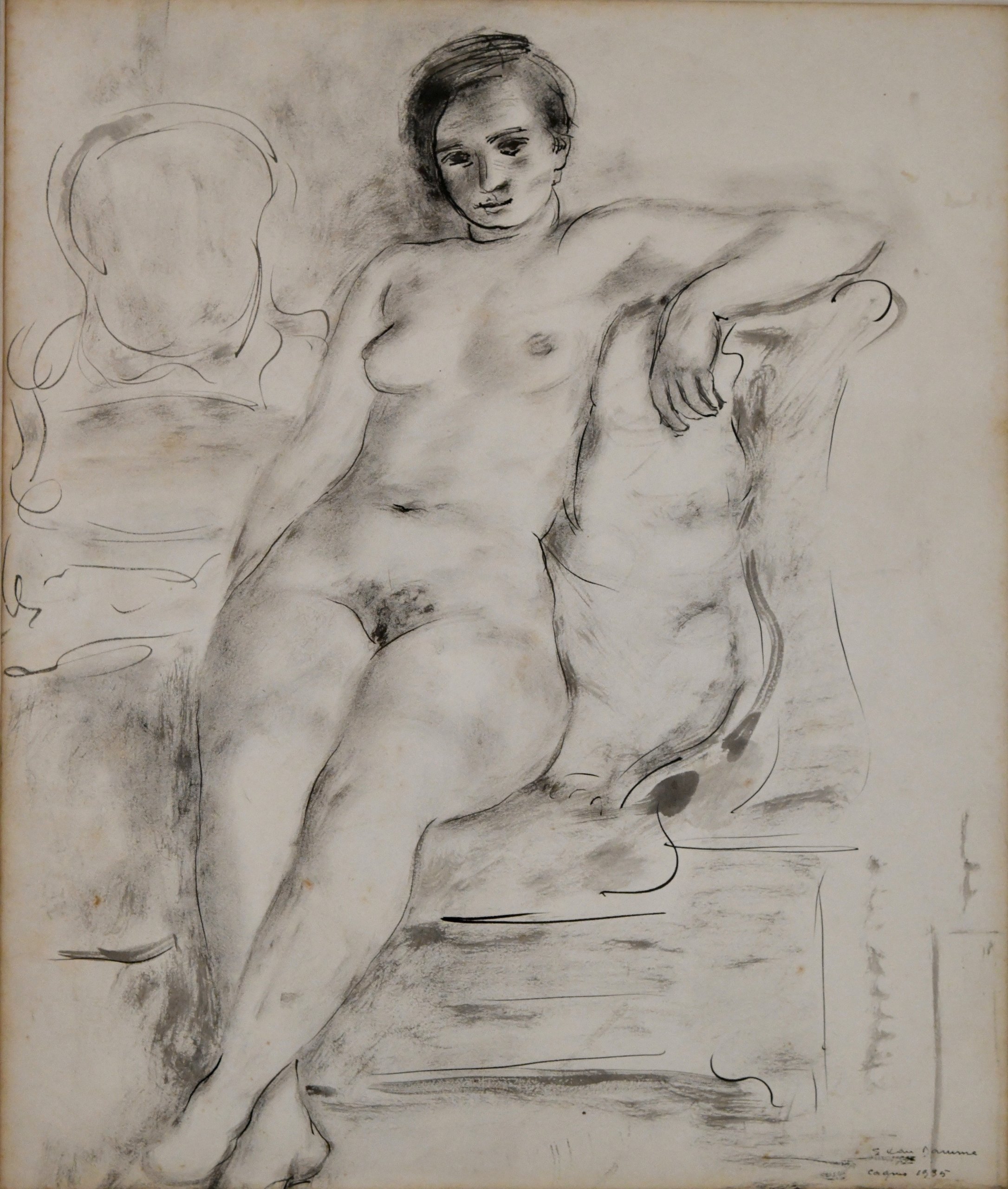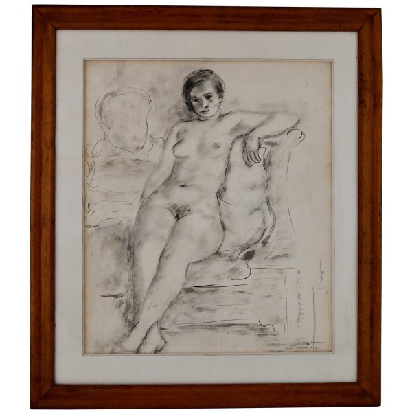 Art Deco inkttekening van een zittend naakt door Suzanne van Damme, gesigneerd en gedateerd 1935.