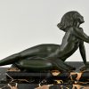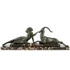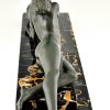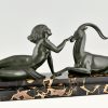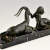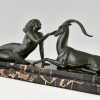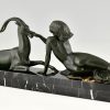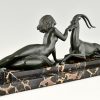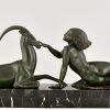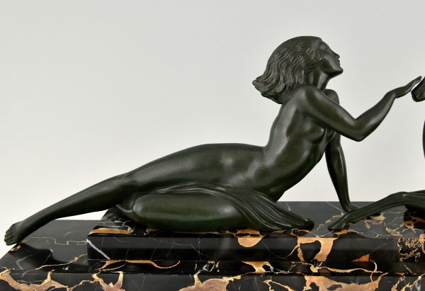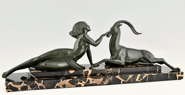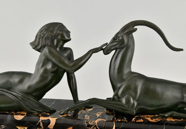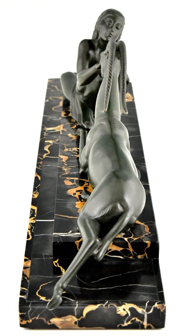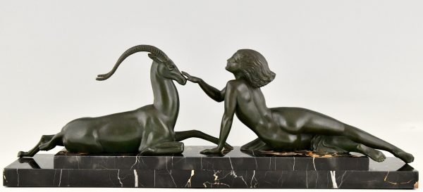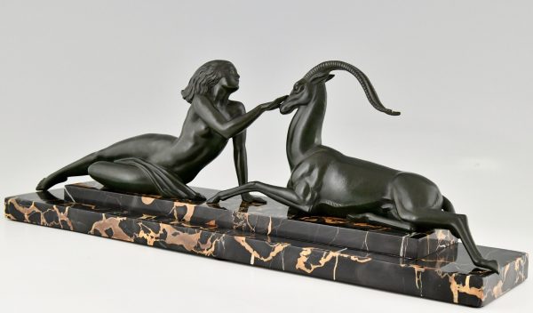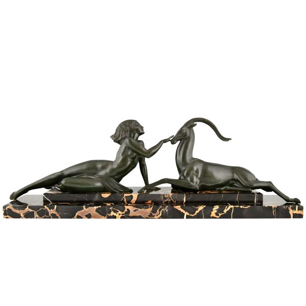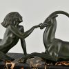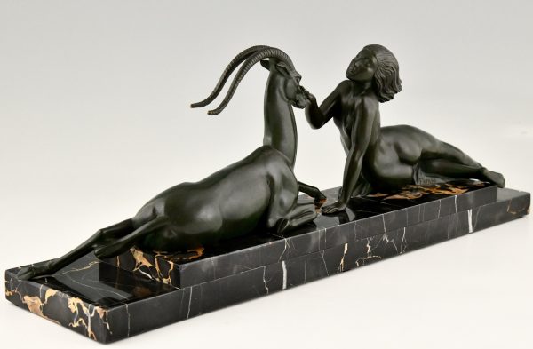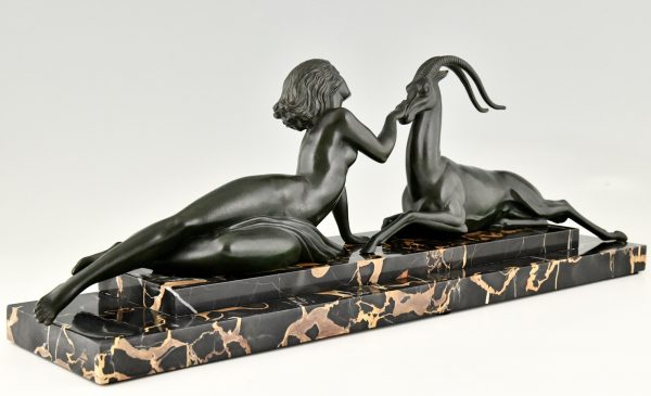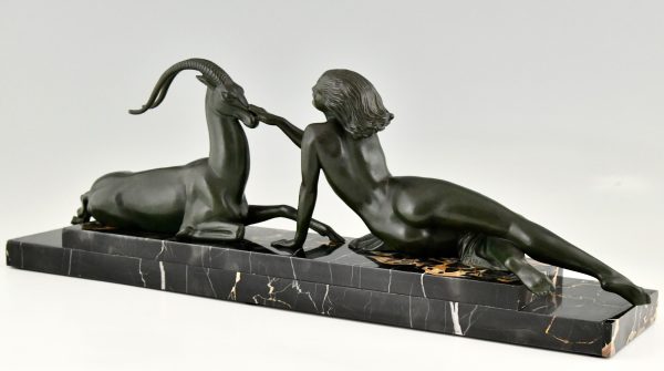 Seduction, elegant Art Deco sculpture of a nude lady with gazelle by Pierre Le Faguays for Max Le Verrier, signed Fayal, with foundry mark. Art metal with dark green patina on a Portor marble base. France 1930