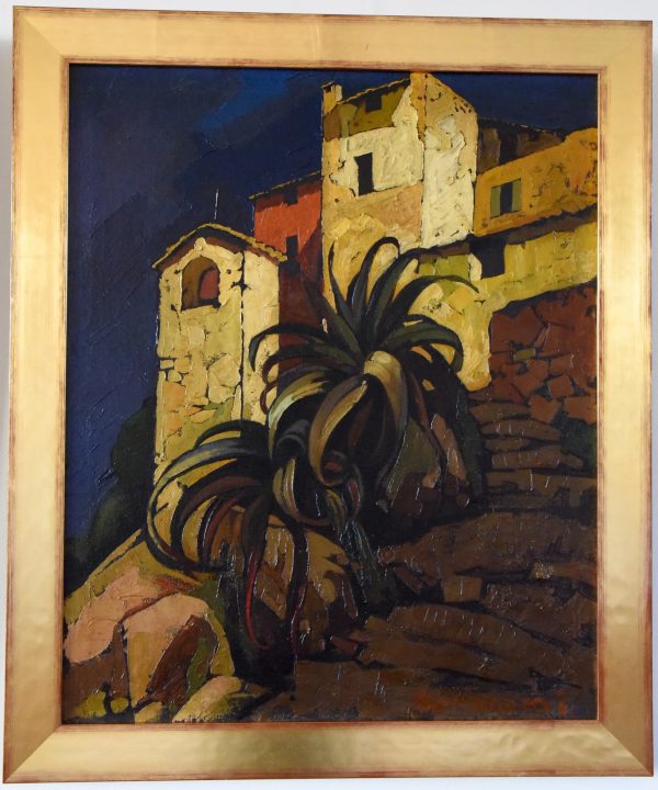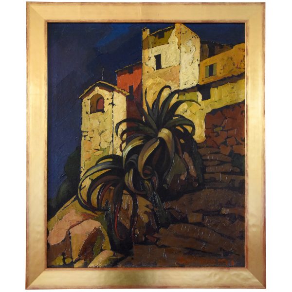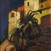 Beautiful Art Deco oil painting of a typical Italian village with palm trees by the artist Cesare Bonanomi, born in Piacenza, Italy in 1875.