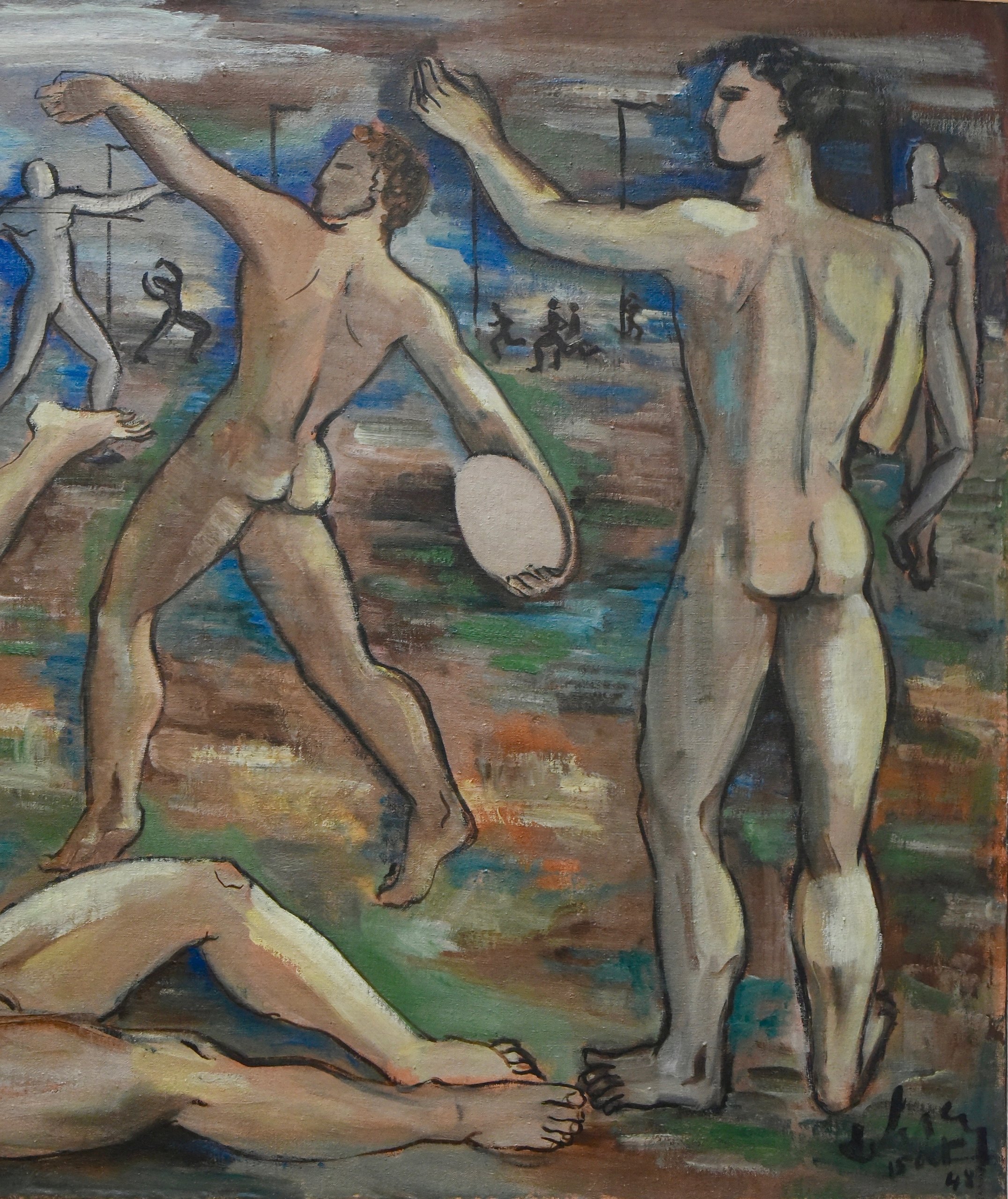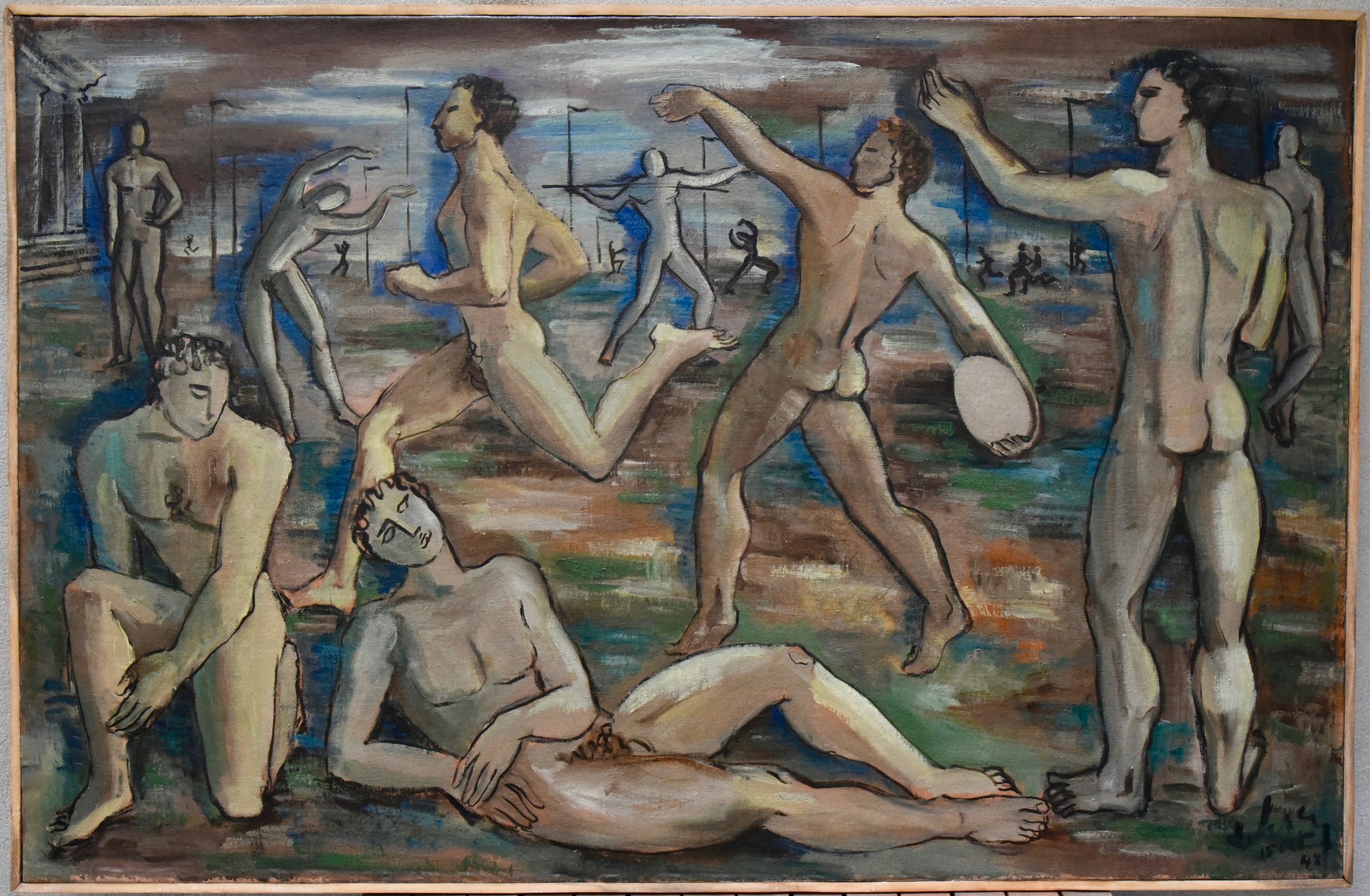 Art Deco schilderij naakte mannelijke atleten op Olympische Spelen.